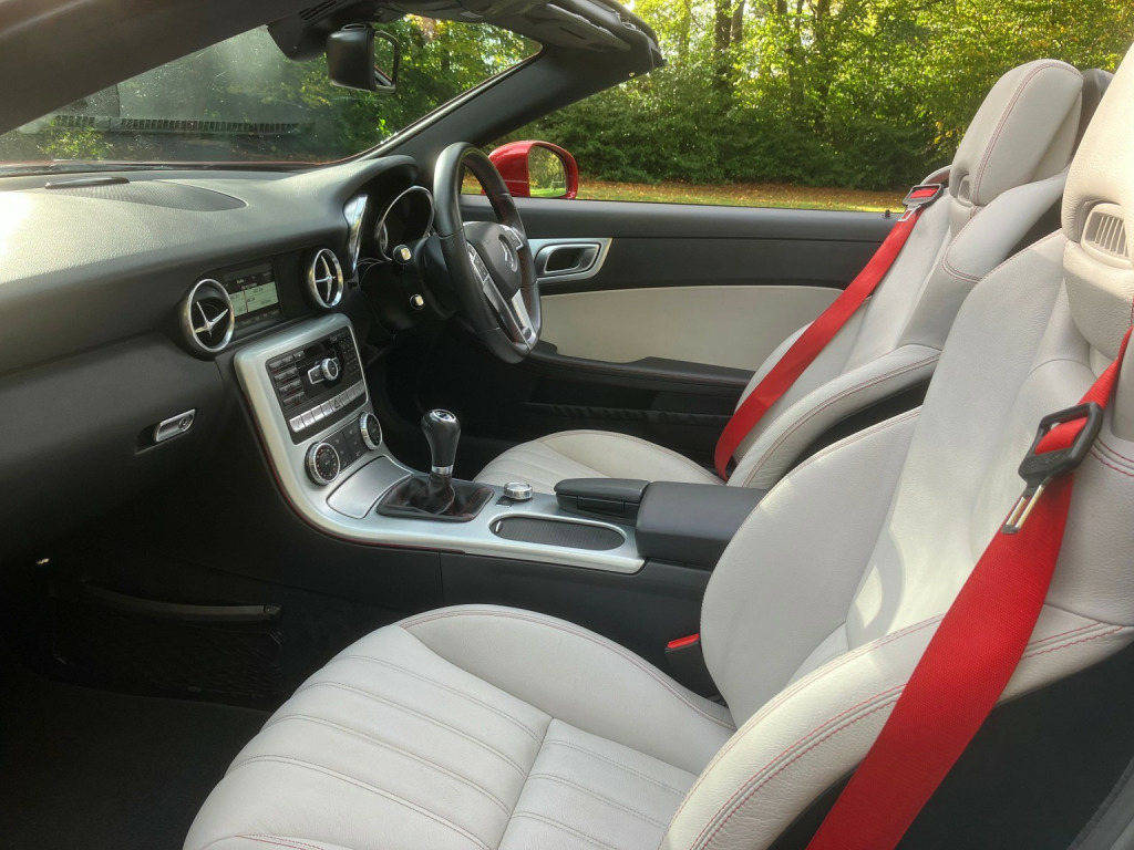 Hyacinth Red metallic with Alpaca Grey leather and Red stitching. Only 49000 mls from new with service history from Mercedes main dealers/independents. Excellent specification includes:, 6 spd manual transmission, AMG Sport package including AMG Bodystyling,AMG alloys,AMG suspension,Panoramic glass folding roof,Air scarf neck heating,Heated seats,Air conditioning,Cruise control,Parktronic,Navigation,Bluetooth,DAB radio,Multi CD and Electric folding mirrors. A very rare manual SLK in a fabulous colour combination!