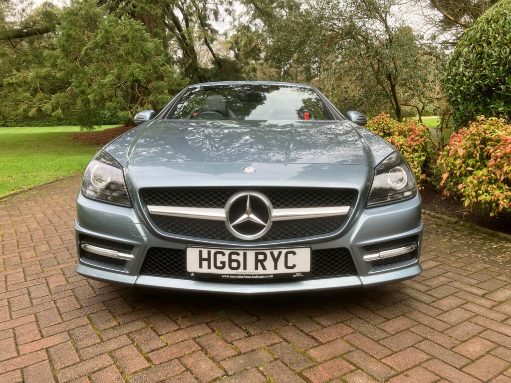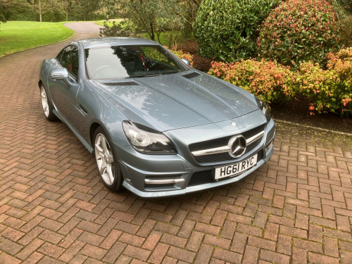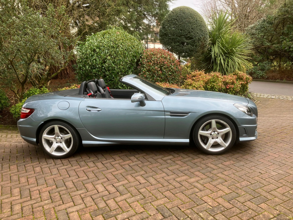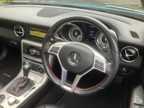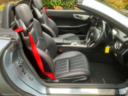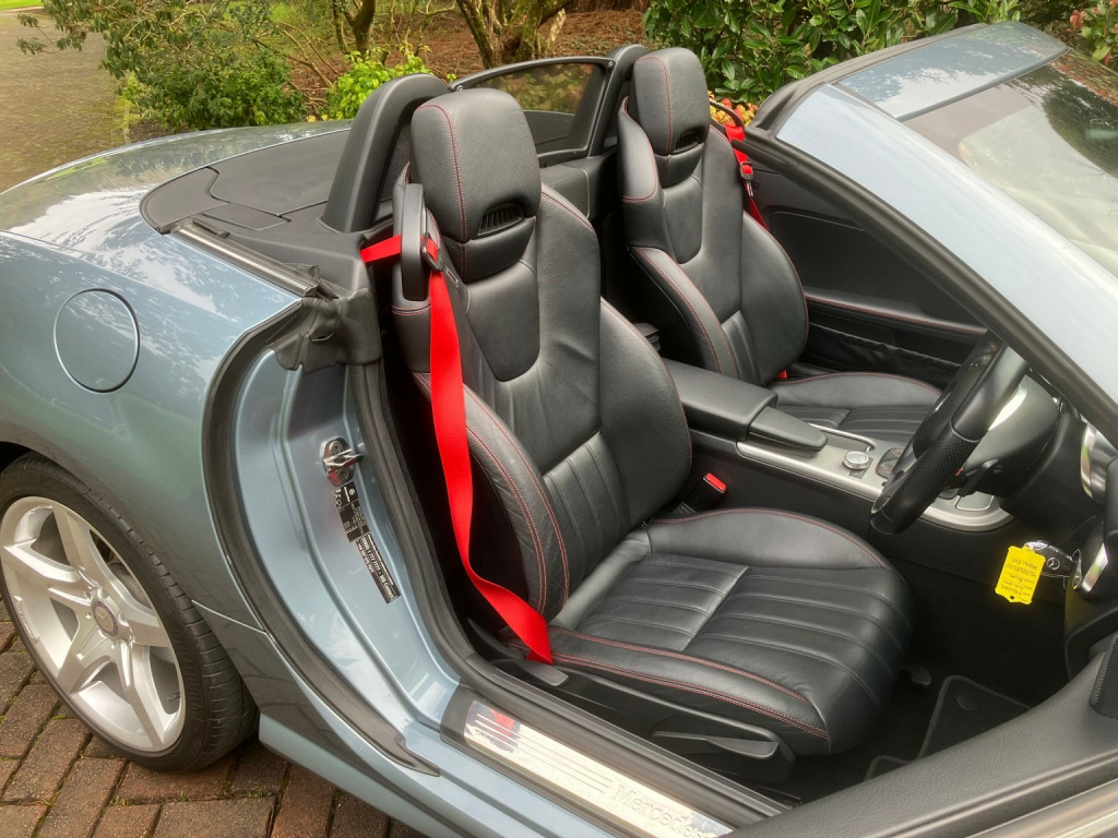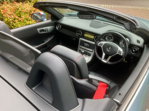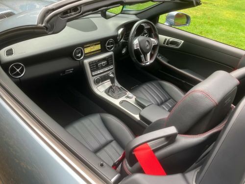 Galenite Blue metallic with Black leather and Red stitching. Only 22400 mls from new with a comprehensive service history from Mercedes main dealers/independents. Superb specification of this limited edition model includes:, Full AMG body styling,18in AMG alloys,Heated leather seats with Red stitching,Red seatbelts, Air Scarf neck heating,Comand Navigation,DAB Radio,Bluetooth,Air con,Cruise control,Electric mirrors and Wind deflector. An exceptional low mileage SLK that has undoubtably been cherished!