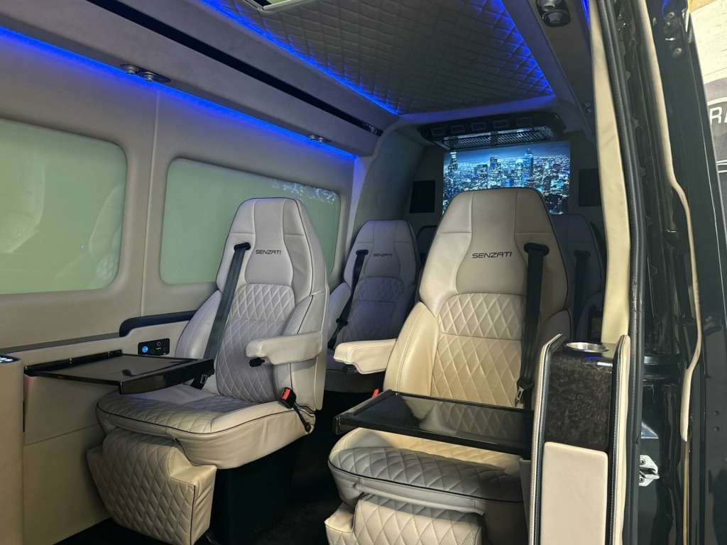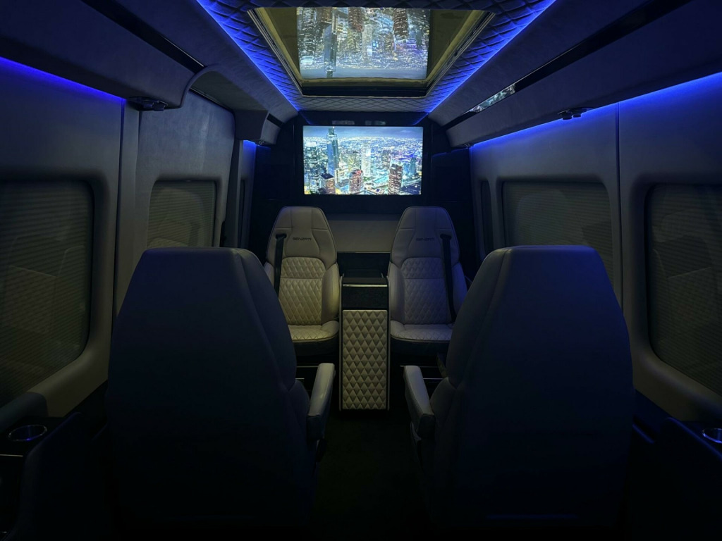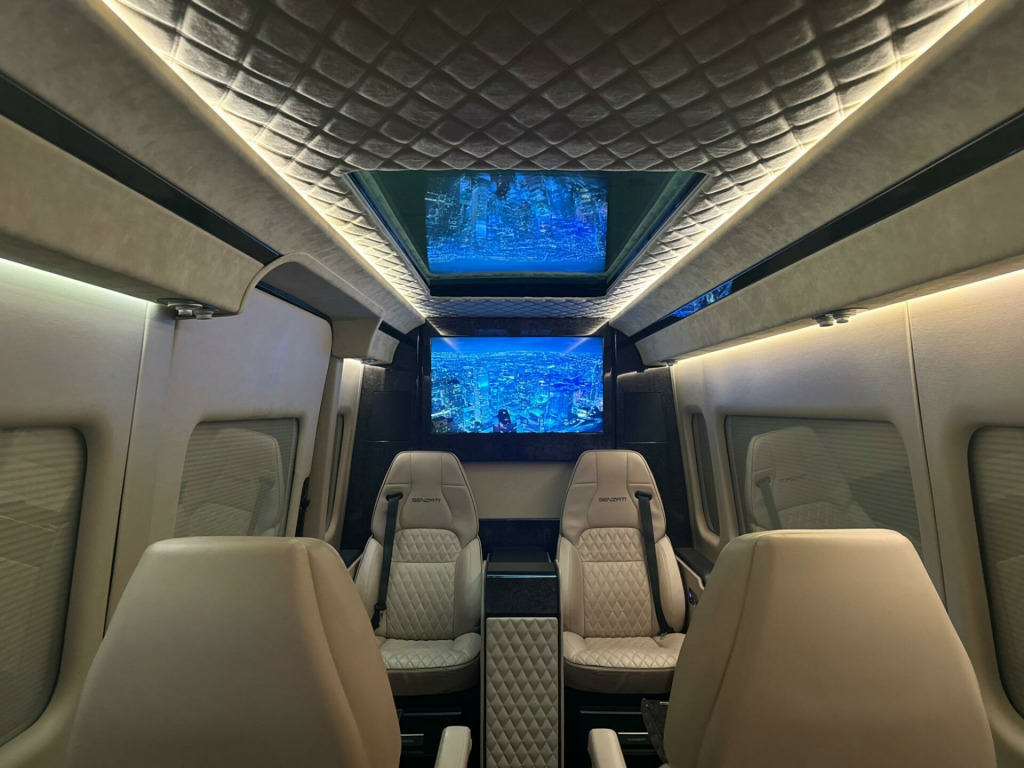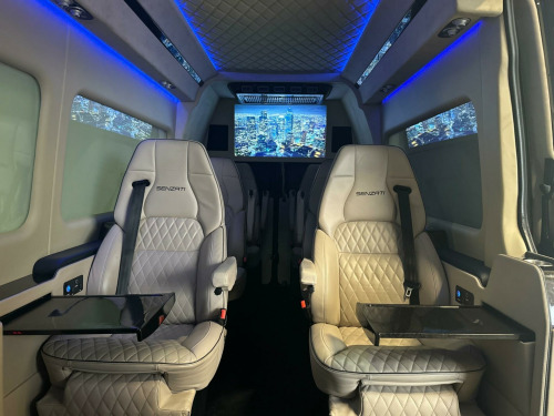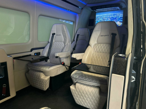 SENZATI JET SPRINTER. VIP 8 SEATER REAR CABIN.The Senzati Jet Sprinter is a luxury vehicle conversion of a Mercedes-Benz Sprinter, featuring custom specifications like high-end seating, a partition with electric TV,s, a panoramic sunroof, and integrated tech. Specifications include plush Nappa leather seating, which can be upgraded with massage, heating, cooling, and electric leg rests. Other features include a mobile office setup with fold-out tables, advanced entertainment systems like apple tv and multiple screens, and premium amenities such as a fridge, glasses cabinet, and Wi-Fi be driven in class. VIP. PLEASE CALL FOR FULL SPECIFICATION. HIGHEST SPEC SPRINTER JET CLASS ON THE MARKET.. WALK AROUND VIDEO AVAILABLE