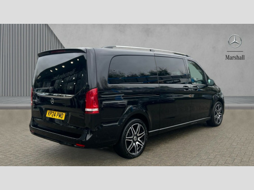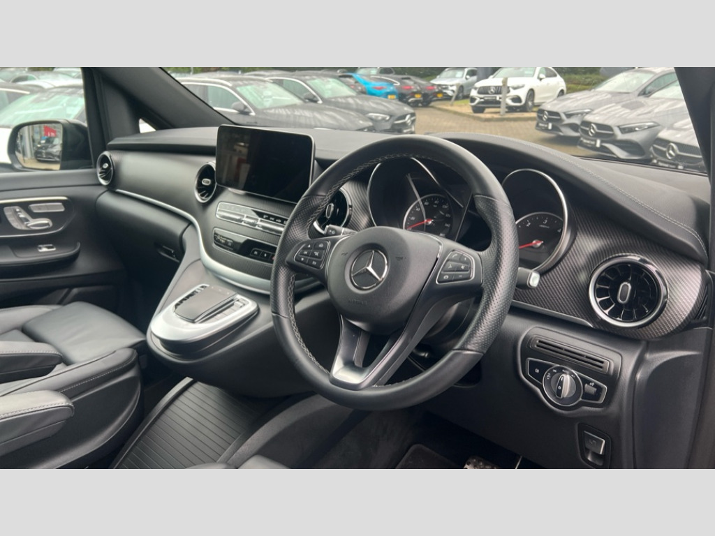 Mercedes-Benz V Class V300 d 237 AMG Line 5dr 9G-Tronic [Extra Long] Active parking assist, Agility select with a choice of driving modes (Comfort, ECO, Sport, Individual), Attention assist, Brake wear warning display, Cruise control with speedtronic variable speed limiter, Direct steer speed sensitive steering, Easy-pack tailgate - Powered opening/closing automatically, ECO start/stop function, Instrument cluster with 5.5 inch colour display trip computer, MBUX multimedia nav with 10.25" touchscreen, Hey Mercedes intelligent voice control, 2 USB-C ports and mobile connectivity for up to 15 devices, MBUX personalised vehicle profiles, MBUX touchpad, Mercedes me connect including emergency call system, accident recovery, breakdown and maintenance management, Outside temperature display, Service indicator (ASSYST), Side wind assist system, Status display for rear seat belts in instrument cluster, 25 litres large AdBlue tank, 9G TRONIC 9 speed automatic transmission, Agility control comfort suspension, Diesel particulate filter, Audio 20 CD with integrated media interface, DAB Digital radio, Integrated radio aerial, iPod/iPhone + Bluetooth interface with handsfree function, Two USB ports and one SD Card slot in centre console, Adaptive brake lights, AMG bodystyling front apron and rear roof spoiler, AMG bodystyling rear apron, AMG bodystyling side skirts, Anodised roof rails, Automated headlamp assist, Automatically dimming exterior driver's mirror, Black tinted rear windows, Body colour bumpers, Body colour door mirrors, Chrome pins diamond radiator grille with integrated stars, Chrome trim to front bumper, Electric folding door mirrors + auto dimming rear view mirror, Electric front windows, one touch / obstruction sensor, Electric sliding door in both side, Electric ventilation windows in passenger compartment, Heated windscreen washers, Illuminated front door sill panels with Mercedes-Benz lettering, LED intelligent light system including integral LED daytime running lamps, LED tail lamps/brake lamps and indicators, Logo projection, Metallic paint, Privacy glass, Rain sensing windscreen wipers, Rear wiper, Split tailgate in opening rear window with chrome handle, 12V socket in boot/load compartment and rear passenger compartment, 3 colours ambient lighting, 3 seat bench in 2nd row, 3 seat bench in 3rd row, 3 spoke nappa leather steering wheel, Adjustable front seat head restraints, ARTICO leather upper dashboard with contrast stitching, Carpet floor covering in passenger compartment, Comfort driver and front passenger seats including armrest, Driver + front passenger lumbar support, Electric air heater system - 1.2 kW output, Extended seat rails, Footwell lighting with reading light and illuminated handle in rear compartment, Height/reach adjustable steering column, Lockable glove compartment, Luxury centre console with retractable cover + two cup holder + 12V socket + multimedia box, Multifunction steering wheel with audio controls and onboard settings, Nappa leather upholstery, Rear head restraints, Seat occupancy sensor for front passenger seat, Single front passenger seat, Sports pedals in brushed stainless steel with rubber studs, Stowage nets behind individual seats, Sunvisors with illuminated vanity mirrors, Thermatic 3 zone automatic climate control, Three stage heated front seats, Seat comfort pack - V Class, Towing pack - V Class, Urban Guard protection pack - V Class, 3 point seatbelts on all seats, Active brake assist, Adaptive brake system with HOLD function and brake drying in the wet, Airbags - sidebag for driver and front passenger with combined thorax/pelvis bag, Airbags - windowbag for driver and front passenger, Anti-lock braking system (ABS), Electric parking brake, Electronic Stability Programme, Hill start assist, Perforated front brake discs and brake calipers with Mercedes-Benz lettering, Rear child proof door locks, Tyre pressure monitoring system, Warning triangle and first aid kit, Central locking with interior switch, Chrome surround in electric key, Carbon look trim, Chrome air vent surrounds, 19" AMG 7 twin spoke alloy wheels, Space saver spare wheel with jack, Summer tyres