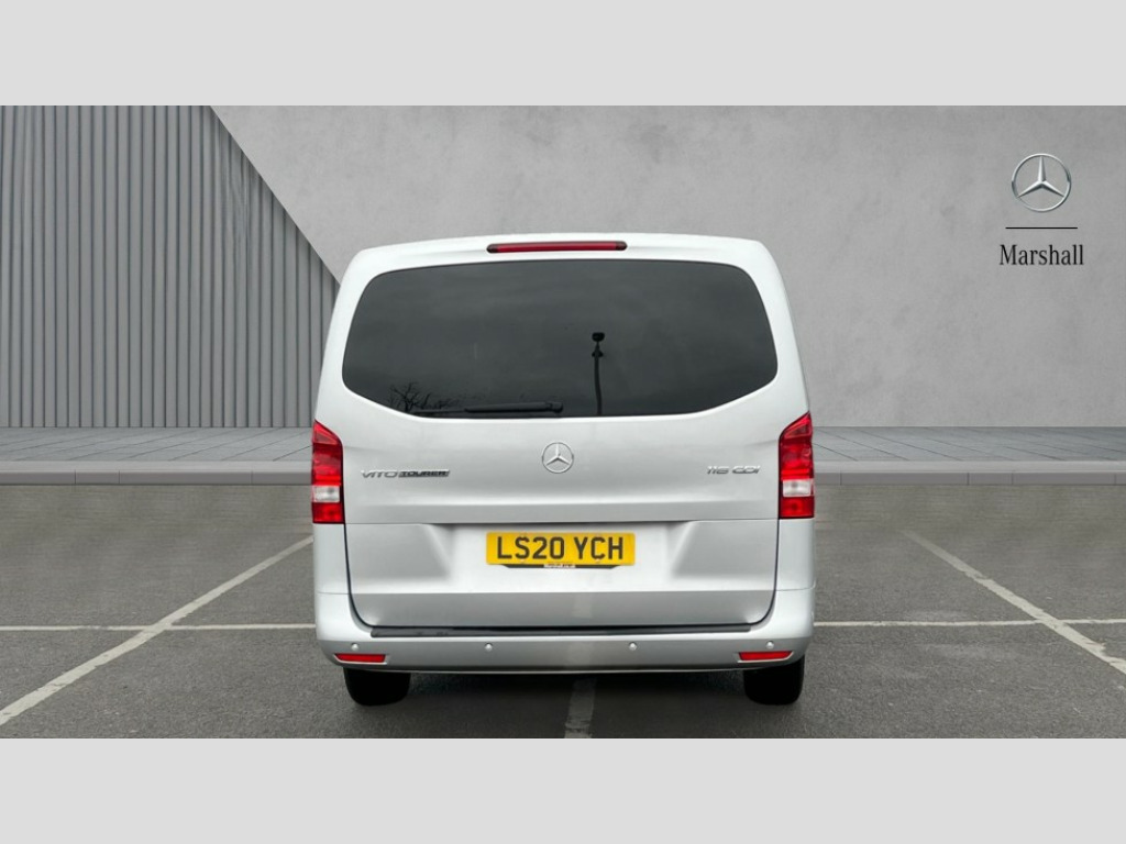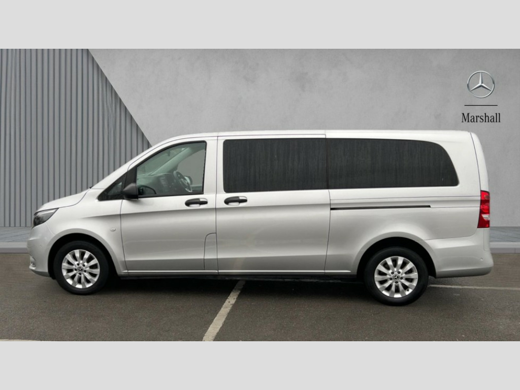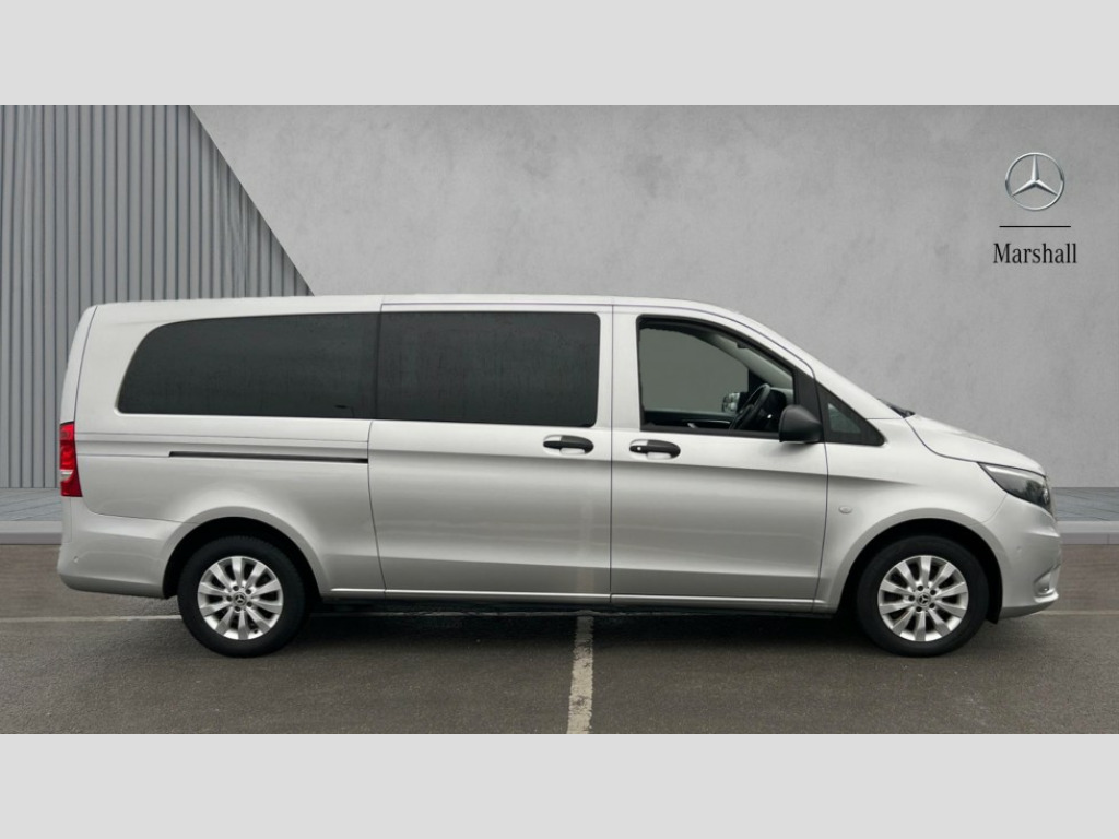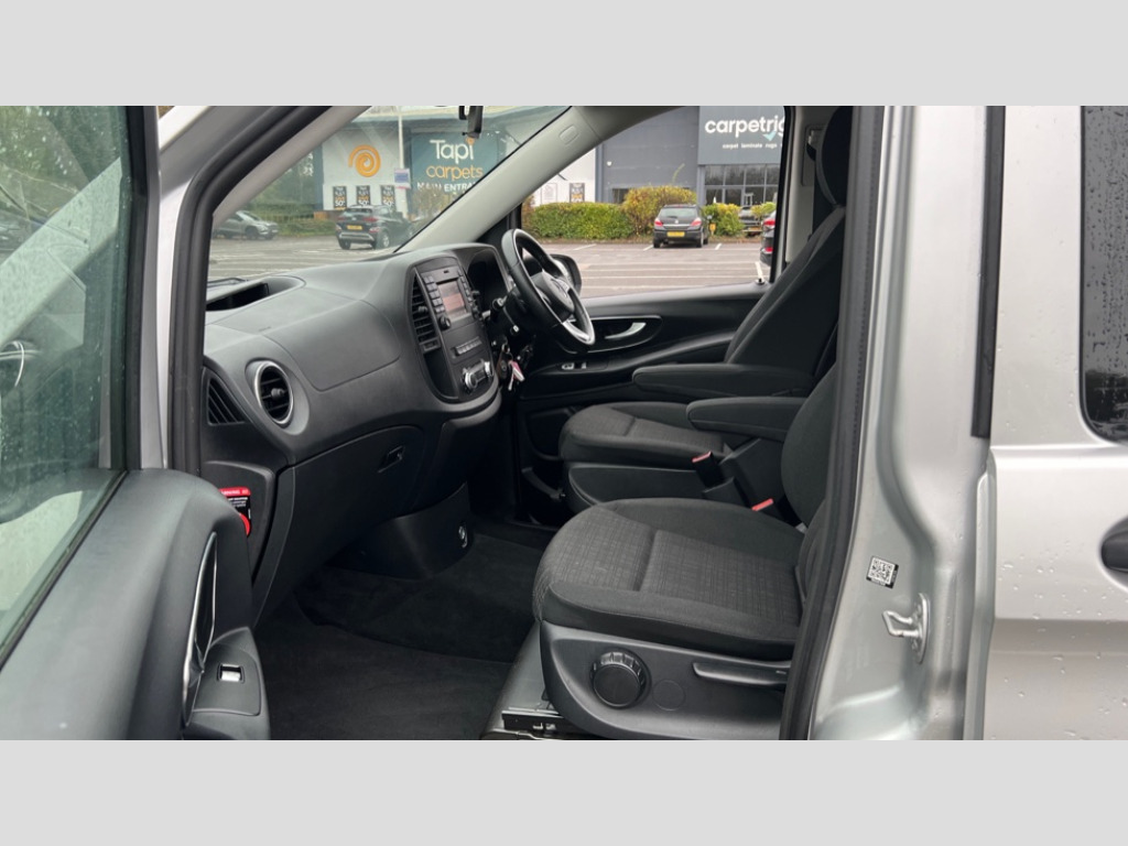 Thorax and Pelvis Sidebags Adjusted look instrument cluster, ASSYST - Servicing counter, Bluetooth hands free kit, Comfort overhead control panel, Cruise control with speed limiter, Digital clock, Headlight range control, Mercedes PRO connect module, PAS, Rescue assist, Rev counter, SD card slot, Seatbelt warning indicator, Tyre pressure monitor, Warning lights, Washer fluid level indicator, 2 speakers, Aux input socket, Bluetooth audio streaming, USB connection, Active retainer for sliding door, Adaptive brake lights, Body coloured door handles, Chrome radiator grille, Daytime running lights, Electric front windows, Fixed window in left side door, Fixed window in right side door, Green lightly tinted glass, Heat insulating glass, Rain sensor with headlight assistant and heat insulating glass, Third rear brake light, 8 way adjustable drivers seat, Ambient interior lighting, Armrests for rear outer side seats, Ashtray, Cab interior lighting, Centre console + drinks holder, Cigarette lighter, Comfort driver seat with armrest and 4 way adjustable headrests, Comfort rear passenger bench seat (1st row) with tilt/removable outer seat, Comfort rear passenger bench seat (2nd row) with tilt/removable outer seat, Double co-driver seat, Electrical auxiliary demister heating elements, Front carpets, Front door storage pockets, Front grab handles, Grab handles in rear, Heating/cooling air duct to passenger compartment, LED reading lights with illumination in rear grab handle, Load lashing rings, Locking glovebox, Moulded ergonomic facia, Multi function leather steering wheel, Multi-part full side wall panelling, Paddle shift, Quick release attachment system for seat rows, Reach and rake adjustable steering wheel, Rear carpets, Seat rail system, Sun visors with Illuminated vanity mirrors, Tool kit under drivers seat, Chrome interior appointments pack - Vito Tourer, 3 point seatbelts for all seats, Attention assist, Crosswind assist, Driver and passenger seatbelt tensioners, Driver and passenger window airbags, Driver thorax airbag, Driver's airbag, Front passenger airbag deactivation, Isofix child seat preparation, Passenger airbag, Central locking with remote control, Electronic immobiliser, ABS/ESP/ASR, Active brake assist, Comfort suspension, Diesel particulate filter, EBV and BAS, Hill start assist, Mechanical parking brake, Traction control, Uprated heavy duty battery - 95Ah, Spare wheel