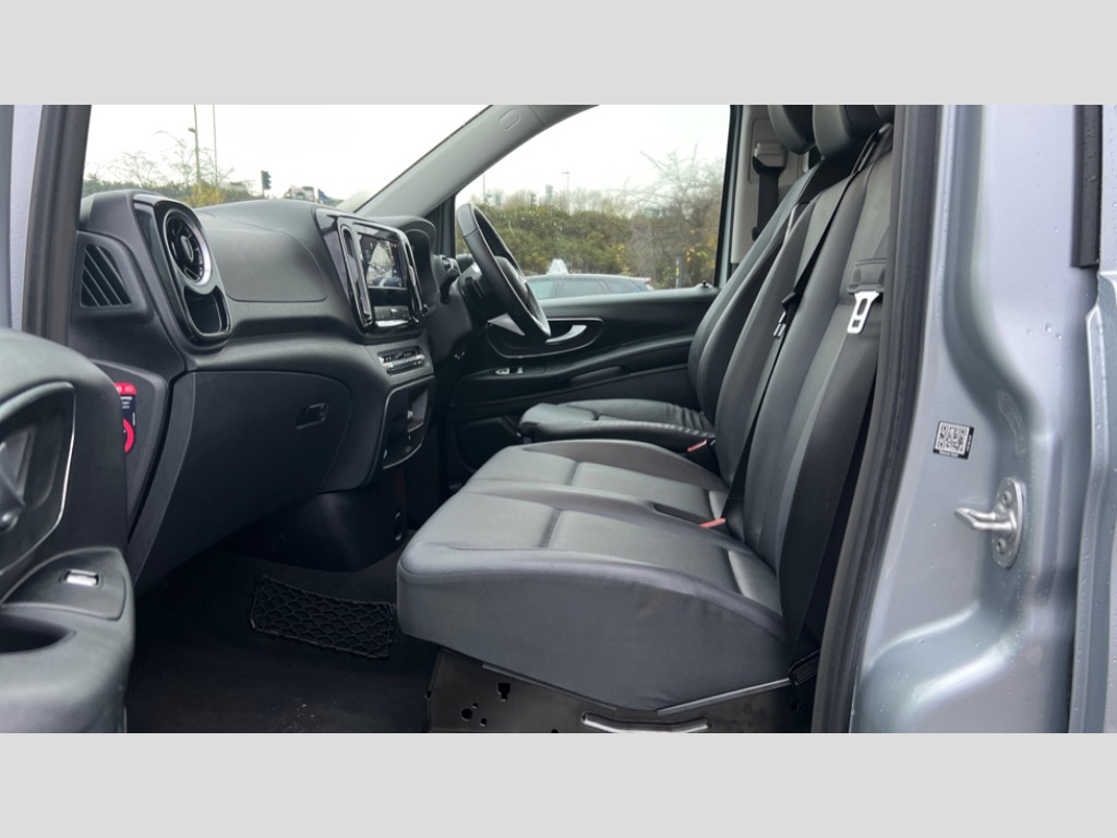 Cupholders Active lane keeping assist, Blind spot assist, Comfort overhead control panel, Cruise control with speed limiter, Modern instrument cluster with 5.5" TFT color display, PAS, Pre installation for navigation, Wireless tyre pressure monitoring, 2 way front loudspeakers, Digital radio (DAB), MBUX multimedia system with 10.25" touchscreen, Adaptive brake lights, Auto dimming interior rear view mirror, Chrome radiator grille, Colour coded front and rear bumpers, Daytime running lights, Electrically heated and adjustable wing mirrors, Exit lamps, Front fog lights, Headlight assistant, Heat insulating glass, Multibeam LED with highbeam assist plus, Rear barn style doors with 180 degree opening, Third rear brake light, Twin side loading doors, Weld nuts, sidewall for conversions, Ashtray, Cigarette lighter, Comfort driver's seat, Driver's seat lumbar support, Electrical component for trailer socket, Front door storage pockets, Front footwell lights, Full length partition, Grab handles for drivers and co-driver doors, Height and rake adjustable steering wheel, Illuminated vanity mirrors with sunvisors, Interior ambient lighting, Leather steering wheel, LED light strip in load compartment, Locking glove compartment, Multifunctional steering wheel, Ventilation nozzles, Wood load flooring, Anti theft protection pack - Vito, Chrome interior appointment pack - Vito, Mirror pack - Vito, Parking package with reversing camera - Vito, Smartphone integration package - Vito/Vito Tourer, 3 point seatbelts for all seats, Accident recovery and breakdown management, Attention assist, Co-driver airbag, Crosswind assist, Driver's airbag, Mercedes-Benz emergency call system, Central locking with remote control, Immobiliser, 24 litre larger AdBlue tanks, 70 litre fuel tank, 9G tronic automatic gearbox, ABS/ESP/ASR, Active brake assist, Diesel particulate filter, EBV and BAS, Hill start assist, Mechanical parking brake, Traction control