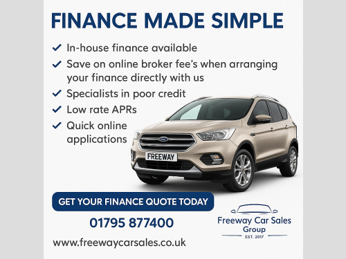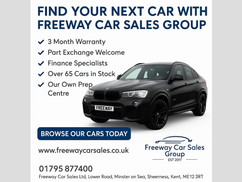 Apple Car Play, Reverse Camera, DAB, Cruise Control, Bluetooth, Over 65 cars in stock, Please Go To Our Website For A List Of All Of Our Stock, Poor credit? we can help, competitive finance packages arranged in house, low rates available, apply on our website for a no obligation quote. Upgrade to a 1 year gold warranty and an advisory free MOT for only £549 or spread the cost over 4 months for £137.25 a month with no credit checks or interest for complete piece of mind. Only 12 minutes from J5 M2, 18 mins J7 M20, 39 mins from Dartford Crossing. We have our own service centre that not only prepares your car before purchase but offers discounted servicing and repairs throughout your ownership. Walk around videos available on request. Cars come with a minimum 6 month MOT, service if due within the next 5,000 miles. Extended warranties, service plans and advisory free MOT guarantees also available. Please go to www.freewaycarsales.co.uk to view all our current stock. Arranging your own finance through a 3rd party company incurs a charge of £395.