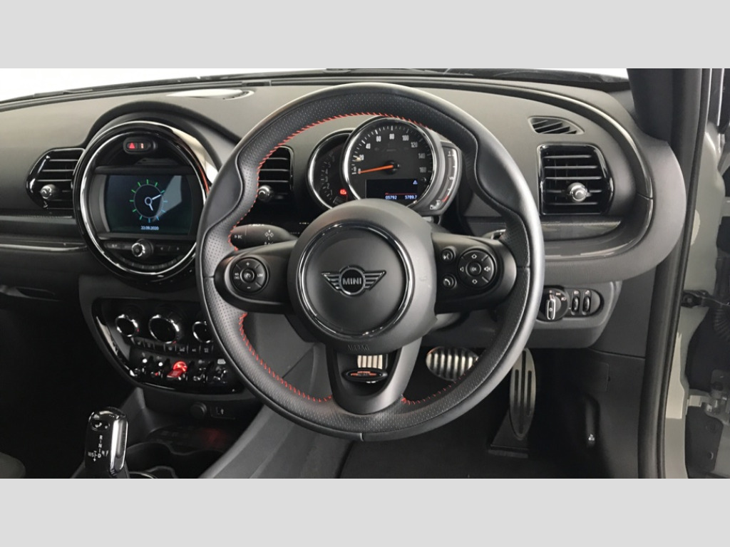 MINI Clubman 1.5 Cooper Sport 6dr Auto Active Guard incl speed limiting and lane departure functions with auto steering, and front collision warning with brake intervention, Automatic start/stop function with brake energy recuperation, Compatible mobile phone bluetooth with audio streaming, Electro-mechanical speed dependant steering assistance, Instrument cluster, Mini E-call, MINI TeleServices, On board computer, Rear parking distance control, Double Vanos system, Fully variable valve control, High precision injection, Performance Control, Steptronic transmission with double clutch, FM tuner and DAB digital radio, Body colour fuel filler cap, Door sill strips, Dynamic brake lights, Electric windows, Heated rear window, Heated windscreen washer jets, John Cooper Works - aerodynamic kit (front and rear apron, spoiler), front and rear sport bumpers and part-painted side sills with door sill finishers, John Cooper Works rear spoiler, LED rear light with union jack design, Left exhaust tailpipe with chrome finisher, Model logo, Model logo on rear doors, Radiator grille, Rain sensor with auto headlights, Rear fog lights, Rear window wiper, Side scuttle panel with integrated indicator, Split rear doors, Sun/heat protection glass, White indicator lenses, 12V Accessory socket in centre console, 360L luggage compartment capacity, 4 lashing eyes in luggage compartment, 60/40 split folding rear seat, Anthracite headlining with grab handles and clothes hooks, Chrome interior highlights, Cupholders, English handbook, Glove compartment, Height and length steering column adjustment, Interior lighting with 12 basic colours selectable via toggle switch in roof, Isofix rear child seat preparation, John Cooper Works perforated leather steering wheel with contrast stitching in chilli red and John Cooper Works logo, John Cooper Works sports seat with integrated headrest, adjustable thigh support and John Cooper Works logo, Leather gearshift lever and handbrake gaiters, LED reading lights, vanity mirror lights, front foot well light and spotlight on front seats, Manual air conditioning, Multifunction steering wheel, Storage compartments in doors, Sunvisors with vanity mirrors, Toolkit, Excitement pack - Clubman, Navigation pack - Clubman, 2 tone horn, 3 point seatbelts on all seats, 6 Airbags - front, side, head and seat belt tensioners, Anti-lock braking system (ABS), DSC - Dynamic Stability Control, Electronic handbrake, Front and rear disc brakes, Tyre pressure monitoring system, Alarm system with tilt sensor, monitoring doors, bonnet interior and tailgate, Auto drive away locking, Deadlocking function, Electronic vehicle immobiliser, Locking wheel bolts, Start/stop toggle with keyless go, 18" John Cooper Works grip spoke alloy wheels with run flat tyres
