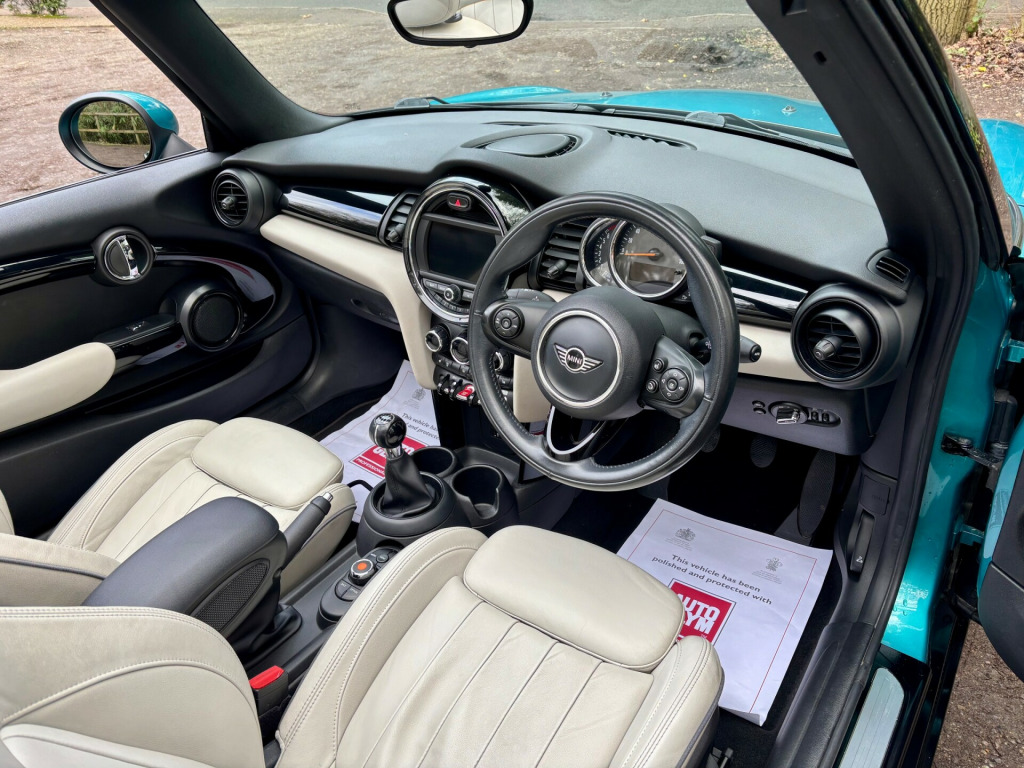We are pleased to offer this stunning, Mini Cooper 1.5 convertible. It is finished in metallic Carribean - aqua complemented with satellite - grey leather upholstery. This vehicle is supplied with documented service history, MOT until 29/06/2026 and two keys. We offer a standard 6 month warranty which can be upgraded to a 24 month comprehensive warranty for only £495+VAT. Specification includes: Heated front sports seats, cruise control with brake function, rear parking sensors, air conditioning, bluetooth phone preparation, Mini excitement package, electric folding roof, electric windows, remote central door locking, front armrest, isofix system, light package, LED fog lights, chilli pack, LED headlights, DAB radio, sports leather steering wheel, 6 speed manual transmission, 17'' pedal spoke alloy wheels, multi function steering wheel. Eco stop/start system. HPI cleared. Euro 6 technology. ULEZ COMPLIANT. NO ADDITIONAL ADMIN FEES. Part exchange welcome. Please read our 5 star Autotrader reviews. WE OPERATE BY APPOINTMENT ONLY. For further information or to arrange an appointment please call us on 07884367167.