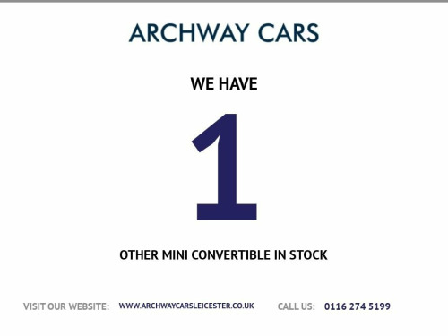 Wow! We are excited to offer for sale this stunning, two owner, low mileage Mini One 1.6 convertible in the best colour! We have recently taken this car in part exchange and the only reason the previous keeper was selling was because of her growing family and the need for a larger car. It is supplied with 12 months MOT with no advisories, 2 x keys and full and comprehensive service history. Being the Mini One it is one of the cheapest Mini's to insure. Guaranteed first to see will buy! It It also comes with a 3 months/3,000 miles warranty. We welcome AA or RAC inspections and also part exchanges, call us for a price on your vehicle, we give very fair prices. If you would like to arrange a test drive or a live video, please contact Tracey on 0116274 5199 and she will be more than happy to assist you with your requirements. Delivery can be arranged. *** CHECK OUT OUR REVIEWS AND BUY WITH ADDED CONFIDENCE*** Please check out our website, www.archwaycarsleicester.co.uk for other Mini's which we have in stock. 15in Steel Wheels, 3rd Brake Light, 6 Speakers System, ASC+T - Automatic Stability Control and , Air Conditioning - Manual, Airbags - Driver, Airbags - Front Passenger, Airbags - Front Passenger with Deactivat, Airbags - Head, Anti-Lock Braking System - ABS, Automatic Door Window Lowering by Approx, Aux-In Connection, Basic Bluetooth Function with USB Audio, Body Coloured Fuel Filler Cap in Rear Ri, Brake Assist, Brake Force Display, Brake Pad Wear Indicator, CBC - Cornering Brake Control, Car Jack, Central Locking - Remote, Child Seat ISOFIX Attachment, Cooled Glovebox, Crash Sensor - Fuel Cut-Off, Crash Sensor - Hazard Warning Flashers a, Crash Sensor - Unlocking Doors, Cupholders - Front