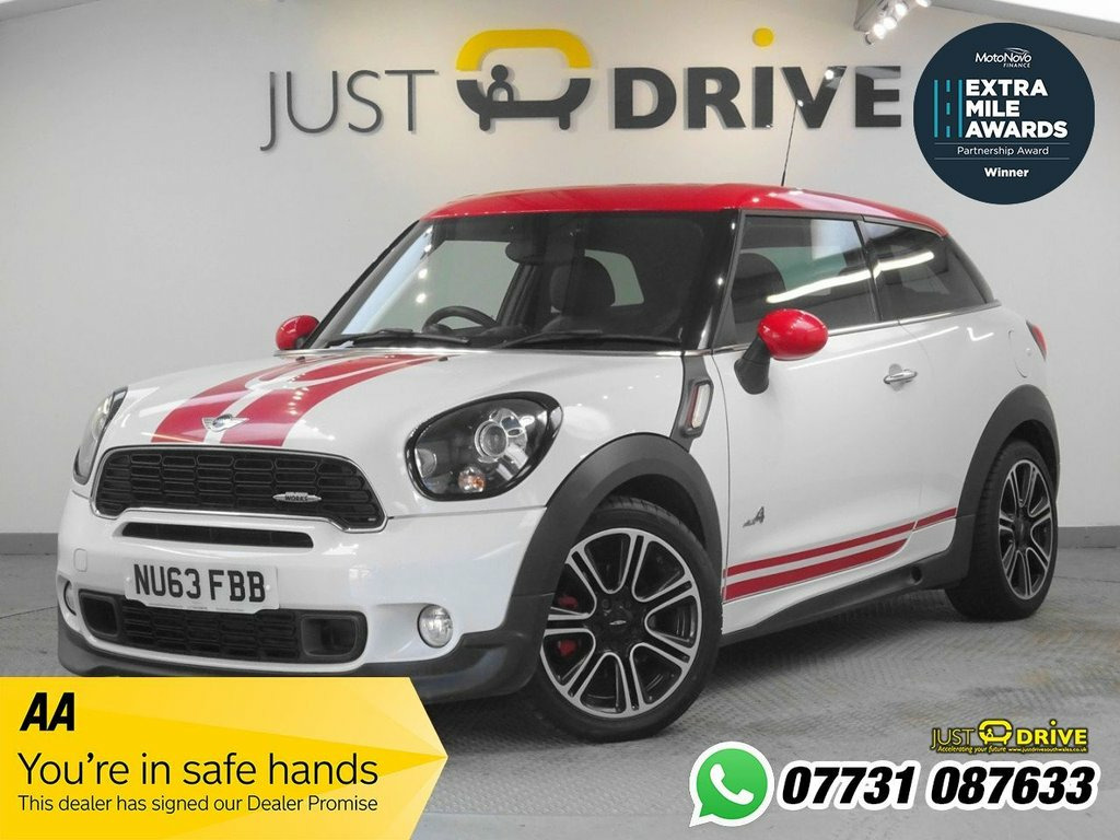A super-sporty coupe with the practicality of a hatchback, this fantastic Mini Paceman John Cooper Works offers all the fun and go-kart handling of its smaller siblings but with so much more space for passengers and luggage. Finished in Light White with chunky 18" alloy wheels, the dynamic exterior is enhanced with JCW bodystyling, a contrasting red roof / mirror caps , high level spoiler and bright red 'Viper Stripe' decals. The cabin is luxuriously trimmed in full Lounge leather and features include cruise control, reverse park sensors, air con, colour-select ambient lighting, 3-stage electrically heated seats, Sport mode, Mini Boost CD and more ! As a 4WD model it's extremely capable in all weather / terrain conditions and thanks to JCW tuning, the reliable 1.6 petrol engine produces a powerful 215 Bhp whilst still achieving up to 45 mpg, according to Mini's data. All vehicles are supplied with a brand new MOT with no advisories, interim service and warranty at point of sale. We also provide FREE 12 month basic AA Roadside Assistance. Brake fluid level warning light, Brake pad wear indicator warning light, DTC - Dynamic traction control, Electric power steering, Engine start/stop button, Exterior temperature gauge, Oil level indicator, Rear park distance control, Service interval indicator, Sports button, Automatic door locking, Electronic immobiliser, Locking wheel bolts, Remote central locking + boot release, Second remote key, Thatcham Cat.1 alarm, Sports suspension, ABS, Automatic Stability Control (ASC), Cornering brake control (CBC), Crash Sensor - activates hazard/interior, Driver and passenger airbags, Driver and passenger side airbags, DSC - Dynamic Stability Control, Electronic brake force distribution, Front he