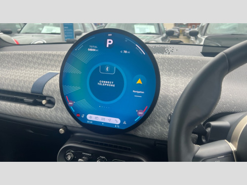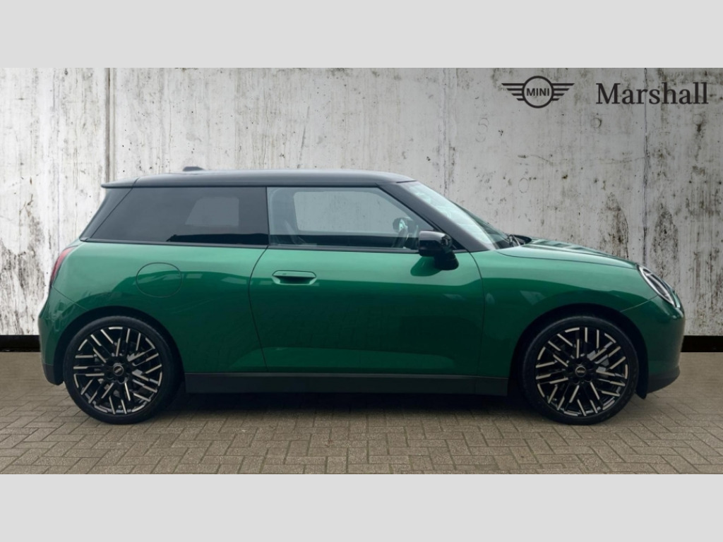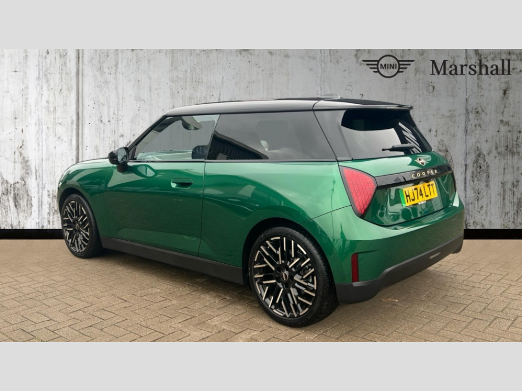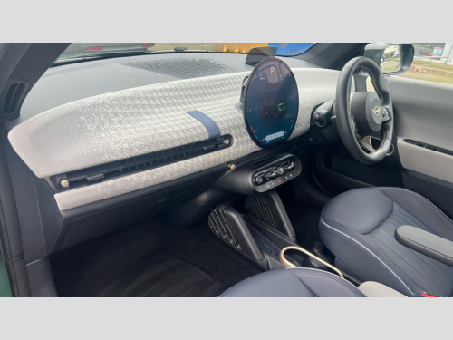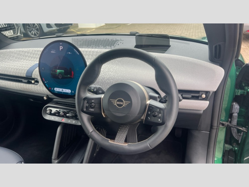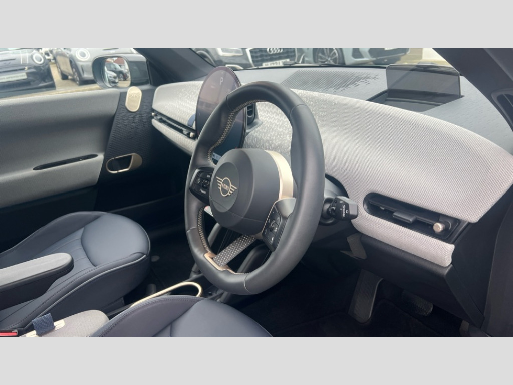 MINI Cooper 135kW E Exclusive 41kWh 3dr Auto Central toggle bar, Circular OLED Screen, Compatible mobile phone bluetooth with audio streaming, Cruise control, Digital instrument cluster, Electro-mechanical speed dependant steering assistance, Emergency call service, MINI Experience Modes, Mini navigation system, On board computer, Service interval indicator, Tailgate, 11kW AC charging, Automatic transmission, DC Rapid charging, Mode 3 cable, DAB Digital radio, Personal eSim, Auto headlights, Body coloured wheel arches, Electric adjustable heated door mirrors, Electric front+rear windows, Heated rear window, Heated windscreen washer jets, LED 3rd brake light, LED daytime running lights, LED indicator lights, LED rear lights, Logos in Vibrant Silver, Rain sensor window wipers, Rear fog lights, Rear window wiper, Vibrant silver grille surround, 2 seat bench in second row, 2 zone automatic air conditioning, 60/40 rear seat bench, Ambient lighting, Cupholders, Dark headliner, Fabric strap as 3rd spoke, Floor mats, Front and rear head restraints, Front compact armrest, Heated steering wheel, Height adjustable passenger seat, Lidded storage box in grey knit, Luggage compartment lighting, Single front passenger seat, Sport Vescin Steering Wheel, Sunvisors with vanity mirrors, Vescin synthetic leather upholstery includes dash knit in beige with grey accents, Driving assistant pack - Cooper Hatchback, Level 2 pack - Mini Hatchback, Park assistant pack - Cooper Hatchback, 3 point seatbelts on all four seats, 6 Airbags - front, side, head and seat belt tensioners, Acoustic pedestrian protection, Anti-lock braking system (ABS), DSC - Dynamic Stability Control, Electronic parking brake, Front and rear disc brakes, Front ISOFIX (iSize), Front passenger airbag deactivation, Traction control, Tyre pressure monitoring system, Alarm, Immobiliser, Remote central locking, Blue decorative dash strap, Light Beige/Grey dash knit, Tyre repair kit