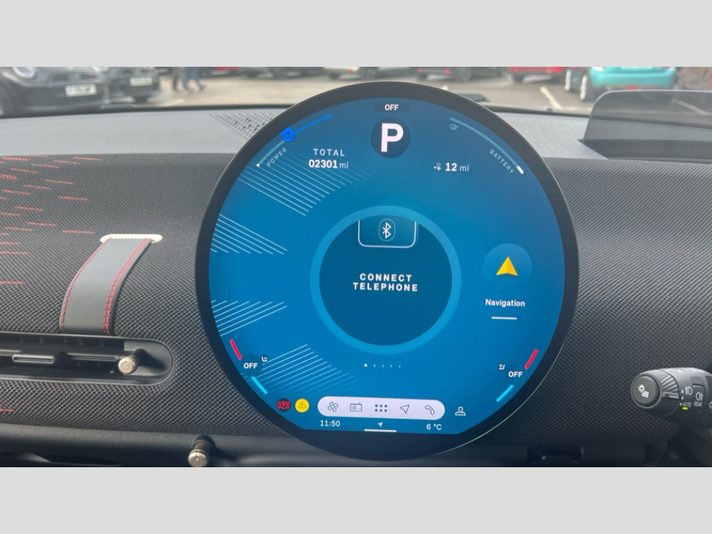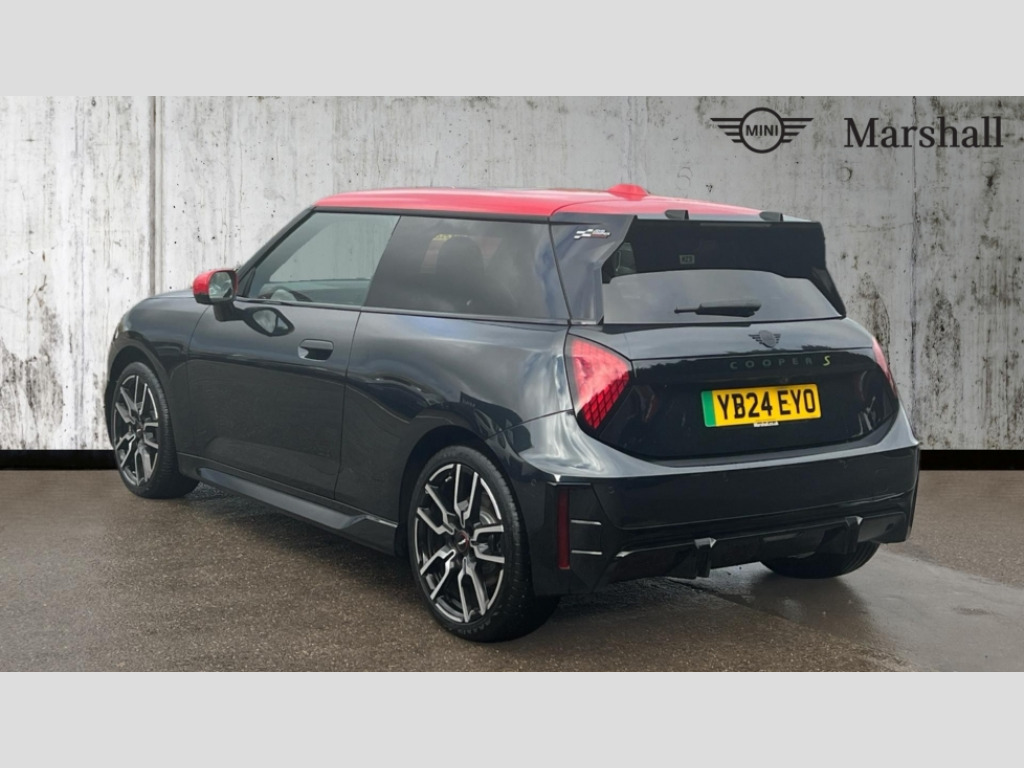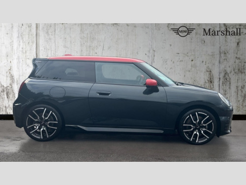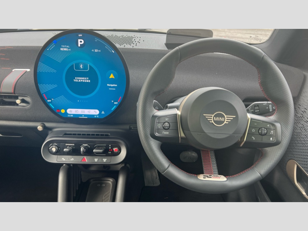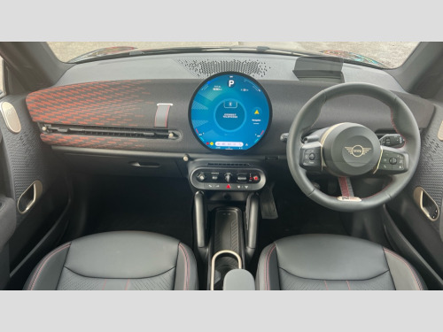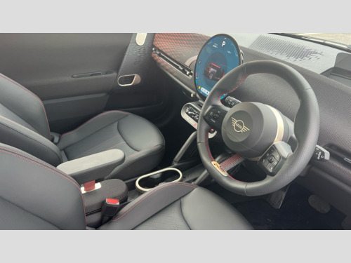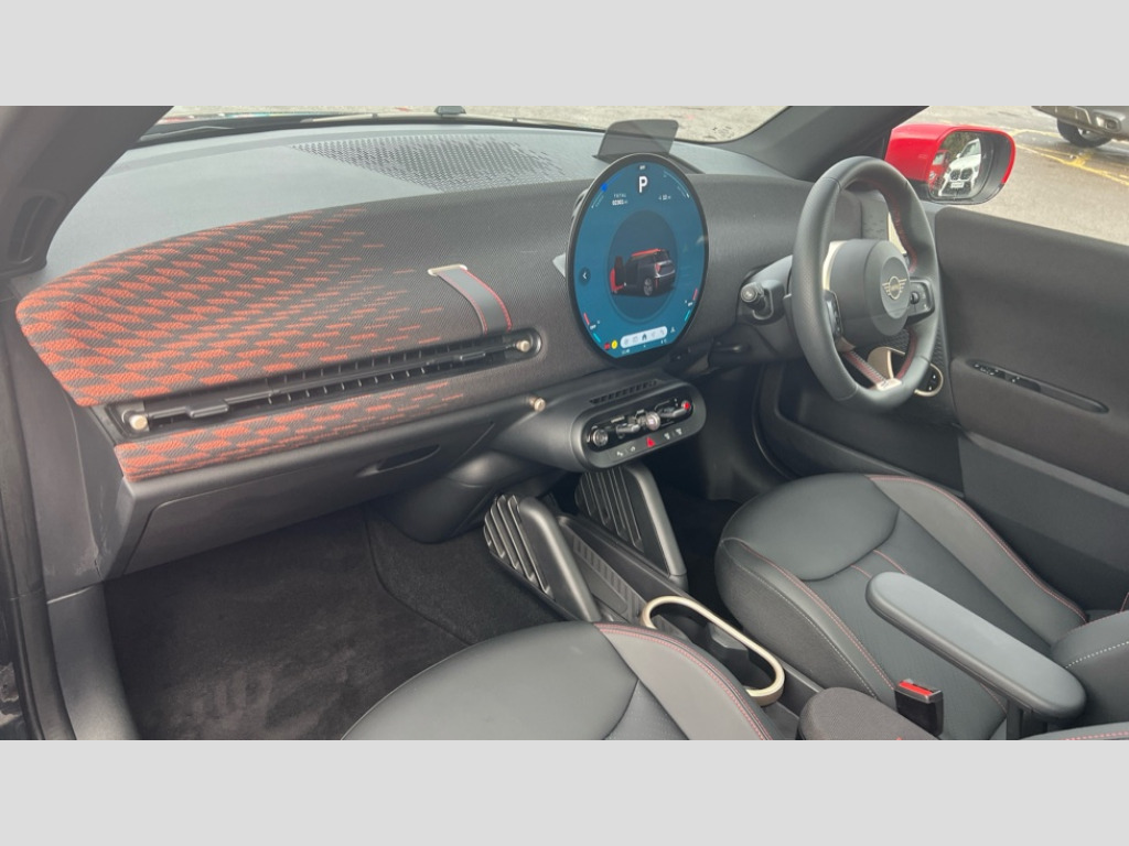 MINI Cooper 160kW SE Sport 54kWh 3dr Auto Central toggle bar, Circular OLED Screen, Compatible mobile phone bluetooth with audio streaming, Digital instrument cluster, Electro-mechanical speed dependant steering assistance, Emergency call service, MINI Experience Modes, On board computer, Service interval indicator, 11kW AC charging, Automatic transmission, DC Rapid charging, Mode 3 cable, DAB Digital radio, Auto headlights, Body coloured wheel arches, Electric adjustable heated door mirrors, Electric front+rear windows, Front and rear apron, Heated rear window, Heated windscreen washer jets, High gloss hexagonal patterned grille surround, LED daytime running lights, LED Headlights, LED indicator lights, LED rear lights, Logos in black, Rain sensor window wipers, Rear fog lights, Rear roof spoiler with airblades, Rear window wiper, 2 seat bench in second row, 2 zone automatic air conditioning, 60/40 rear seat bench, Ambient lighting, Black lower band in high gloss, Cupholders, Dark headliner, Fabric strap as 3rd spoke, Floor mats, Front and rear head restraints, Front compact armrest, Heated steering wheel, Lidded storage box in Black/Red knit, Luggage compartment lighting, Perforated Vescin steering wheel, Single front passenger seat, Sunvisors with vanity mirrors, Vescin/Cord upholstery, Level 3 pack - Mini Hatchback, 3 point seatbelts on all four seats, 6 Airbags - front, side, head and seat belt tensioners, Acoustic pedestrian protection, Anti-lock braking system (ABS), Brake caliper in Black with JCW badge, DSC - Dynamic Stability Control, Electronic parking brake, Front and rear disc brakes, Front ISOFIX (iSize), Front passenger airbag deactivation, JCW Sport Brakes, Traction control, Tyre pressure monitoring system, Alarm, Immobiliser, Remote central locking, Black/Red decorative dash strap, JCW Black/Red dashboard knit, 18" JCW Lap spoke 2-tone alloy wheels, Tyre repair kit