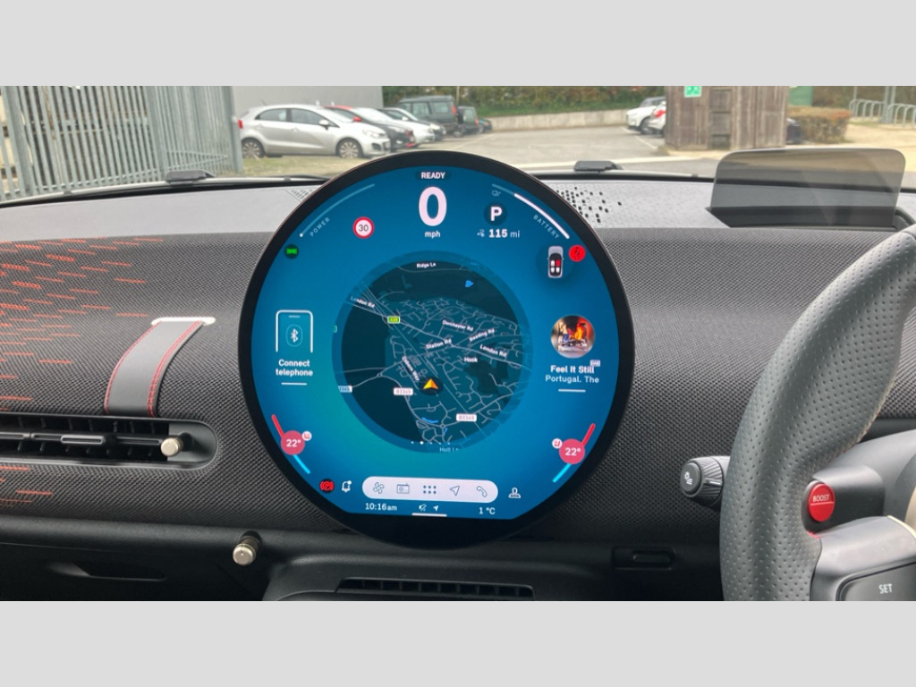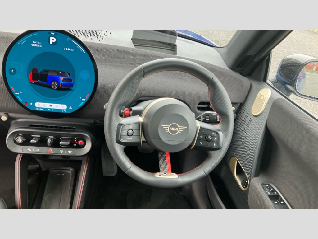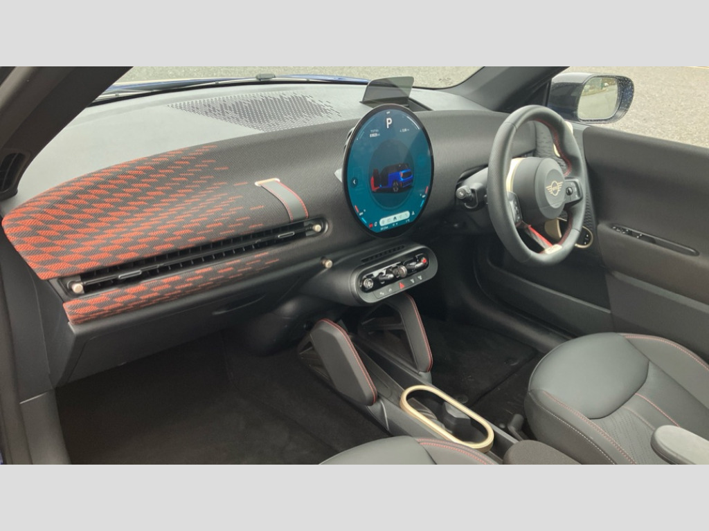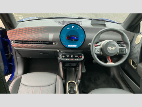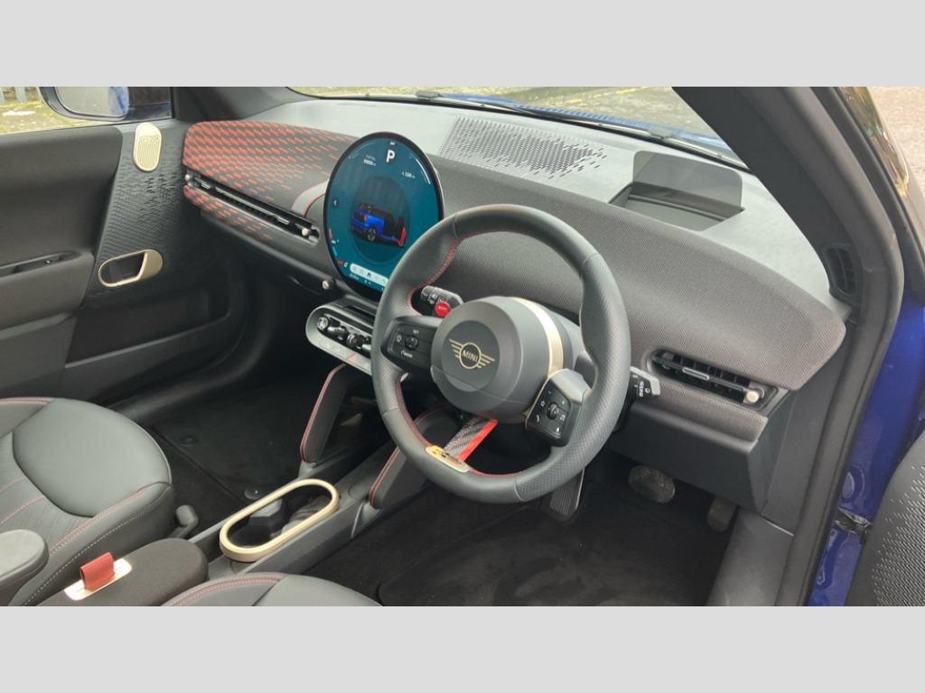 MINI Cooper 190kW John Cooper Works 54kWh 3dr Auto Central toggle bar, Circular OLED Screen, Compatible mobile phone bluetooth with audio streaming, Cruise control, Digital instrument cluster, Electro-mechanical speed dependant steering assistance, Emergency call service, JCW Experience mode, Mini navigation system, On board computer, Rear JCW graphic, Service interval indicator, Tailgate, 11kW AC charging, Automatic transmission, DC Rapid charging, Mode 3 cable, DAB Digital radio, Harman Kardon sound system, Personal eSim, Auto headlights, Body coloured wheel arches, Electric adjustable heated door mirrors, Electric front+rear windows, Front and rear apron, Heated rear window, Heated windscreen washer jets, High gloss hexagonal patterned grille surround, JCW logo projection, LED 3rd brake light, LED daytime running lights, LED indicator lights, LED rear lights, Logos in black, Rain sensor window wipers, Rear fog lights, Rear roof spoiler with airblades, Rear window wiper, 2 seat bench in second row, 2 zone automatic air conditioning, 60/40 rear seat bench, Ambient lighting, Black lower band in high gloss, Cupholders, Dark headliner, Fabric strap as 3rd spoke, Floor mats, Front and rear head restraints, Front compact armrest, Heated steering wheel, Height adjustable passenger seat, Lidded storage box in Black/Red knit, Luggage compartment lighting, Perforated Vescin steering wheel, Single front passenger seat, Stainless steel pedals, Sunvisors with vanity mirrors, Vescin/Cord combination JCW upholstery includes dash knit in black with red accents, Driving assistant pack - Cooper Hatchback, Level 2 pack - Mini Hatchback/JCW, Park assistant pack - Cooper Hatchback, 3 point seatbelts on all four seats, 6 Airbags - front, side, head and seat belt tensioners, Acoustic pedestrian protection, Anti-lock braking system (ABS), DSC - Dynamic Stability Control, Electronic parking brake, Front and rear disc brakes, Front ISOFIX (iSize), Front passenger airbag deactivation, JCW Sport Brakes, Red brake callipers, Traction control, Tyre pressure monitoring system, Alarm, Immobiliser, Remote central locking, Black/Red decorative dash strap, JCW Black/Red dashboard knit, Tyre repair kit