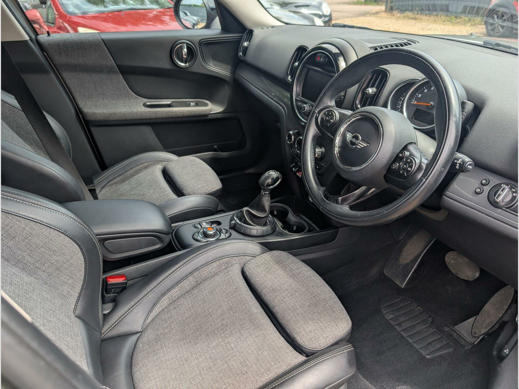 Recent service, 17in Alloy Wheels - Channel Spoke, 3 Point Seatbelts on all Seats, Air Conditioning - Automatic Dual Zone, Air Conditioning - Manual, Alarm and Immobiliser - Thatcham CAT 1, Automatic Operation of Tailgate, Bluetooth Hands Free Function with USB Audio, Body Coloured Fuel Filler Cap in Rear Right Side Panel - Linked to Central Locking, CHILI Pack, Chrome Bezels around Rear Lights and Headlights, Colour Line - Carbon Black, Comfort Access System, Crash Sensor, Cruise Control with Brake Function, DAB Tuner, DTC - Dynamic Traction Control with EDLC - Electronic Differential Lock Control, Daytime Driving Lights, Decorative Rings Surrounding Round Instruments in Chrome Plated, Door Handles - Chrome Plated, Door Handles - Interior - Chrome Plated, Door Sill Finishers - Metal Look and Model Dependent Lettering, Dynamic Stability Control - DSC, Electronic Parking Brake, Embellisher at Bottom Edge of All Windows - Chrome Plated, Exhaust Tailpipe - Visible - Single - Round with Chrome Finisher, External Visible VIN, Foldable Rear Backrest 40:20:40, Front Fog Lights, Fuel Pump Automatic Cut-Off in Crash Situation, Gearshift-Selector Lever and Handrake Lever Gaiters in Sensatec, Halogen Lights for Low Beam and High Beam Headlights, Headlight - Beam-Throw Control Electrical with Manual Adjustment, Headliner - Satellite Grey, Headrests For All Seats - Manually Adjustable, Heated Mirrors and Windscreen Washer Jets, Heater with Mechanical Control and Recirculating-Air Button, Intelligent Emergency Calling - E-Call, Interior Light Pack, Interior Lights - Integrated into Centre Front Headliner and Centre Light in Headlining, Interior Mirror - Mechanical Anti-Dazzle, Interior Trim - Hazy Grey, John Cooper Works Sport Seats, LED Headlights with Cornering Lights, Lashing Eyes in Luggage Compartment, MINI Central Display with LED Ring, MINI Connected, MINI Driving Modes, MINI Excitement Pack, MINI Navigation System, MINI TeleServices, MINIMALISM Fuel Saving Technology, Microfilter, Model Logo Countryman in Chrome, Multiple-Control-Arm Rear Axle, Non Smoker Package, PDC - Park Distance Control - Rear, Passenger Seat Height Adjustable, Personal Profile, Picnic Bench, Rain Sensor and Automatic Headlight Activation, Rear Fog Light, Rear Window Wiper, Roof Rails - Silver, Roof Spoiler Painted in Roof Colour, Roof in Body Colour, Seat Heating for Driver and Front Passenger, Side Scuttles Black with Integrated Direction Indicator White, Sills-Bumper Edges-Wheel Arches - Black with Model-Specific Bumper Trims, Single Horn, Single Joint Spring Strut Front Axle, Speakers - Four Mid Range in Front and Rear Doors and Two Woofers Under Front Seats, Standard Seat for Driver and Front Passenger, Start-Stop Button with Keyless Start, Sun Visors with Integrated Vanity Mirrors on Drivers and Passengers Sides, Tailgate Gas Struts Assist When Opening and Holding In An Opened Position, Tailgate Handle - High Gloss Black, Tyre Pressure Indicator, Visual Boost Radio, White Indicators