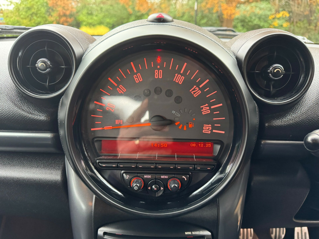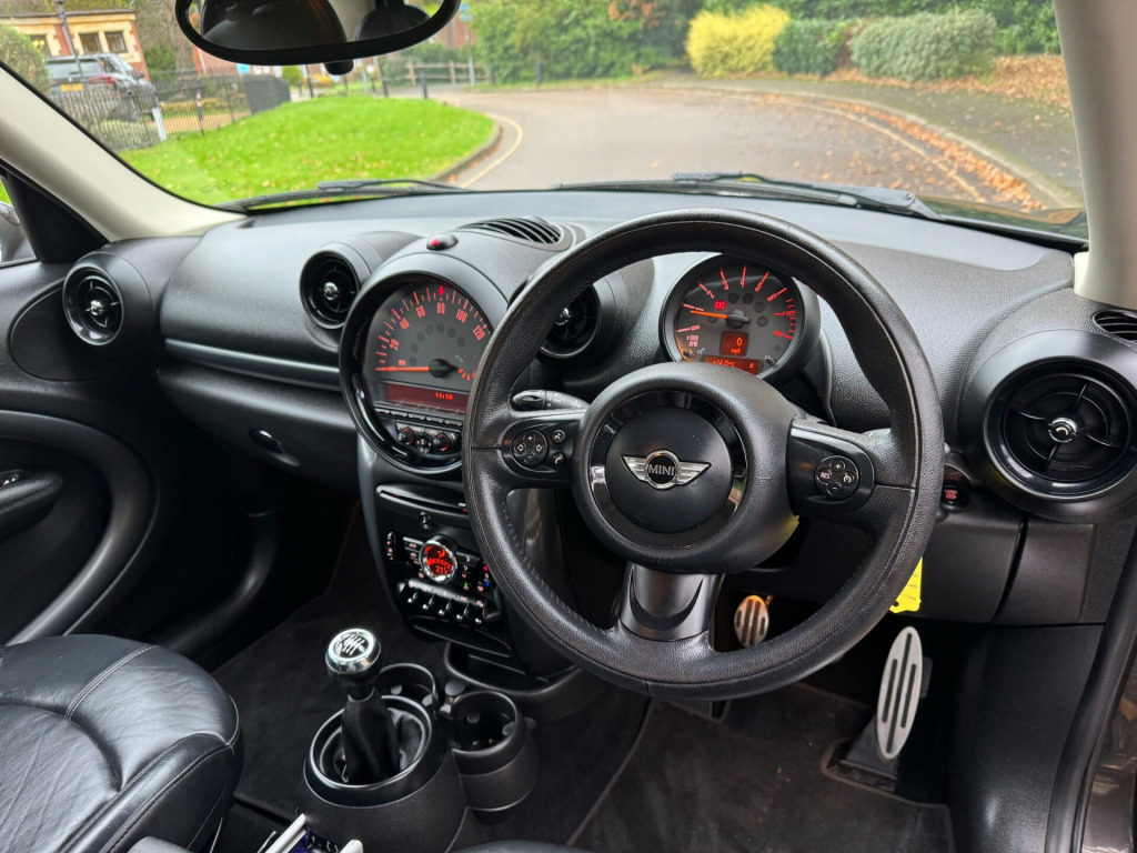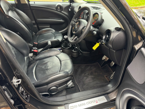 This 2014 Mini Countryman 1.6 Cooper S SUV with just 43504 miles on the clock is the perfect adventure vehicle for any family. With 5 seats and 5 doors, there's plenty of room for everyone to come along for the ride. Powered by a reliable petrol engine, this car is ULEZ compliant and its MOT doesn't expire until 18/08/2026. The manual transmission and Euro 5 standard make for a smooth and efficient drive, while the CHILI Pack and 18in Alloy Wheels add a touch of style. Other features like the automatic air conditioning, black roof and mirror caps, and run-flat tires make this car both practical and fashionable. Perfect for city driving or long road trips, this Mini Countryman is ready for anything., in alloy wheels - 5-star double spoke light, air scoop integrated between bumper and radiator grille-frame in body colour, door handles - chrome plated, door mirrors - electrically adjustable and heated, electric windows - one touch up and down front and rear, embellisher at bottom edge of all windows - chrome plated, exhaust tailpipe - visible double round left and right with chrome finishers, frame chrome-plated radiator-grille in honeycomb black, headlights - chrome bezels, heated front windscreen washer jets, mini mobility system, mirror caps in body colour, roof rails - dark anthracite, roof in body colour, security locking wheel bolts, side scuttles with integrated indicators, spoiler - roof, white direction indicators lights, 3-spoke sport leather steering wheel, air conditioning - manual, bike rack preparation at rear, car jack, centre rail, cooled glovebox, cupholders - two in front, door handles - interior - chrome plated, footrest and pedals in stainless steel, grab handles, headlining - beige, interior surfaces - dark anthracite decorative trim finishers on centre console and door ring, interior lights - integrated into centre front headliner including two reading lights, lashing eyes in luggage compartment, microfilter, seats - 40:20:40 split rear backrests, seats - height adjustable drivers, seats - sports front, steering column height and length adjustment, sun visors with integrated vanity mirrors on drivers and passengers sides, 3rd brake light, halogen lights for low beam and high beam headlights, headlight - beam-throw control electrical with manual adjustment, headlights - follow me home, airbags - driver, airbags - front passenger, airbags - front passenger with deactivation switch, airbags - front side, airbags - head, alarm - thatcham cat1, anti-lock braking system - abs, brake assist, cbc - cornering brake control, central locking - activated at 10mph, central locking - remote, child seat isofix attachment, dtc - dynamic traction control, dynamic stability control - dsc, ebd - electronic brake-force distribution, hill assist, second radio remote key, aux-in connection, basic bluetooth function with usb audio, central bass hi-fi system, dab tuner, radio boost cd, brake pad wear indicator, electronic power steering, minimalism fuel saving technology, pdc - park distance control - rear, sport button, tpws - tyre pressure warning system, 6 months rac warranty, free service, never been smoked in, no admin fees, part exchange a pleasure., two keys, 18