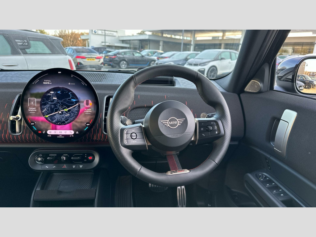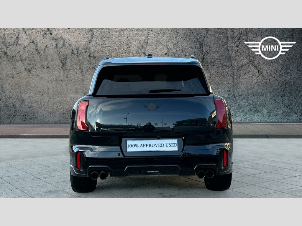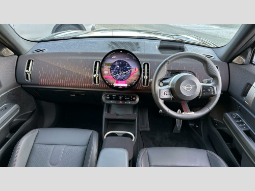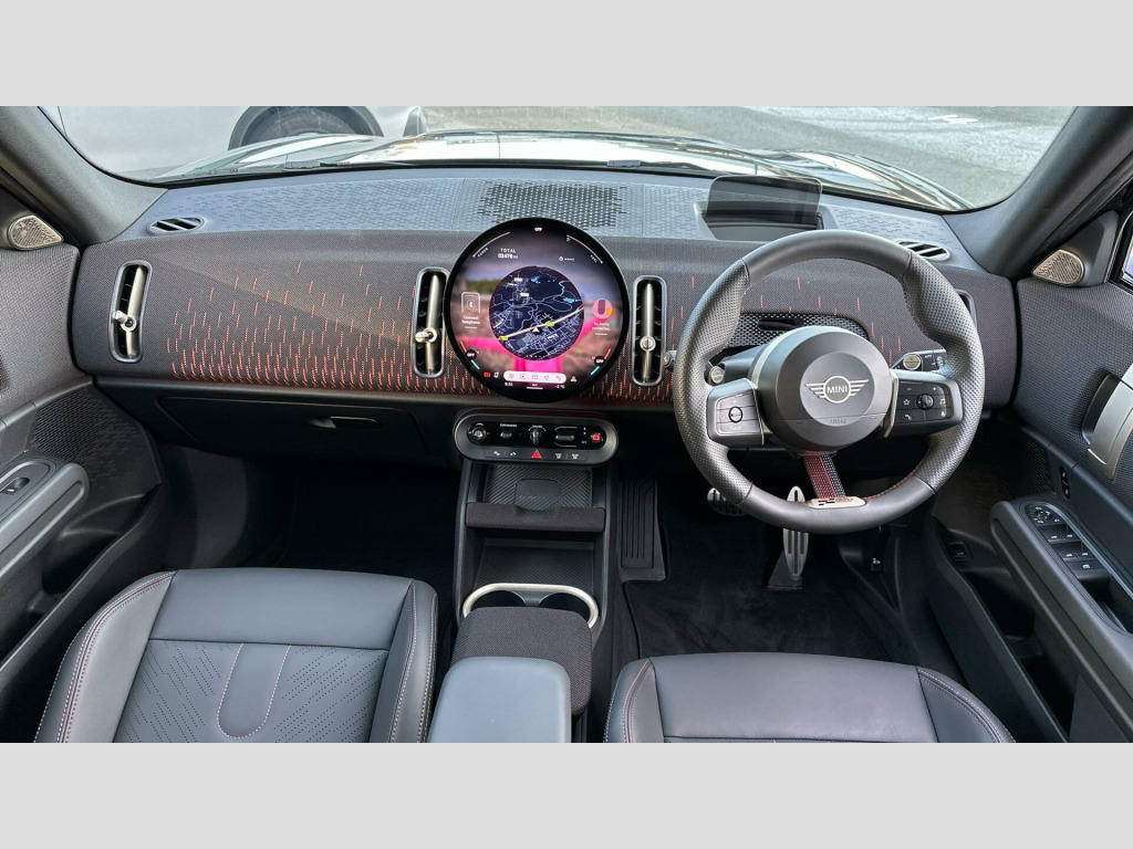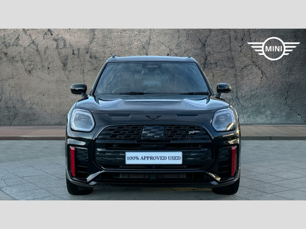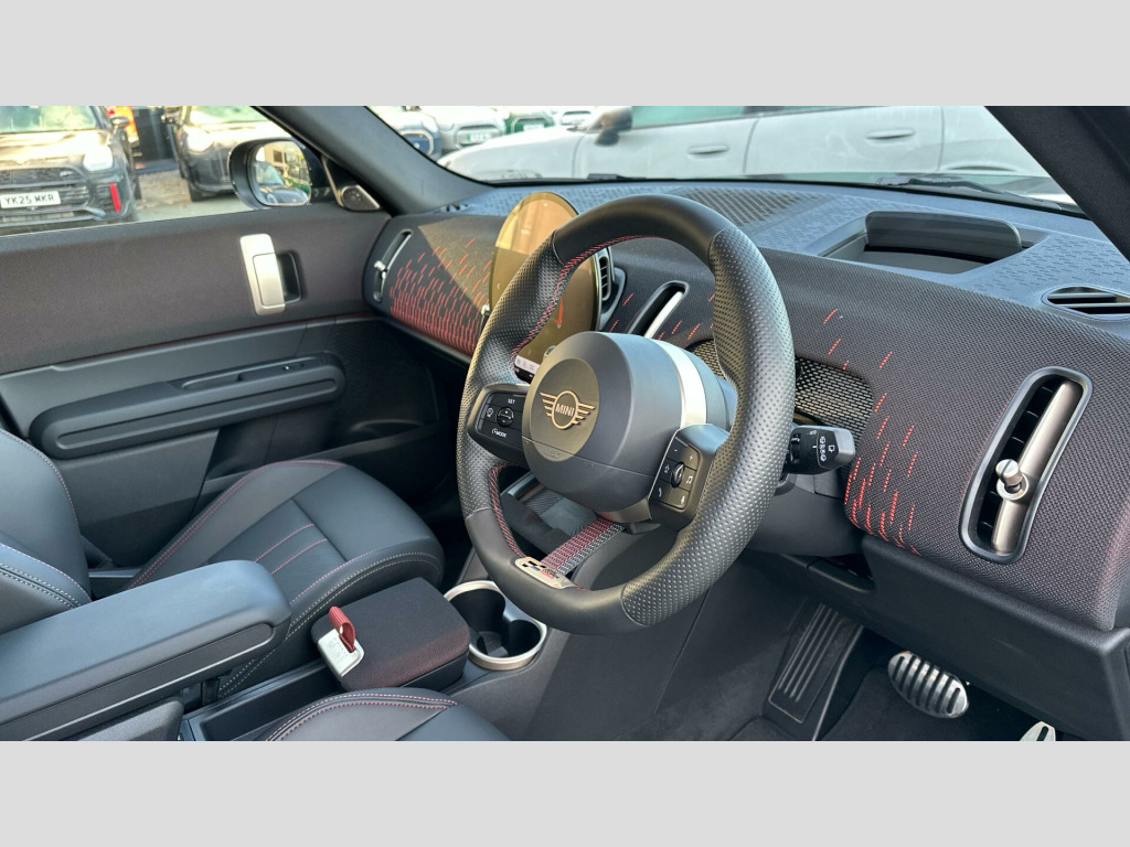MINI Countryman John Cooper Works in Midnight Black with Vescin/cord combination JCW Black interior. Spec includes Level 3, Panoramic Glass Sunroof, Comfort Access, Driving Assistant Professional, Adaptive LED Headlights, High-Beam Assistant, MINI Head-up Display, MINI Navigation AR, Storage for wireless charging, Harman/Kardon Surround Sound Audio, Apple Carplay, Parking Assistant Plus, Front and Rear Parking Sensors, 360 Camera, Inferior Camera, Electric Folding Mirrors, Rear-view Mirror with Auto dimming, Electric Memory Seats, Active Seat for Driver, Sliding Rear Seats, Heated Front Seats, John Cooper Works Sport Seats, John Cooper Works Sport Steering Wheel, Heated Steering Wheel, Roof in Body Colour, Roof Rails, 20'' John Cooper Works Flag Spoke 2-tone Alloy Wheels, JCW Performance Brake. EU6 RDE II exhaust emissions standard, Sport Double-clutch auto transmission, Tyre Repair Kit, John Cooper Works steering wheel, Adaptive Suspension, Heated Steering Wheel, Roof Rails, Anthracite Roof Lining, John Cooper Works sport seats, MINI Experience Modes, Child seat i-Size attachment for front p, Active Guard, BMW TeleServices, BMW Emergency Call, Personal eSIM, DAB Radio, Harman/Kardon Surround Sound Audio, COC additional contents, Active Pedestrian Safety, English / on-board literature II, Sport Trim Content, 20'' John Cooper Works Flag Spoke 2-tone, JCW Performance Brake, Comfort Access, Roof in Body Colour, Sliding Rear Seats, Interior Camera, Panoramic Glass Sunroof, Luggage Net, Sun Protection Glass, Ext. mirrors- folding with anti-dazzle, Rear-view Mirror with Auto dimming, Active Seat for Driver, Electric Memory Seats, Heated front seats, High-Beam Assistant, Driving Assistant Professional, Adaptive LED Headlights, Parking Assistant Plus, MINI Head-up Display, Storage for wireless charging, MINI Navigation AR, Sport, Level 3.