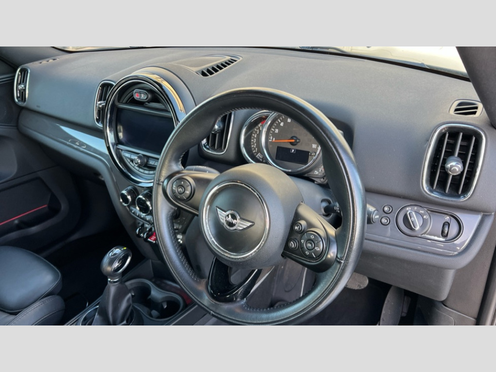 MINI Countryman 1.5 Cooper 5dr Auto Brake pad wear indicator warning light, Central display with LED ring and 6.5" colour touch screen, DTC - Dynamic traction control, Exterior temperature gauge, Intelligent emergency call, MINI TeleServices, Navigation system, On board computer, Personal Profile, Service interval indicator, Servotronic speed sensitive power steering, Electronic differential lock, Auxiliary input socket, DAB digital radio module, MINI Connected, MP3 compatible radio/single CD player, Radio visual boost, Anti dazzle rear view mirror, Blue tinted glass, Chrome door handles, Chrome exhaust tailpipe, Chrome headlight surround, Chrome plated radiator grille, Chrome window surround, Electric front windows + one touch + anti-pinch, Electrically adjustable door mirrors, Follow me home headlights, Heated door mirrors/heated windscreen washers, Heated rear window with automatic switch off, Metal look door sill finishers, Rain sensor including auto headlights activation, Rear wiper, Roof spoiler, White indicator lights, 12V power point front, 2 cupholders in front centre console, 4 lashing points to secure luggage, 40:20:40 split folding rear seats, Centre console storage box, Chrome interior door handles, Driver/passenger sunvisors, Front and rear headrests, Front and rear Isofix child seat preparation, Front and rear velour floor mats, Front centre armrest with storage compartment, Front interior light, Front passenger grab handle, Front seat backrest storage nets, Heater with recirculation function, Height/reach adjust steering wheel, Luggage compartment lighting, Multifunction steering wheel, Rear grab handles, Sensatec gearshift and handbrake, Storage compartments in doors, Toolkit in luggage compartment, Interior lights pack - Countryman, MINI Excitement Pack - Countryman, 3 point automatic seatbelts, 3 point seatbelts on all rear seats, ABS, Cornering brake control (CBC), Crash Sensor - activates hazard/interior lighting + unlocks doors, Driver and passenger airbags, Driver and passenger side airbags, DSC - Dynamic Stability Control, Electronic brake force distribution, Electronic parking brake, Front curtain airbags, Front passenger airbag deactivation, Fuel cut off safety device, Hill start assist, Pyrotechnically pre-tensioned front seatbelts, Tyre pressure warning, Automatic door locking, Keyless start, Locking wheel bolts, RF remote control central locking, Second remote key, Thatcham category 1 alarm + immobiliser