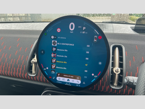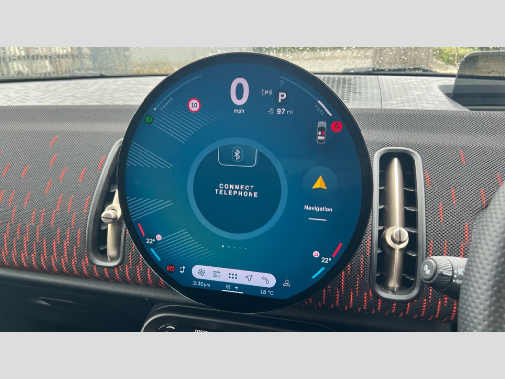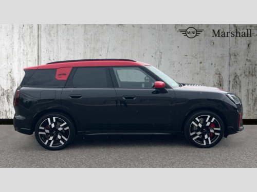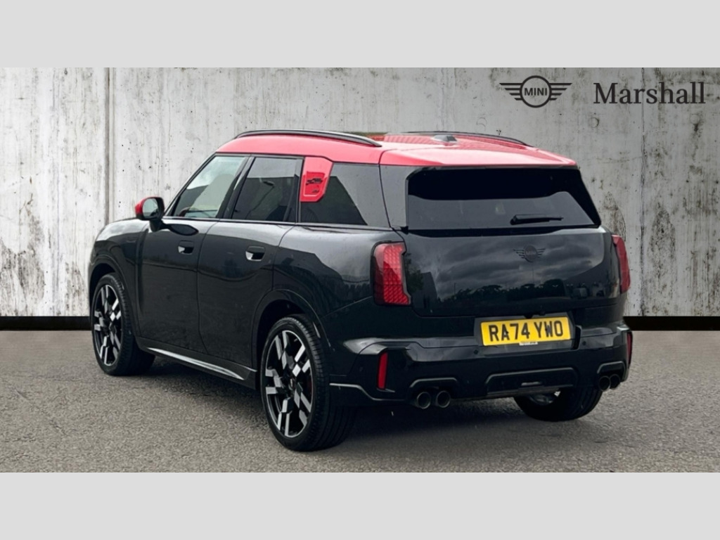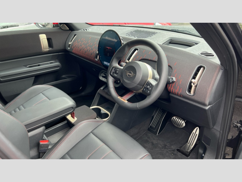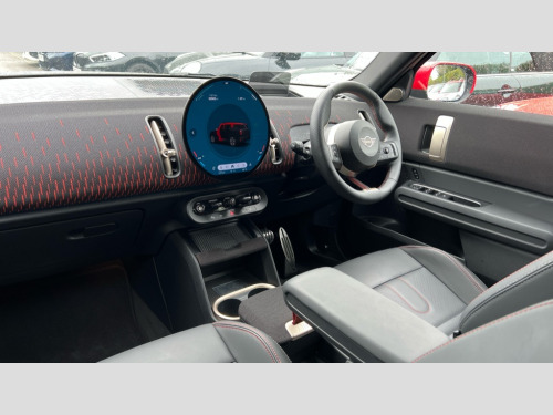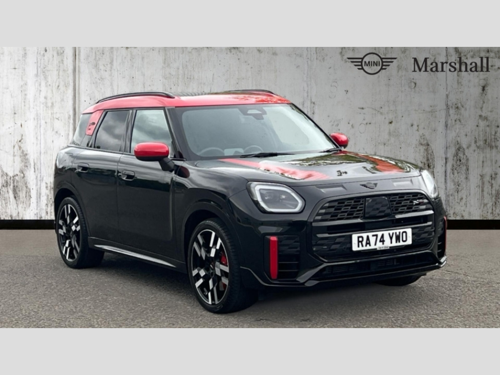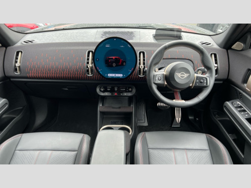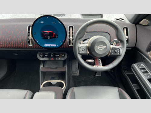 MINI Countryman 2.0 John Cooper Works ALL4 5dr Auto Bluetooth connection, Circular OLED Screen, Compatible mobile phone bluetooth with audio streaming, Digital dashboard display, E-call, Electro-mechanical speed dependant steering assistance, MINI Experience Modes, MINI Head up display, Mini navigation system, MINI TeleServices, Parking assistant in camera and ultrasound based assistance system, rear view camera, parking aid and distance control, Adaptive suspension, Double clutch sports transmission, Quad exhaust system, DAB Digital radio, Harman Kardon surround sound system, Personal eSim, Auto tailgate, Darkened rear glass, Electric adjustable heated door mirrors, Front and rear apron, Front and rear electric windows, Heated rear window, High beam assistant, High gloss hexagonal patterned grille surround, Interior rear-view mirror with automatic anti-dazzle function, LED daytime running lights, LED headlights with extended contents including Adaptable light signatures, LED rear lights, LED third brake light, Opening panoramic roof with slide and tilt functionality, Retractable sun shade with fully opaque fabric, Rain sensor with auto headlights, Rear roof spoiler with airblades, Rear side wing doors, Rear window wiper, Roof rails, Sun protection glazing, 3 seat bench in 2nd row, 60/40 split rear bench seat, Anthracite headliner, Auto air conditioning, Driver and front passenger seat heating, Floor mats, Front armrest, Front headrests, Heated steering wheel, Height and length steering column adjustment, JCW Front sports seats, Lidded storage box in Black/Red knit, Luggage compartment separating net, Perforated Vescin steering wheel, Rear headrests, Seat adjustment for rear seats, Single front passenger seat, Sunvisors with vanity mirrors, Vescin/Cloth upholstery, Wireless charging tray, Driving assistant plus pack - Mini Countryman, Interior and exterior mirror package - Mini Countryman, 3x3 point rear seat belts, 6 Airbags - front, side, head and seat belt tensioners, ABS, DSC - Dynamic Stability Control, Electronic handbrake, Electronic Stability Programme (ESP), Front ISOFIX (iSize), Hill descent control, Hill hold assist, Hill start assist, JCW logo in brake calipers, JCW Sport brakes with Chilli Red calipers, Manual rear child locks, Traction control, Tyre pressure monitoring system, Warning triangle, Alarm system with tilt sensor, monitoring doors, bonnet interior and tailgate, Auto drive away locking, Comfort access system, Deadlocking function, Electronic vehicle immobiliser, Locking wheel bolts, Remote control locking, Start/stop toggle with keyless go, JCW Black/Red dashboard knit, 20" JCW Flag Spoke 2 Tone alloy wheels, MINI Mobility Kit