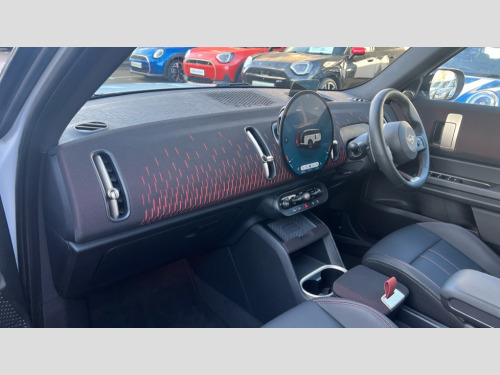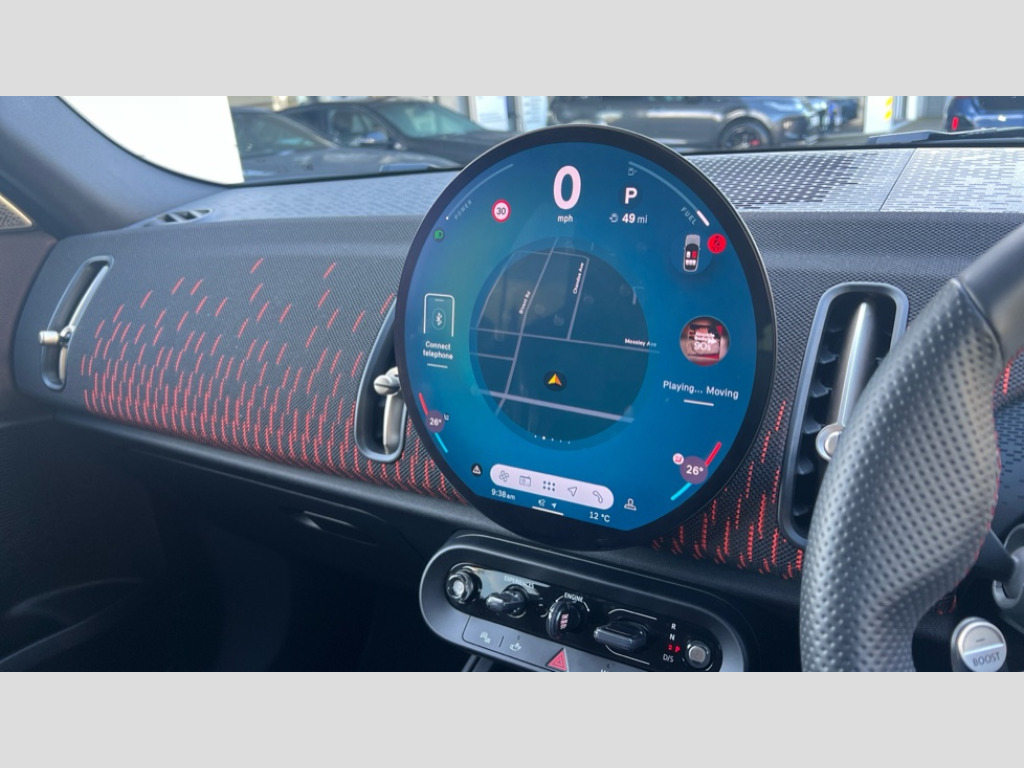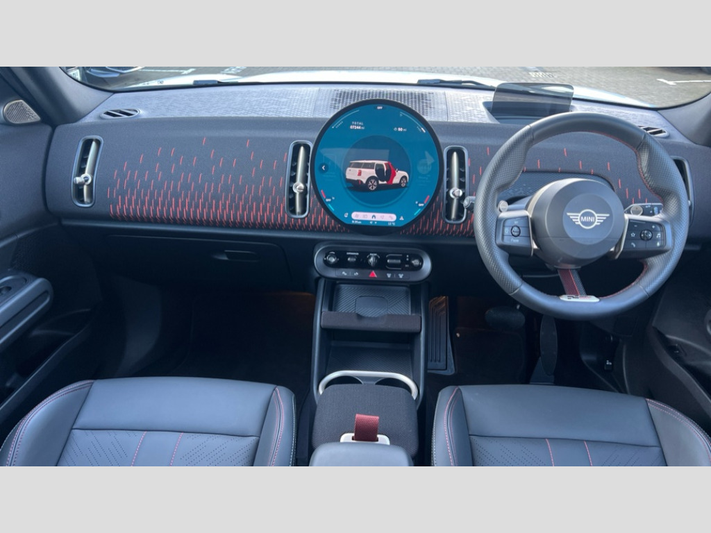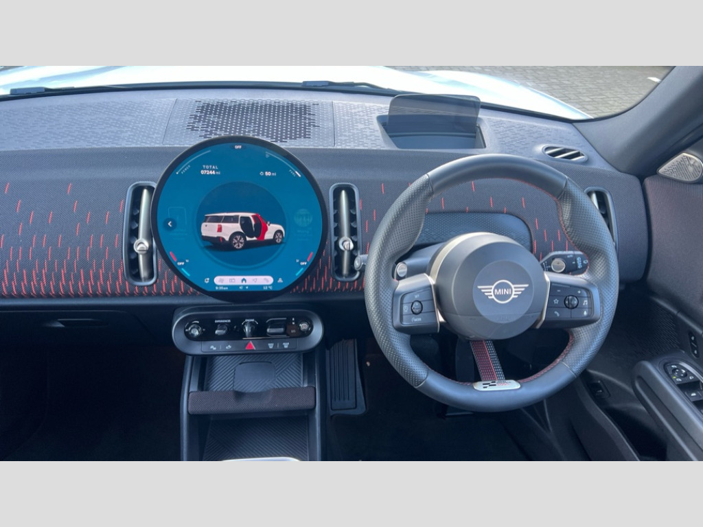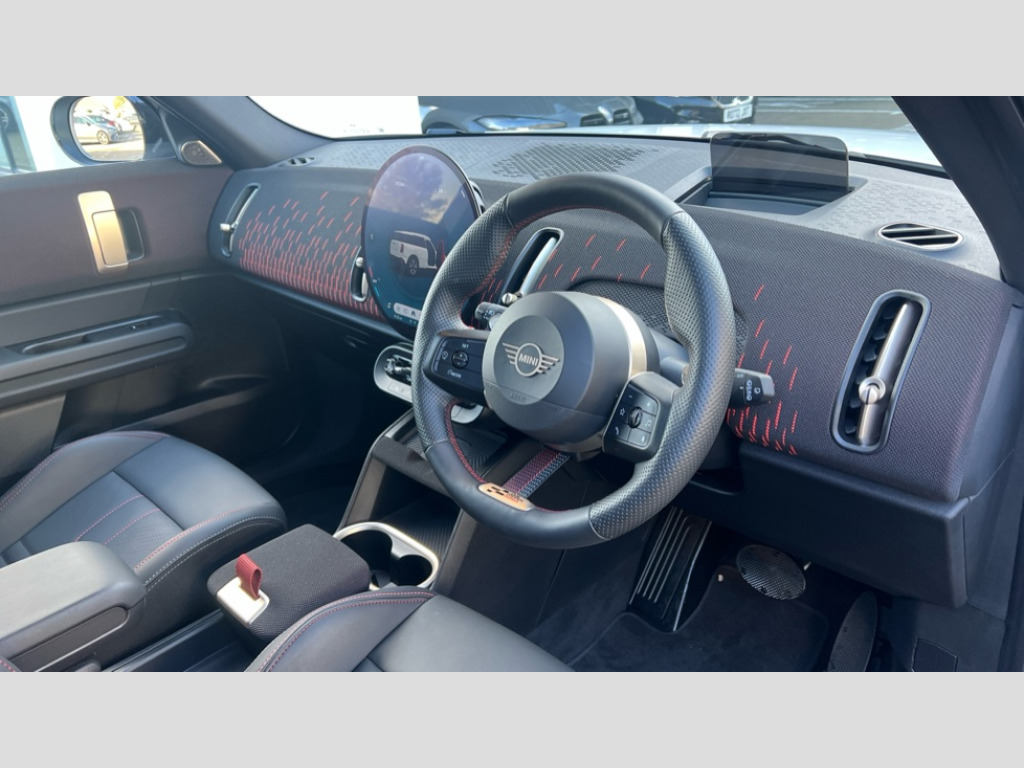 MINI Countryman 2.0 S Sport ALL4 5dr Auto Bluetooth connection, Circular OLED Screen, Compatible mobile phone bluetooth with audio streaming, Digital dashboard display, E-call, Electro-mechanical speed dependant steering assistance, MINI Experience Modes, MINI Head up display, Mini navigation system, MINI TeleServices, Parking assistant in camera and ultrasound based assistance system, rear view camera, parking aid and distance control, Adaptive suspension, Double clutch sports transmission, Larger capacity fuel tank, DAB Digital radio, Harman Kardon surround sound system, Personal eSim, Auto tailgate, Darkened rear glass, Electric adjustable heated door mirrors, Front and rear apron, Front and rear electric windows, Heated rear window, High beam assistant, High gloss hexagonal patterned grille surround, Interior rear-view mirror with automatic anti-dazzle function, LED daytime running lights, LED headlights with extended contents including Adaptable light signatures, LED rear lights, LED third brake light, Opening panoramic roof with slide and tilt functionality, Retractable sun shade with fully opaque fabric, Rain sensor with auto headlights, Rear roof spoiler with airblades, Rear side wing doors, Rear window wiper, Roof rails, Sun protection glazing, 3 Seat sliding rear bench in 2nd row, 60/40 split rear bench seat, Anthracite headliner, Auto air conditioning, Driver and front passenger seat heating, Floor mats, Front armrest, Front headrests, Heated steering wheel, Height and length steering column adjustment, JCW Front sports seats, Lidded storage box in Black/Red knit, Luggage compartment separating net, Perforated Vescin steering wheel, Rear headrests, Seat adjustment for rear seats, Single front passenger seat, Sunvisors with vanity mirrors, Vescin/Cloth upholstery, Wireless charging tray, Driving assistant plus pack - Mini Countryman, Interior and exterior mirror package - Mini Countryman, 3x3 point rear seat belts, 6 Airbags - front, side, head and seat belt tensioners, ABS, Brake calipers in Black with JCW badge, DSC - Dynamic Stability Control, Electronic handbrake, Electronic Stability Programme (ESP), Front ISOFIX (iSize), Hill descent control, Hill hold assist, Hill start assist, JCW Sport Brakes, Manual rear child locks, Traction control, Tyre pressure monitoring system, Warning triangle, Alarm system with tilt sensor, monitoring doors, bonnet interior and tailgate, Auto drive away locking, Comfort access system, Deadlocking function, Electronic vehicle immobiliser, Locking wheel bolts, Remote control locking, Start/stop toggle with keyless go, JCW Black/Red dashboard knit, MINI Mobility Kit