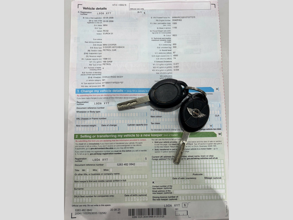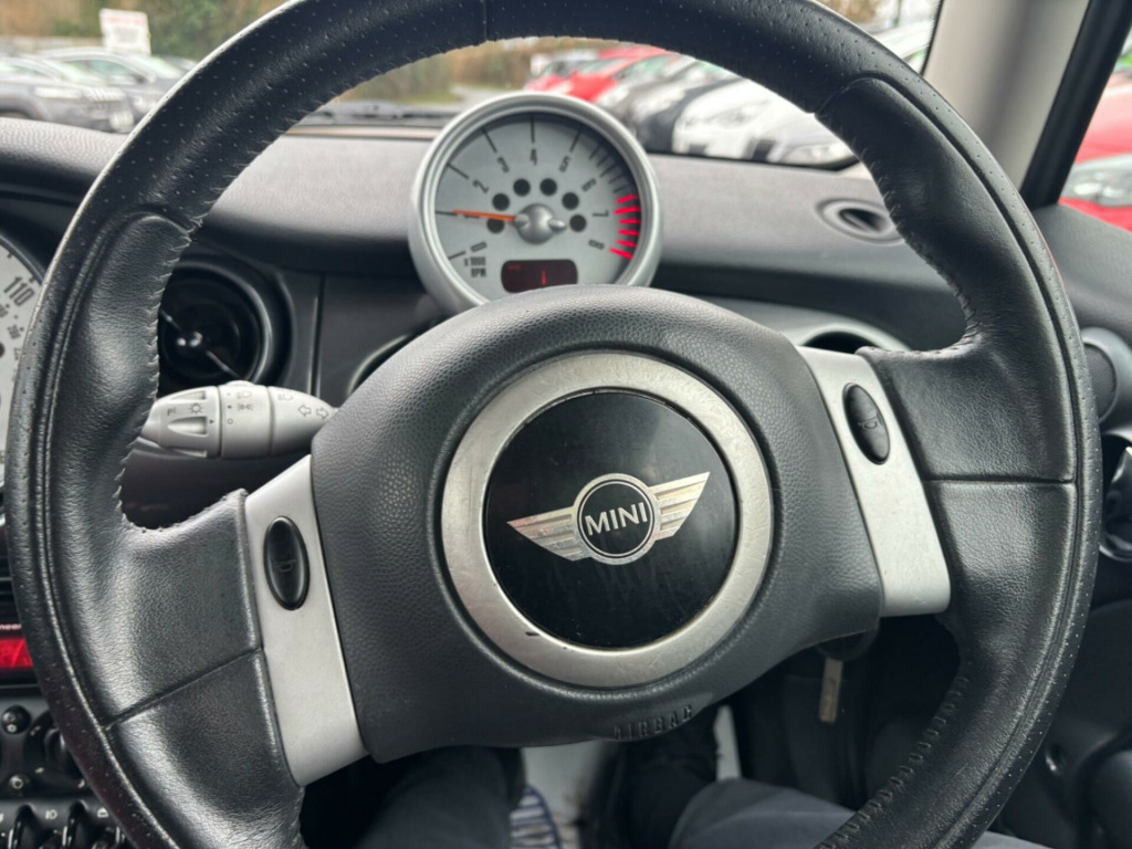 This 2006 MINI Hatch Cooper has been cherished by only three owners, offering a well maintained example of this popular model. Powered by a responsive 1.6 litre petrol engine, this Cooper variant delivers an engaging driving experience. It comes equipped with manual air conditioning, ensuring comfort on every journey.The performance of this MINI Hatch Cooper is noteworthy, achieving 0 to 62 miles per hour in just 9.1 seconds. This acceleration figure demonstrates its spirited nature, setting it apart from many other vehicles in its class. This MINI Hatch Cooper represents a compelling choice for those seeking a stylish and enjoyable car.. 15in 5 star Rocket Alloy Wheels, 15in 7 Hole Alloy Wheels, 16in 5 star Light Alloy Wheels when with Chili Pack, 16in 7Spoke Fin Alloy Wheels when with Chilli Pack, Alloy Wheels painted White, Anthracite Interior Trim, Black roof & mirror caps, Body colour roof & door mirrors, Brilliant Silver Interior Trim when with Chilli Pack, Brilliant Silver Interior Trim when with Pepper Pack, Cassette player, Delete COOPER badge, MINI Cooper badging on tailgate, MINI mobility System, Radio WAVE, Single CD player, Sport Suspension PLUS when with Chili Pack, Sports suspension, Thatcham Cat2 engine immobiliser, Tinted Glass, White roof & mirror caps, Manual Air Conditioning, MINI Pepper Pack, Radio BOOST, Interior Light Pack, Chrome line Exterior, Storage Compartment Pack, Cloth- Octagon- Tartan Red. Part service history
