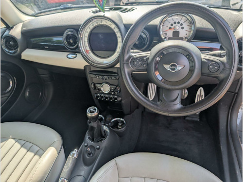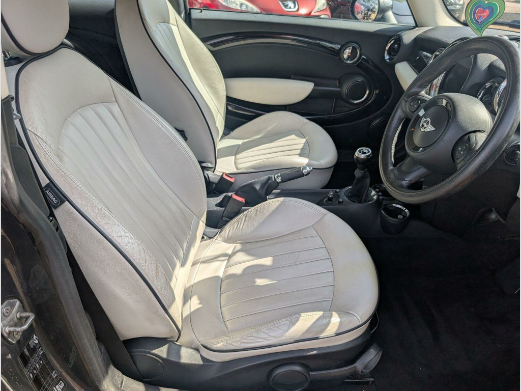 Cream Leather, Sat Nav, service history, 2 keys, 16in Alloy Wheels - Light Rib Spoke, 17in Alloy Wheels - Light Conical Spoke, ASC+T - Automatic Stability Control and Traction, Additional Decor Rings, Air Conditioning - Automatic, Air Conditioning - Manual, Airbags - Front Passenger with Deactivation Switch, Aux-In Connection, Basic Bluetooth Function with USB Audio, Brake Energy Regeneration- iGR, CBC - Cornering Brake Control, CHILI Pack, Car Jack, Chrome Line Interior, Colour Line - Satellite Grey, Crash Sensor - Fuel Cut-Off, Crash Sensor - Hazard Warning Flashers and Interior Light, DAB Tuner, Door Handles - Chrome Plated, Dynamic Stability Control - DSC, EBD - Electronic Brake-Force Distribution, External Visible VIN, Front Fog Lights, Halogen Lights for Low Beam and High Beam Headlights, Headlight - Beam-Throw Control Electrical with Manual Adjustment, Headlights - Bi-Xenon, Headlights - Chrome Bezels, Headlining - Beige, Headrests For All Seats - Manually Adjustable, Heated Mirrors and Windscreen Washer Jets, Heater with Mechanical Control and Recirculating-Air Button, Interior Light Pack, Interior Mirror - Mechanical Anti-Dazzle, Interior Surfaces - Piano Black, Interior World - Carbon Black, MINI Navigation System, MINIMALISM Fuel Saving Technology, Microfilter, Non Smoker Package, PDC - Park Distance Control - Rear, Personal Profile, Remote Controlled Alarm System, Roof in Body Colour, Seats - Easy Entry Access, Seats - Sports Front, Second Radio Remote Key, Speedometer Centred in Instrument Panel, Spoiler - Roof, Sport Button, TPWS - Tyre Pressure Warning System, White Direction Indicators Lights