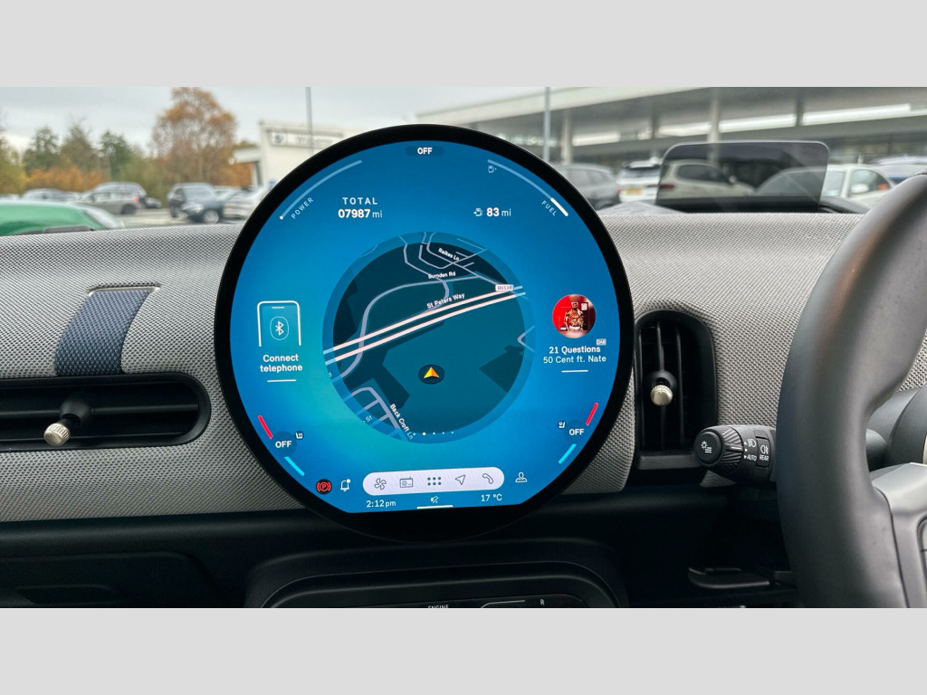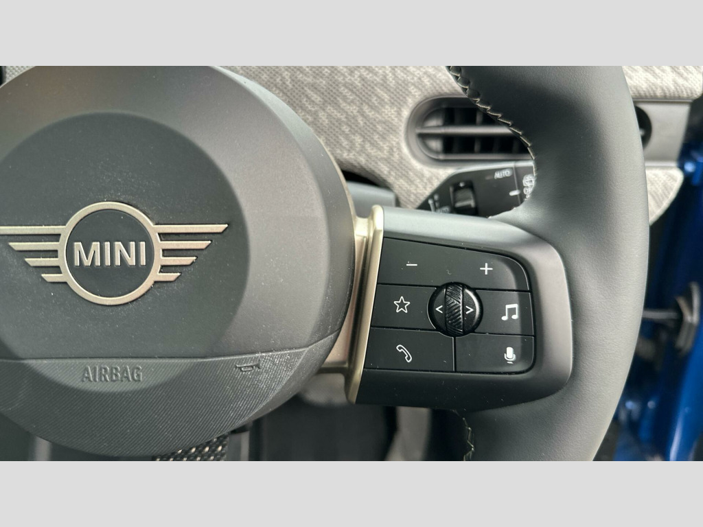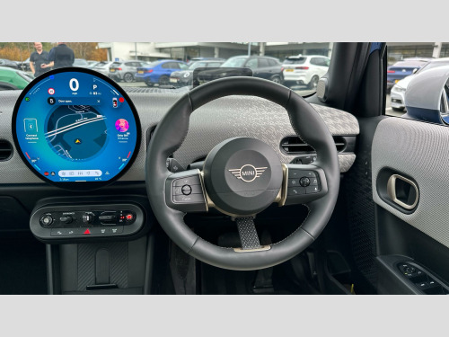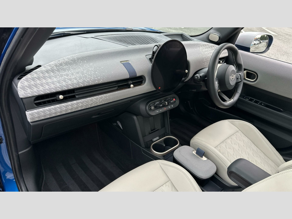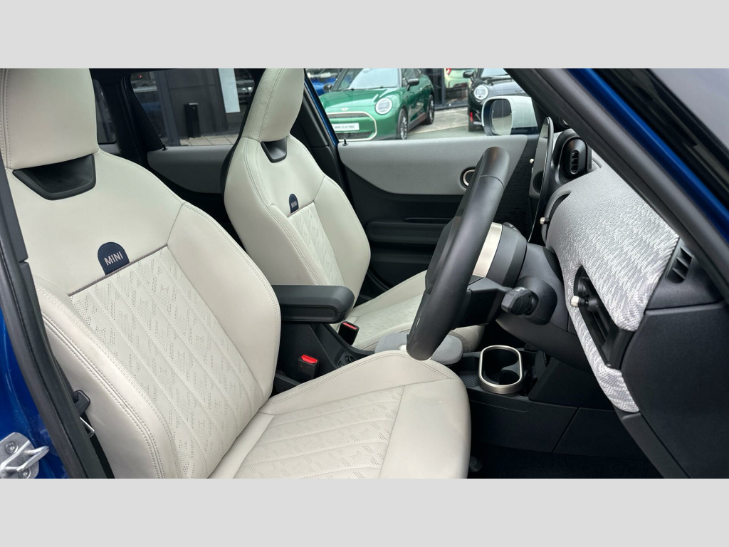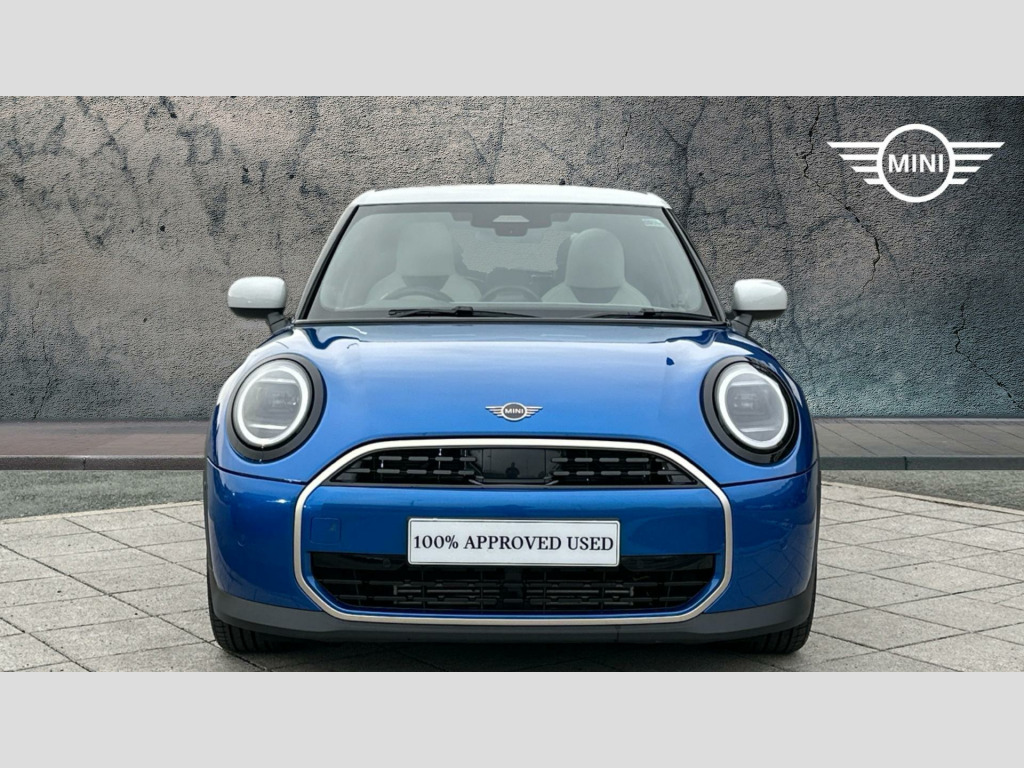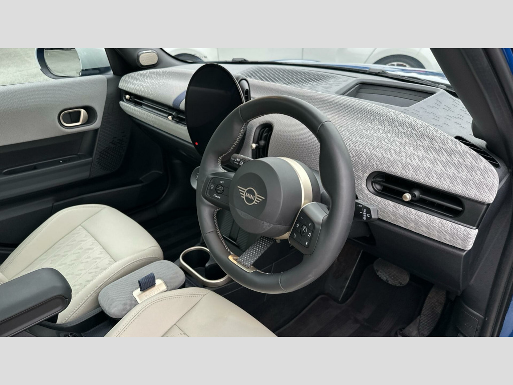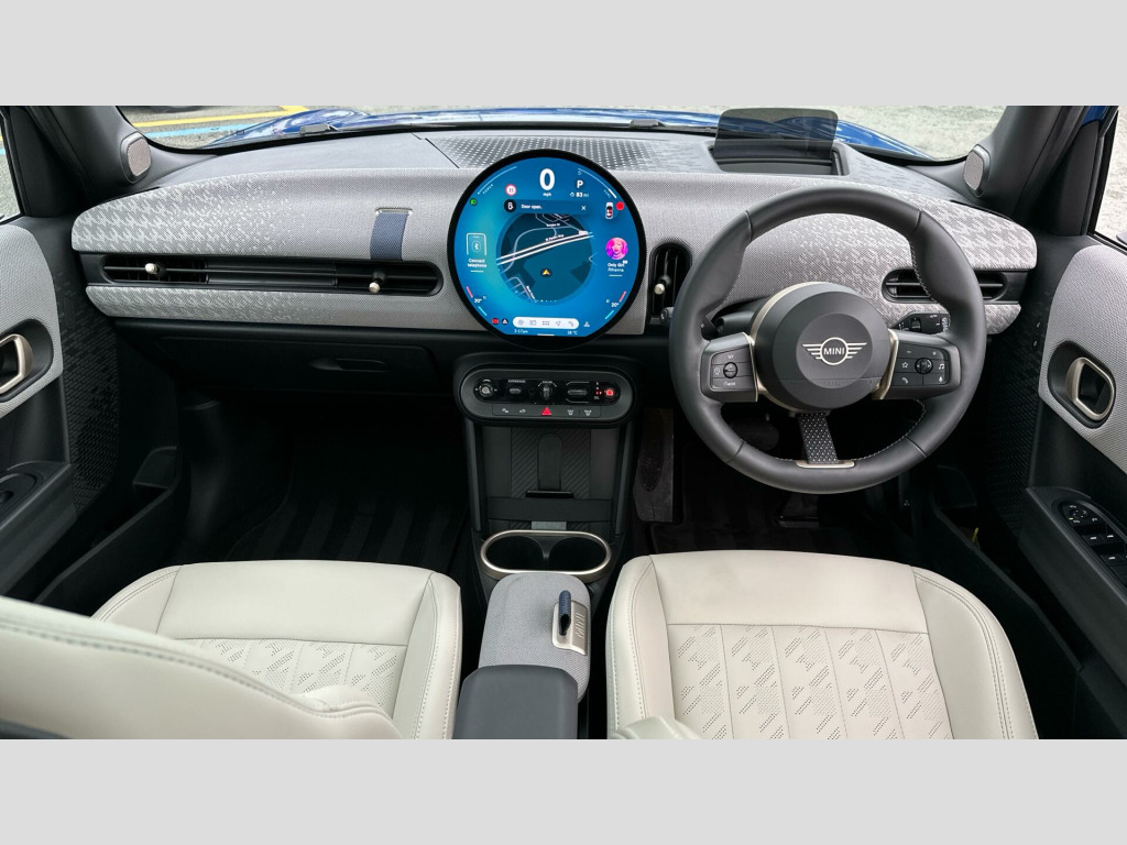 MINI Cooper C Exclusive in Icy Sunshine Blue with Vescin Beige interior. Spec includes Level 2, Exclusive Trim Content, Panoramic Glass Sunroof, Comfort Access, Adaptive LED Headlights, High-Beam Assistant, Harman/Kardon Surround Sound Audio, MINI Head-up Display, Storage for wireless charging, DAB Radio, Apple Carplay, Smartphone Integration, Circular OLED Screen, MINI Experience Modes, Parking Assistant, Front and Rear Parking Sensors, Reverse Camera, Electric Folding Mirrors, Rear-view Mirror with Auto dimming, Heated Steering Wheel, Sport Steering Wheel, Heated Front Seats, John Cooper Works Sport Seats, Roof and Mirrors Caps in White, Sun Protection Glass, 18'' Night Flash Spoke 2-tone Alloy Wheels.. EU6 RDE II exhaust emissions standard, Automatic DCT Transmission, Tyre Repair Kit, MINI Experience Modes, Child seat i-Size attachment for front p, Driving Assistant, Active Guard, Parking Assistant, BMW TeleServices, BMW Emergency Call, Personal eSIM, Circular OLED Screen, DAB Radio, COC additional contents, Active Pedestrian Safety, English / on-board literature II, 18'' Night Flash Spoke 2-tone, Sports steering wheel, Heated Steering Wheel, Comfort Access, Roof and Mirrors Caps in White, Anthracite Roof Lining, John Cooper Works sport seats, Panoramic Glass Sunroof, Sun Protection Glass, Ext. mirrors- folding with anti-dazzle, Rear-view Mirror with Auto dimming, Heated front seats, High-Beam Assistant, Adaptive LED Headlights, MINI Head-up Display, Storage for wireless charging, Harman/Kardon Surround Sound Audio, Exclusive Trim Content, Exclusive, Level 2.