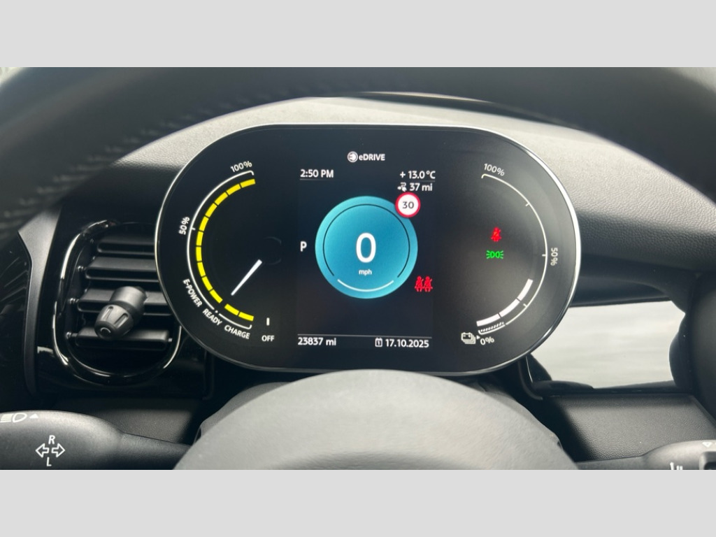 MINI Hatchback 135kW Cooper S Level 2 33kWh 3dr Auto Brake energy recuperation toggle switch with two settings, Compatible mobile phone bluetooth with audio streaming, Cruise control, Digital instrument cluster, Electro-mechanical speed dependant steering assistance, Flexible car sharing preparation, MINI Driving Modes - centre toggle switch to control driving setting (sport, mid and green), On board computer, Rear park distance control, Rear view camera, Service interval indicator, Automatic transmission, Electric front motor installed drives front wheels, Performance Control, 4 speakers in front door trims and underneath front seats, FM tuner and DAB digital radio, Auto dimming and folding door mirrors, Auto headlights, Automatic headlight activation switch, Bonnet scoop, Charging flap embossed with e logo in body colour on drivers side rear panel includes LED light indicating charging status, Dynamic brake lights, Electric front+rear windows, Heated rear window, Heated windscreen washer jets, LED headlight with closed ring and daytime driving lights, Metal door sill strips with Cooper S in yellow, MINI logo projection, Model logo Cooper S in yellow on right of tailgate, Radiator grille including E badge, Rain sensor window wipers, Rear fog lights, Rear LED lights with union jack design, Rear window wiper, Side scuttle panel with integrated indicator with E badge, Third brake light, White indicator lenses, 12V Accessory socket in centre console, 2 seat bench in second row, 2 zone automatic air conditioning, 3 spoke sports multifunctional leather steering wheel with integrated controls for cruise control, brake function + audio/communication, 3 stage heated front seats, 4 lashing eyes in luggage compartment, 60/40 split folding rear seat, AC and DC charging, Ambient lighting, Anthracite headlining, Black velour floor mats, Chrome interior highlights, Cloth/leatherette upholstery with sport seats, Cupholders, Front and rear head restraints, Front and rear isofix with front passenger airbag deactivation, Front centre armrest, Glove compartment, Heat pump, Height adjustable passenger seat, Height and length steering column adjustment, Interior lighting in front of headliner, LED waterfall lighting in orange roof control panel, Luggage compartment lighting, Manual adjustment for thigh rests, Mechanical seat adjustment, driver seat height adjust, forward/back and front seats backrest, Single front passenger seat, Storage compartments in doors, Storage pocket on back of front seats, Sunvisors with vanity mirrors, Two charging cables - 3 pin plug adapter (mode 2) and AC public charging (mode 3), Interior light pack - Mini Electric Hatchback, Navigation pack with Driving Assistant - Mini Electric Hatchback, Storage compartment pack - Mini Hatchback electric, 3 point seatbelts on all four seats, 6 Airbags - front, side, head and seat belt tensioners, Acoustic pedestrian protection, Anti-lock braking system (ABS), DSC - Dynamic Stability Control, Electronic parking brake, Front and rear disc brakes, Two tone horn, Tyre pressure monitoring system, Warning triangle and first aid kit, Alarm system with tilt sensor, monitoring doors, bonnet interior and tailgate, Comfort access system, Electronic vehicle immobiliser, Start/stop toggle in yellow, Piano black interior trim, Surface chequered black interior trim, Tool kit, Tyre repair kit
