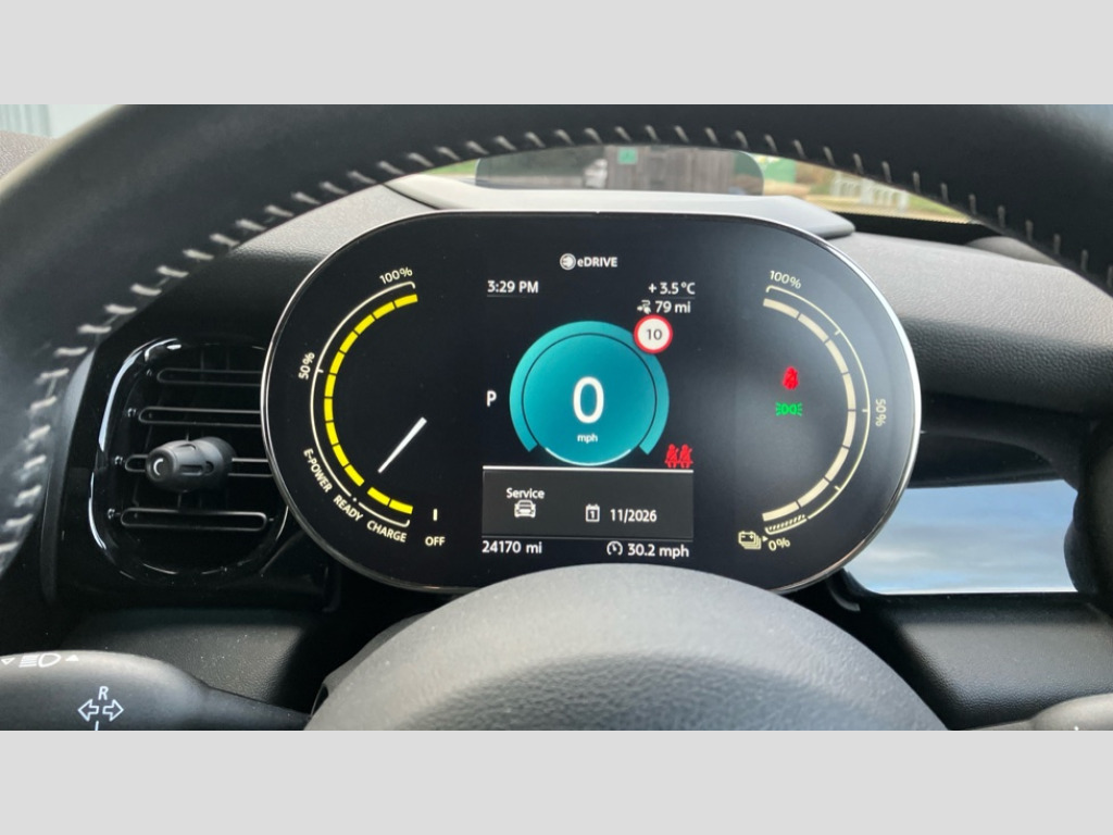 MINI Hatchback 135kW Cooper S Level 3 33kWh 3dr Auto Brake energy recuperation toggle switch with two settings, Compatible mobile phone bluetooth with audio streaming, Cruise control, Digital instrument cluster, Electro-mechanical speed dependant steering assistance, Flexible car sharing preparation, Front park distance control, MINI Driving Modes - centre toggle switch to control driving setting (sport, mid and green), On board computer, Park assist system, Rear park distance control, Rear view camera, Service interval indicator, Automatic transmission, Electric front motor installed drives front wheels, Performance Control, 4 speakers in front door trims and underneath front seats, FM tuner and DAB digital radio, Harman Kardon sound system, Adaptive LED Headlights with matrix function, Auto dimming and folding door mirrors, Auto headlights, Automatic headlight activation switch, Bonnet scoop, Charging flap embossed with e logo in body colour on drivers side rear panel includes LED light indicating charging status, Dynamic brake lights, Electric front+rear windows, Electric panoramic glass sunroof, Heated rear window, Heated windscreen washer jets, LED daytime running lights, Metal door sill strips with Cooper S in yellow, MINI logo projection, Model logo Cooper S in yellow on right of tailgate, Radiator grille including E badge, Rain sensor window wipers, Rear fog lights, Rear LED lights with union jack design, Rear window wiper, Side scuttle panel with integrated indicator with E badge, Third brake light, White indicator lenses, 12V Accessory socket in centre console, 2 seat bench in second row, 2 zone automatic air conditioning, 3 spoke sports multifunctional leather steering wheel with integrated controls for cruise control, brake function + audio/communication, 3 stage heated front seats, 4 lashing eyes in luggage compartment, 60/40 split folding rear seat, AC and DC charging, Ambient lighting, Anthracite headlining, Black velour floor mats, Chrome interior highlights, Cupholders, Front and rear head restraints, Front and rear isofix with front passenger airbag deactivation, Front centre armrest, Glove compartment, Heat pump, Height adjustable passenger seat, Height and length steering column adjustment, Interior lighting in front of headliner, LED waterfall lighting in orange roof control panel, Luggage compartment lighting, Manual adjustment for thigh rests, Mechanical seat adjustment, driver seat height adjust, forward/back and front seats backrest, Single front passenger seat, Storage compartments in doors, Storage pocket on back of front seats, Sunvisors with vanity mirrors, Two charging cables - 3 pin plug adapter (mode 2) and AC public charging (mode 3), Walka Nappa steering wheel, Interior light pack - Mini Electric Hatchback, Navigation plus pack with Driving Assistant - Mini Electric Hatchback, Storage compartment pack - Mini Hatchback electric, 3 point seatbelts on all four seats, 6 Airbags - front, side, head and seat belt tensioners, Acoustic pedestrian protection, Anti-lock braking system (ABS), DSC - Dynamic Stability Control, Electronic parking brake, Front and rear disc brakes, Two tone horn, Tyre pressure monitoring system, Warning triangle and first aid kit, Alarm system with tilt sensor, monitoring doors, bonnet interior and tailgate, Comfort access system, Electronic vehicle immobiliser, Start/stop toggle in yellow, Piano black interior trim, Surface chequered black interior trim, Tool kit, Tyre repair kit