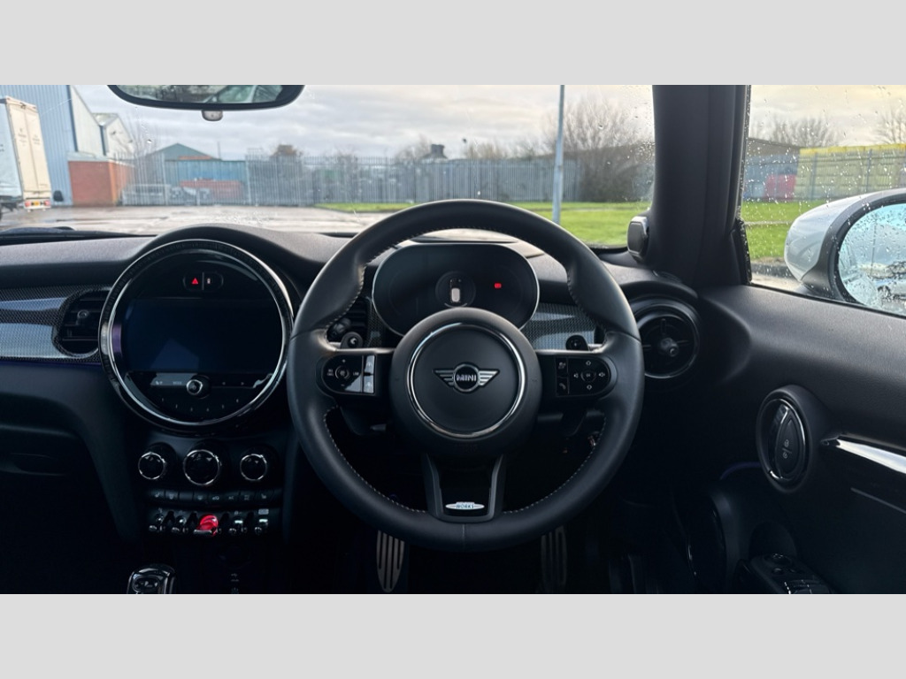 MINI Hatchback 2.0 John Cooper Works Premium Plus 3dr Auto Apple CarPlay, Automatic start/stop function with brake energy recuperation, Compatible mobile phone bluetooth with audio streaming, Digital dashboard display, Electro-mechanical speed dependant steering assistance, Flexible car sharing preparation, Instrument cluster, Mini E-call, MINI TeleServices, On board computer, Service interval indicator, Double Vanos system, Fully variable valve control, High precision injection, Performance Control, Steptronic sport transmission, 8.8" touchscreen with LED ring, FM tuner and DAB digital radio, 3rd brake light, Automatic headlight activation switch, Bonnet scoop, Dynamic brake lights, Electric front windows, Heated rear window, Heated windscreen washer jets, JCW Aerodynamic kit - Front and rear bumpers with sporty JCW styling and part-painted side sills with MINI John Cooper Works door sill finishers, John Cooper Works logo above an individual grille strut in Chilli Red, John Cooper Works rear spoiler, LED headlight with closed ring and daytime driving lights, Rain sensor window wipers, Rear fog lights, Rear LED lights with union jack design, Rear window wiper, Side scuttle panel with integrated indicator, Side scuttle with MINI John Cooper Works logo in black high-gloss with red border, Sun/heat protection glass, White indicator lenses, 12V Accessory socket in centre console, 2 seat bench in 2nd row, 4 lashing eyes in luggage compartment, 60/40 split folding rear seat, Anthracite headliner including grab handles and clothes hooks, Chrome interior highlights, Cupholders, Front and rear isofix with front passenger airbag deactivation, Front floor mats in velour, Glove compartment, Height and length steering column adjustment, Integrated headrests, adjustable thigh support for seats, Interior lighting with 12 different colours across the dashboard, underneath door bezel with illuminated laser-engraved design on central display, Leatherette gearshift lever and handbrake gaiters, LED reading lights, vanity mirror lights, front foot well light and spotlight on front seats, Mechanical seat adjustment - forward/back & backrest for front seats and driver seat height adjust, Multifunction steering wheel, Passenger seat height adjuster, Rubberised stainless steel pedals, Single front passenger seat, Storage compartments in doors, Storage pocket on back of front seats, Sunvisors with vanity mirrors, Walknappa leather steering wheel with grey seam and John Cooper Works badge on Piano Black lower steering wheel spoke, Piano black exterior pack - JCW, Premium plus pack - Hatchback JCW, 17" sport brake 4-piston fixed-calliper brakes front, 3 point seatbelts on all four seats, 6 Airbags - front, side, head and seat belt tensioners, Anti-lock braking system (ABS), DSC - Dynamic Stability Control, Front and rear disc brakes, Red brake callipers with John Cooper Works logo, Single tone fanfare horn, Tyre pressure monitoring system, Alarm system with tilt sensor, monitoring doors, bonnet interior and tailgate, Electronic vehicle immobiliser, Start/stop toggle with keyless go, Tool kit