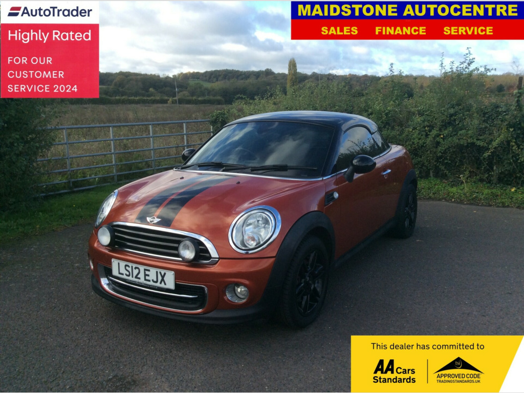 This 2012 Mini Coupe 1.6 Cooper 2dr Petrol Manual Euro 5 has low mileage and comes with a new 12 Month MOT. This car runs on petrol and is ULEZ compliant, ensuring it meets low emission standards. For our full stock list please visit our website: www.maidstoneautocentre.co.uk. Since some cars are stored off-site, kindly give us a call before your visit to confirm the car's availability. All our cars come with a 12-month AA breakdown cover, and various finance and extended warranty packages are also available. in alloy wheels - light 7-hole, body coloured fuel filler cap in rear right side panel - linked to central locking, chrome strip across lower front apron, door handles - chrome plated, door mirrors - electrically adjustable, door mirrors - electrically adjustable and heated, electric windows - front - one touch up and down, embellisher at bottom edge of all windows - chrome plated, exhaust tailpipe - visible round right with chrome finisher, headlights - chrome bezels, heated front windscreen washer jets, heated mirrors and windscreen washer jets, heated rear window with automatic deactivation, mini mobility system, multiple control arm rear axle, roof spoiler painted in roof colour, security locking wheel bolts, side air inlets black with integrated white indicator, sills-bumper edges-wheel arches - black with model-specific bumper trims, spoiler - active rear (speed related), sport stripes - black, tailgate handle - chrome plated, white direction indicators lights, 3-spoke sport leather steering wheel, air conditioning - manual, anthracite headlining, automatic door window lowering by approx 6mm when door opens, car jack, cupholders - two in front, decorative rings surrounding dashboard instruments, door handles - interior - chrome plated, door sill finishers - metal look and model dependent lettering, external visible vin, gearshift-selector lever and handrake lever gaiters in sensatec, handbrake-lever grip - plastic with chrome plated handbrake push button, headrests for all seats - manually adjustable, heater with mechanical control and recirculating-air button, interior mirror - mechanical anti-dazzle, interior surface in fine white silver and door rings in black, interior world - carbon black, interior lights - integrated into centre front headliner including two reading lights, knee roll - in leather on dashboard in dark truffle, lashing eyes in luggage compartment, luggage compartment - light, luggage compartment - partition with large through-loading door, microfilter, non smoker package, passenger seat height adjustable, personal profile, seats - height adjustable drivers, steering column height and length adjustment, storage options in the trim panels of each front panel as well as centre console, sun visors with integrated vanity mirrors on drivers and passengers sides, tool kit in luggage compartment, 3rd brake light, halogen lights for low beam and high beam headlights, headlight - beam-throw control electrical with manual adjustment, headlights - follow me home, asc+t - automatic stability control and traction, airbags - driver, airbags - front passenger, airbags - front passenger with deactivation switch, airbags - head and thorax, alarm - thatcham cat1, anti-lock braking system - abs, cbc - cornering brake control, central locking - remote, crash sensor - fuel cut-off, dynamic stability control - dsc, ebd - electronic brake-force distribution, hill assist, remote controlled alarm system, second radio remote key, aux-in connection, dab tuner, radio boost cd, brake energy regeneration- igr, brake force display, brake pad wear indicator, electronic power steering - speed related, minimalism fuel saving technology, pdc - park distance control - rear, single joint spring strut front axle, sport button, tpws - tyre pressure warning system