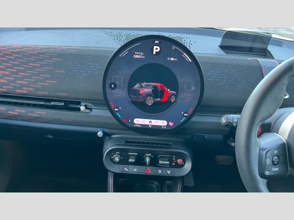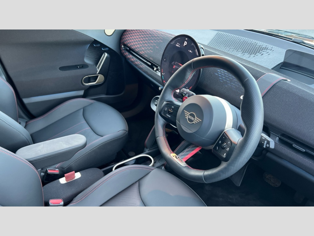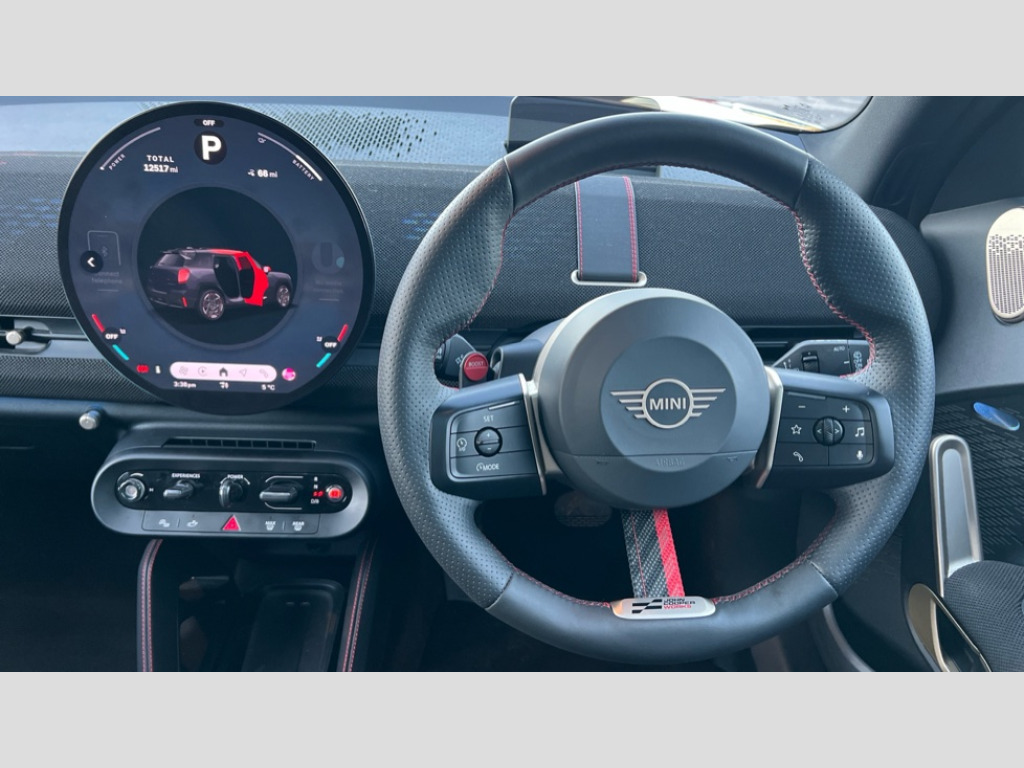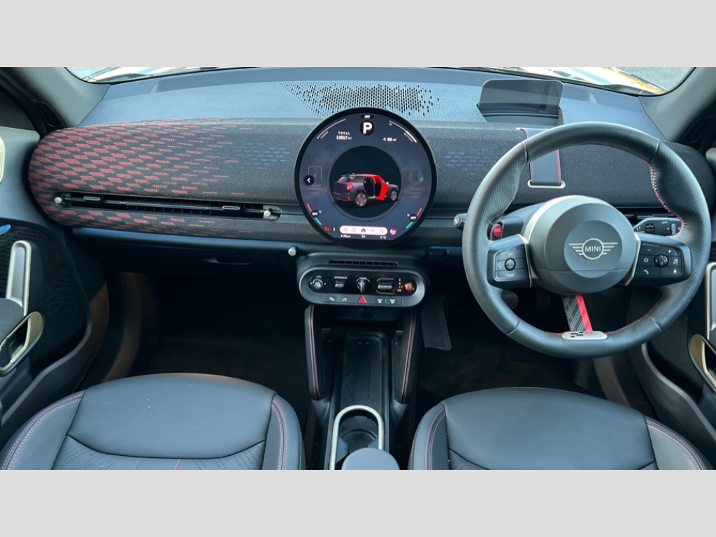 MINI Aceman 190kW John Cooper Works 54kWh 5dr Auto Circular OLED Screen, Cruise control, Driving assistant, Electro-mechanical speed dependant steering assistance, Emergency call service, Intelligent Personal Assistant, JCW Experience mode, MINI Experience Modes, Mini navigation system, MINI operating system 9, On board computer, Parking assistant, Rear view camera, Service interval indicator, 11kW AC charging, Automatic transmission, DC Rapid charging, Mode 3 cable, DAB Digital radio, Harman Kardon sound system, Personal eSim, Adaptable light signature, Auto headlights, Electric adjustable heated door mirrors, Electric front+rear windows, Front and rear apron, Heated rear window, Heated windscreen washer jets, High gloss hexagonal patterned grille surround, JCW logo projection, LED daytime running lights, LED indicator lights, LED rear lights, Rain sensor window wipers, Rear roof spoiler with airblades, Rear side wing doors, Rear window wiper, Roof rails, Third brake light, 3 seat bench in 2nd row, 60/40 rear seat bench, Ambient lighting, Automatic air conditioning, Black lower band in high gloss, Cupholders, Dark headliner, Floor mats, Front and rear head restraints, Front compact armrest, Heated steering wheel, Height adjustable passenger seat, JCW steering wheel, Lidded storage box in Black/Red knit, Single front passenger seat, Sport seats, Stainless steel pedals, Sunvisors with vanity mirrors, Vescin/Cloth upholstery, Level 1 pack - Mini Aceman, 3 point seatbelts on all seats, 6 Airbags - front, side, head and seat belt tensioners, Acoustic pedestrian protection, Anti-lock braking system (ABS), Child locks on rear doors, DSC - Dynamic Stability Control, Electronic parking brake, Front and rear disc brakes, Front ISOFIX (iSize), Front passenger airbag deactivation, JCW sport brake with chilli red caliper, Traction control, Tyre pressure monitoring system, Alarm, Immobiliser, Remote central locking, Black/Red decorative dash strap, JCW Black/Red dashboard knit, Tyre repair kit