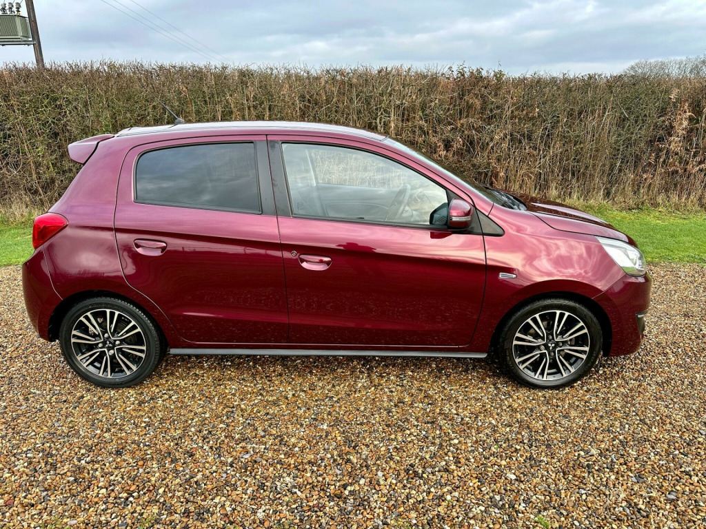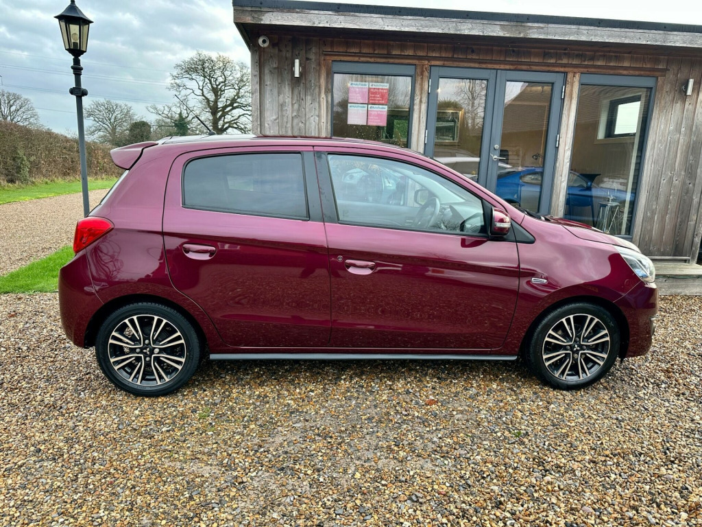 Here we have a fabulous low mileage example of the popular little Mitsubishi Mirage Juro presented in Stunning Purple Berry metallic with contrasting Grey cloth upholstery. Only 2 private owners from new the car has been lovingly cared for throughout and looks absolutely fantastic in this colour combination ( definitely one of my favourites!! ).It boasts a responsive 1.2 litre petrol engine and meets the Euro 6 emission standards. For your convenience, this high specification Juro model comes equipped with rear parking sensors to assist with manoeuvring, automatic headlights that activate when needed, and a keyless entry system for effortless access. Inside, you'll appreciate the climate control air conditioning, ensuring a comfortable cabin temperature in all conditions, and the striking Bi-Xenon HID headlamps for enhanced visibility.HPI clear t comes with full main dealer Service history ( 8 Stamps incredibly!! Including hard copies ) , a long MOT , all books and both keys representing excellent value for money for such a clean example with great provenance.Good luck with your search, thank you for viewing this car. *NOW SOLD* bric - black, 12v accessory socket - centre console, 15in alloy wheels - twotone diamond cut effect, abs with ebd, active stability and traction control, aerial - roof mounted, air conditioning - climate control, air outlet trim - silver, airbags - front passenger deactivation switch, airbags x6 front - side and curtain, assist grips - retractable, aux connection, average fuel consumption display, bluetooth with audio streaming, brake assist, bumpers - colour keyed - front and rear, carpet including luggage area, central door locking, centre multi-info display, child proof rear door locks, colour keyed mirrors and handles, cruise control, cup holders - front - in floor console, cup holders - front and rear, dab digital radio, dashboard tray - passenger side, dashboard trim - gloss black, daytime running lights - led, demister - rear, door ajar warning light, door handles - interior - silver, door pockets - front, door sashes - black, eps electronic power steering, ess - emergency stop signal system, electric folding mirrors with indicators, electric windows - front and rear, electric windows - switch panels - gloss black, engine start-stop button, exterior temperature display, fog lamps - front and rear, footrest - drivers, front grille - black, gear knob - leather wrapped - black, glovebox, hsa - hill start assist, head restraints - height adjustable 2nd row, head restraints - height adjustable front, headlamps - bi-xenon hid, headlights - automatic light sensor, headlights - levelling adjustment (manual), high contrast meter, high mount brake light, iso-fix child seat mountings - 2nd row x2, immobiliser, interior light - front, keyless operation system, led rear lamps, lights on warning buzzer, locking wheel nuts, luggage area light, luggage cover - fixed, luggage floor box, needle punch floor carpet, odometer-trip meter, parking sensors - rear, pollen filter, privacy glass - rear side and rear windows, rise - reinforced impact safety evolution - body safety system, radio-cd with mp3 compatibility and 4 speakers, rear view mirror - manual dimming, seat height adjustment - driver, seatbelt fastening warning light, seatbelts - 3-point - front x2, seatbelts - 3-point - second row x3, seatbelts - pre-tensioners front, seats - 60-40 split rear, seats - front slide and recline adjustment, seats - heated front, side air dams - black, spoiler - rear colour keyed, steering lock, steering wheel - audio controls, steering wheel - leather, steering wheel - tilt adjustable, sunvisors - front with vanity mirrors, tpms - tyre pressure monitoring system, tachometer, towing hook - front, tyre inflation kit, usb connection, wipers - automatic rain sensor, wipers - intermittent with washer - rear, wipers - variable intermittent with washer - front, ipod compatibility