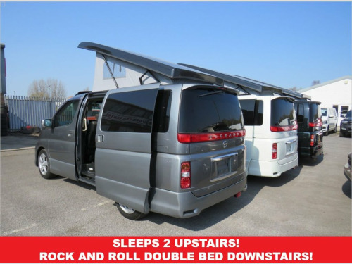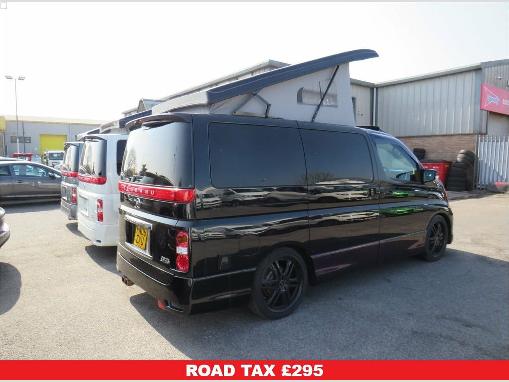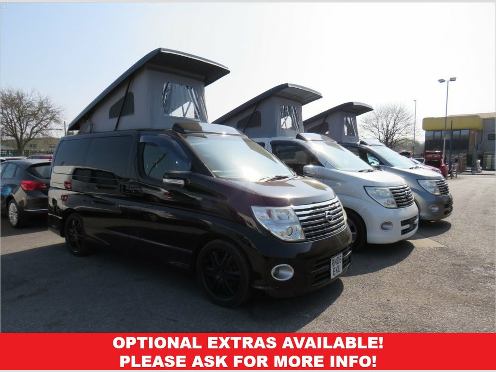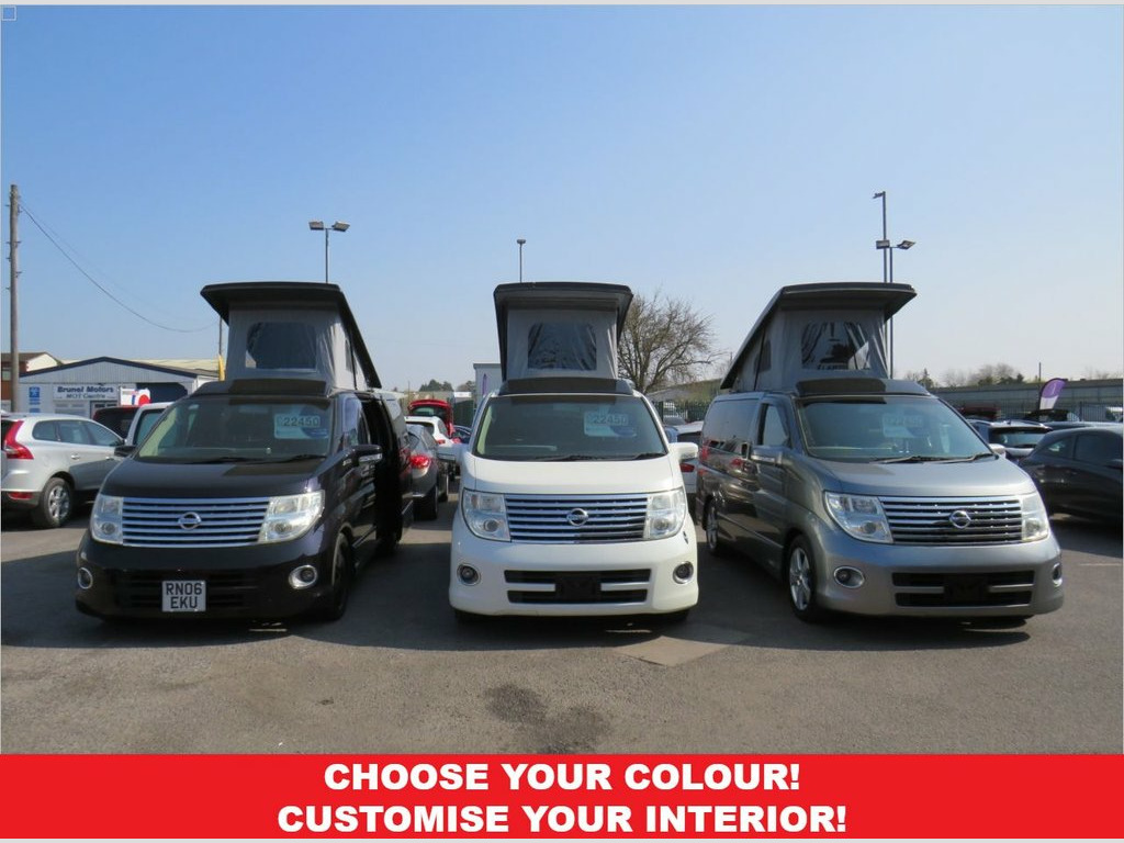 Exterior Colours available - BLACK - WHITE - GREY. You get to choose the colour of your interior design. The camper sleeps 4 people and has a built in cooker, fridge, sink, Curtains and LED Lighting. The bed in the back of the camper doubles as a bench seat for two rear passengers. The pop up roof has space for two people to sleep with zip up windows and ventilation. The Camper is based on Nissans excellent Elgrand platform which includes a 2.5 ltr V6 petrol engine and an automatic transmission. Road tax is £295 per year. THREE MONTHS WARRANTY INCLUDED ALL VEHICLES FULLY HPI CLEAR EXTENDED WARRANTY PACKAGES AVAILABLE
