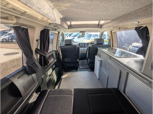 The dramatic front grille facade of the Nissan Elgrand introduces it as one of our more extravagant base vehicles. It is only equalled by the stylish Toyota Alphard and latest Vivaro/Trafic models.  Built to a slightly longer wheelbase than some other mid-sized Campervans it is sure to turn heads on a daily basis with its chunky external appearance. A bigger presence is a nod to its larger V6 engine also found in the Nissan 350z roadster. This is a versatile luxury people carrier, usually fitted with aircon, alloys, electrics, an electric sliding door and a tailgate rear door. Awnings, cycle carrier towbars or other accessories can also be added, please contact us for details.   Pop Top Roof, Seats 4, Sleeps 4, Built in Cupboards and clever storage so, Toilet Facilities: Port Potti Storage Cu, Finished Wood Surfaces, LED Lighting, 12v Leisure Battery System, 240v Mains Electric Hook Up, Gas Box, Freshwater System, Curtains, Pop Up Table, Alloy Wheels, Silver Screens, Air Conditioning, Tinted windows, Twin Sliding Doors