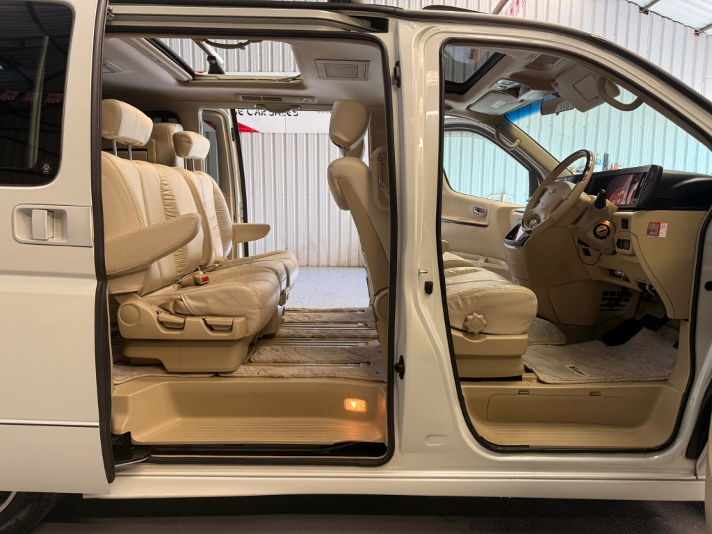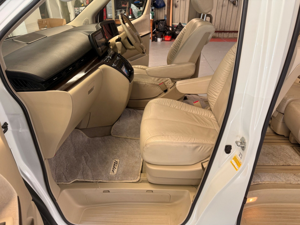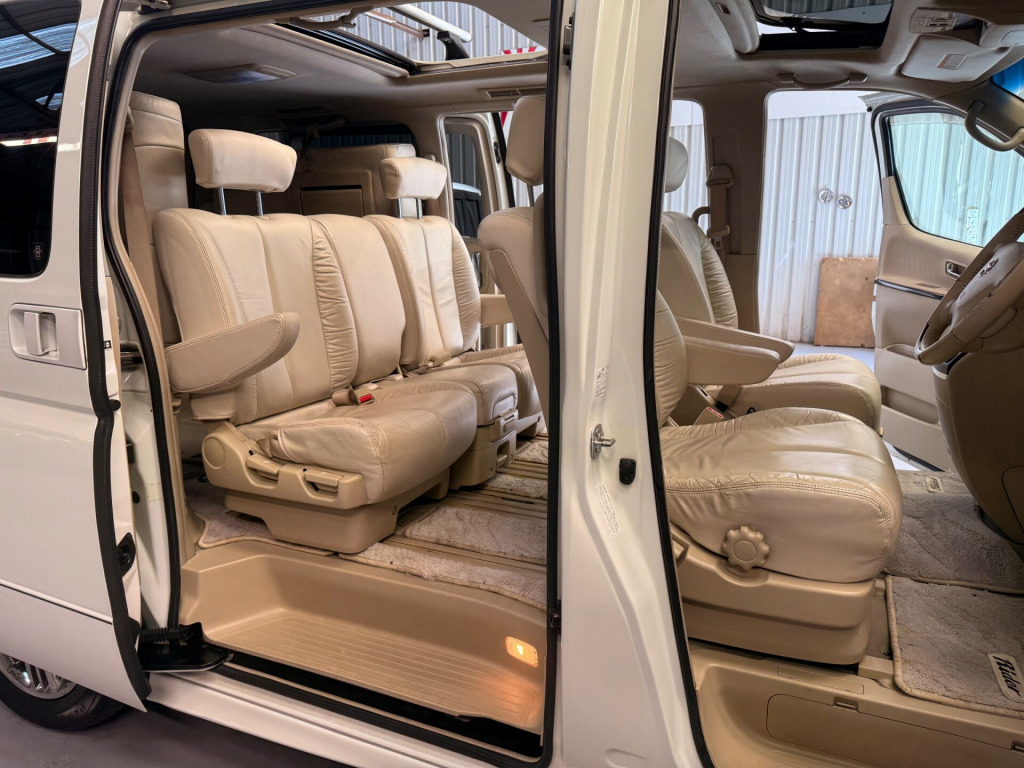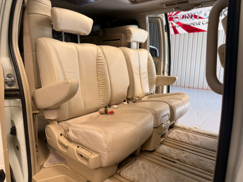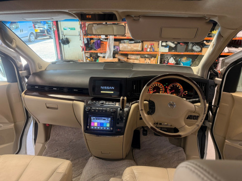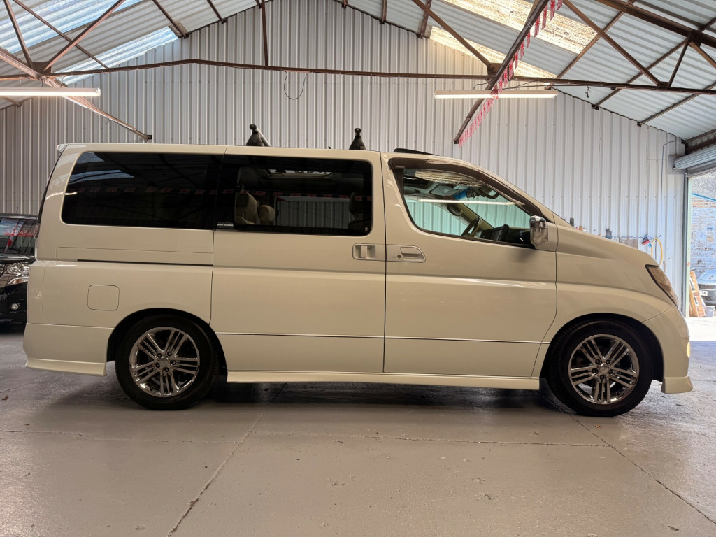 Nissan Elgrand Autech Rider 3.5 V6 Auto 2005-05-Reg, Pearlescent White Paintwork, 17'' Chrome Rider Alloys, Autech pack, Full privacy glass, Twin Sunroofs. The rear sunroof is a electric moon roof, rear spoiler with built in brake light and colour reversing camera, front spots, Fold away wing mirrors with l.e.d indicators and chrome covers, Clear Rider back lights, Roof bars, 8 Seater, 8 Beige Leather seats, The front seats have armrests, The centre seats are fully rotational, The centre seat converts into a sliding table, The rear seats fold to the side to give way to a huge boot, Air-Con Climate Control, Rear Air con and climate, BOSE Sound System with UK stereo Rear Monitor to watch dvds, Imported by ourselves in 2020, Will come with a fresh 12 months m.o.t 80,000 Miles Nationwide Delivery Service Available r conditioning, bluetooth connection, climate control, colour satnav, door mirrors electrically foldable, dual climate zones, dvd player, full leather, usb/ipod interface, xenon headlamps, parking camera, power steering, abs, air bag, child locks, passenger airbag, twin air bags, alarm, anti-theft system, central locking, keyless entry, privacy glass, remote central locking, electric front windows, electric mirrors, electric sliding doors, electric windows, rear electric windows, 3rd party sound system, bose, cd player, radio, radio/cd, steering wheel audio controls, video entertainment system, front armrest, front head restraints, folding rear seats, rear armrest, rear headrests, 2 zone climate control, 3 zone climate control, electric sunroof, twin sunroofs, alloy wheels, auto lighting, body coloured bumpers, colour coded body, front fog lights, led foglights, led indicator lights, led rear lights, pearlescent paint, rear spoiler, rear wash/wipe