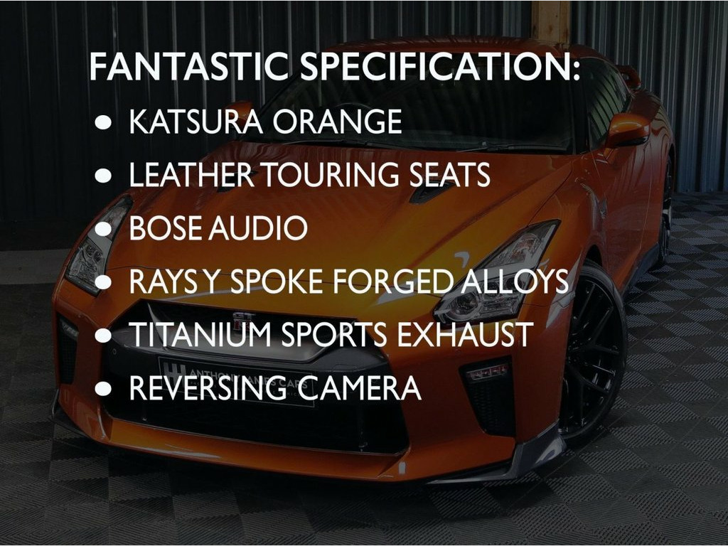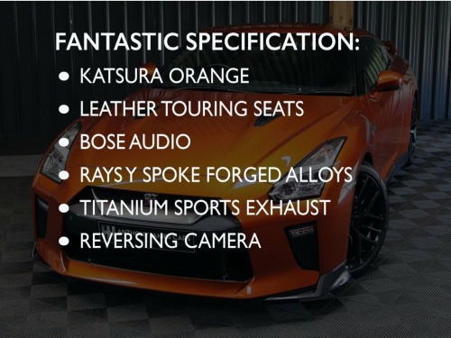 This stunning 2019 (69) low mileage Nissan GTR presented in the best colour (and launch colour) Katsura Metallic Orange. The Prestige Edition takes the recaro edition and adds High quality leather touring seats and leather interior. example has been cherished its whole life and comes as it was out of the factory in completely original specification, with no mechanical or cosmetic modifications. With an amazing service history (see below) and comes with 12 months warranty and you can tell by the condition this car has been well loved. We've the additional joy of having sourced it and sold it to its previous owner Service History: Nissan Aberdeen 26-08-2021 2171 miles RB Motorsport Lancs 21-09-2022 5603 miles RB Motorsport Lancs 01-05-2024 11360 miles Knight Racer GT-R. 20-05-2025 21490 miles With a Legacy in racing beginning in 1979 and equal to that of Porsche, over forty years of Motorsports legacy is in every Nissan GT-R, from the hand-built twin turbo 3.8-litre V6 engine, with a huge 562bhp and 469lb ft of torque, promising 0-62mph of just 2.8secs, and its top speed is 196mph. It's hand-built titanium exhaust to the six-speed sequential dual-clutch transmission that performs gear changes in just 0.15 seconds. Having the World's first Independent all-wheel-drive transaxle putting the power where needed instantly, to the race bred aerodynamics, surely the GTR is the ultimate daily supercar? Anyone, Anytime, Katsura Orange, 12v Power Sockets x2, 20in Alloy Wheels - RAYS Y Spoke Forged, 8 Way Power Driver Seat and 4 Way Passen, ABS with EBD and Brake Assist, Active Noise Cancellation, Active Sound Enhancement, Aluminium Plate Engraved with the Takumi, Apple CarPlay, Asymmetrical Suspension Setup, Automatic Air Conditioning with Dual Zon, Bilstein DampTronic System with Three Dr, Body Coloured Rear Spoiler with Integrat, Body Construction with Front and Rear Cr, Bose Sound System with 11 Speakers, Carbon Fibre Trimmed Centre Console, Cruise Control with Speed Limiter, Darkended Front Grille and Bumper, Downshift Rev Matching, Driver-Passenger-Side and Curtain Airbag, Dual Illuminated Visor Vanity