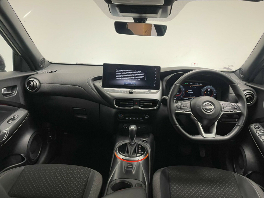 This 2024 Nissan Juke DIG T N Connecta is a superb example, having had only one owner since new. This stylish compact SUV is powered by an efficient 1.0 litre petrol engine, meeting Euro 6 emissions standards. The N Connecta trim level offers a host of desirable features designed to enhance your driving experience, including automatic climate control to keep you comfortable in all conditions. Stay connected and entertained with seamless integration of Apple CarPlay and Google Android Auto. Parking is made simpler with front and rear parking sensors, complemented by a rear view camera for added confidence.With a highlight fuel economy of 46 miles per gallon, this Juke offers an economical choice for your motoring needs, alongside its low CO2 emissions. These highlights demonstrate how this particular Nissan Juke stands out from others in its class, offering a blend of efficiency, technology, and convenience. .3in full colour tft screen combimeter, 17in alloy wheels, 3 adjustable rear head restraints, 6 speakers, 60-40 split folding rear seats, abs with ebd and brake assist, active ride control, active trace control, airbag - driver, airbag - front passenger, apple carplay and google android auto, auto dimming rear view mirror, automatic climate control, automatic hazard signal and emergency stop signal, bluetooth connectivity with usb a+c ports, cabin light front and rear, card holder on drivers sun visor, cruise control and speed limiter, dab radio, door handles body coloured, drive modes - sport-normal-eco, driver and passenger sun visor with vanity mirror, driver-passenger and rear seatbelt reminder, esp - electronic stability programme, electric handbrake with auto hold function, electronically adjustable - heated and auto folding door mirrors with integrated indicators, emergency and breakdown call, exterior mirrors painted pearl black, follow me home headlights, front armrest, front doors with bottle holders, front parking sensors, front and rear electric windows with one touch driver window, grab handles passenger and rear, height adjustable driver seat, height adjustable seatbelts, high beam assist, hill start assist, intelligent driver alertness, intelligent emergency braking with pedestrian and cyclist recognition, intelligent key and start push button with walk away lock and approach unlock functions, intelligent lane intervention, interior chrome door handles, led daytime running lights, led headlights, led rear fog light, led rear lights, lane departure warning, leather shift knob, luggage board, luggage space lighting, monoform sporty seats, multifunctional steering wheel, nissanconnect 12.3in touchscreen entertainment system, nissanconnect navigation with tomtom traffic, nissanconnect services, outside temperature sensor, power steering, puncture repair kit, rain sensing wipers, rear coat hanger - drivers side, rear console usb port, rear parking sensors, rear privacy glass, rear spoiler, rear view camera, shark fin antenna - solid black, side and curtain airbags, smooth synthetic leather steering wheel, steering wheel mounted gearshift paddles, syntech leather knee pad, tpms - tyre pressure monitoring system, telescopic steering wheel adjustment, three blink turn signal, traffic sign recognition, two cup holders in the centre console, two rear isofix child seat anchorage point with top tether, vdc - vehicle dynamic control, welcome light and console tray ambient lighting, wifi and voice recognition, windows - passenger - one touch, wireless phone charger