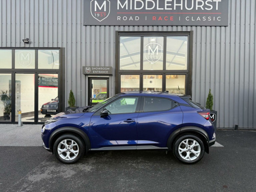 Middlehurst Road Race & Classic present this 2020/69 plate Nissan Juke 1.0 IG-T N-Connecta finished in metallic Ink Blue with grey cloth interior. It was first registered 21/02/2020 and has covered only 19,332 miles from new by its 2 registered keepers. The N-Connecta model has a great level of specification which includes some of the following features: Built in satellite navigation, reverse parking camera, keyless entry, keyless start, electrically folding mirrors and much more. (Full specification below). Serviced on 10/10/2023 at 14,153 miles by Bristol Street Nissan and 20/11/2024 at 17,271 miles by Prescot Car Centre. Supplied serviced by us with 12 months MOT and 6 months warranty.