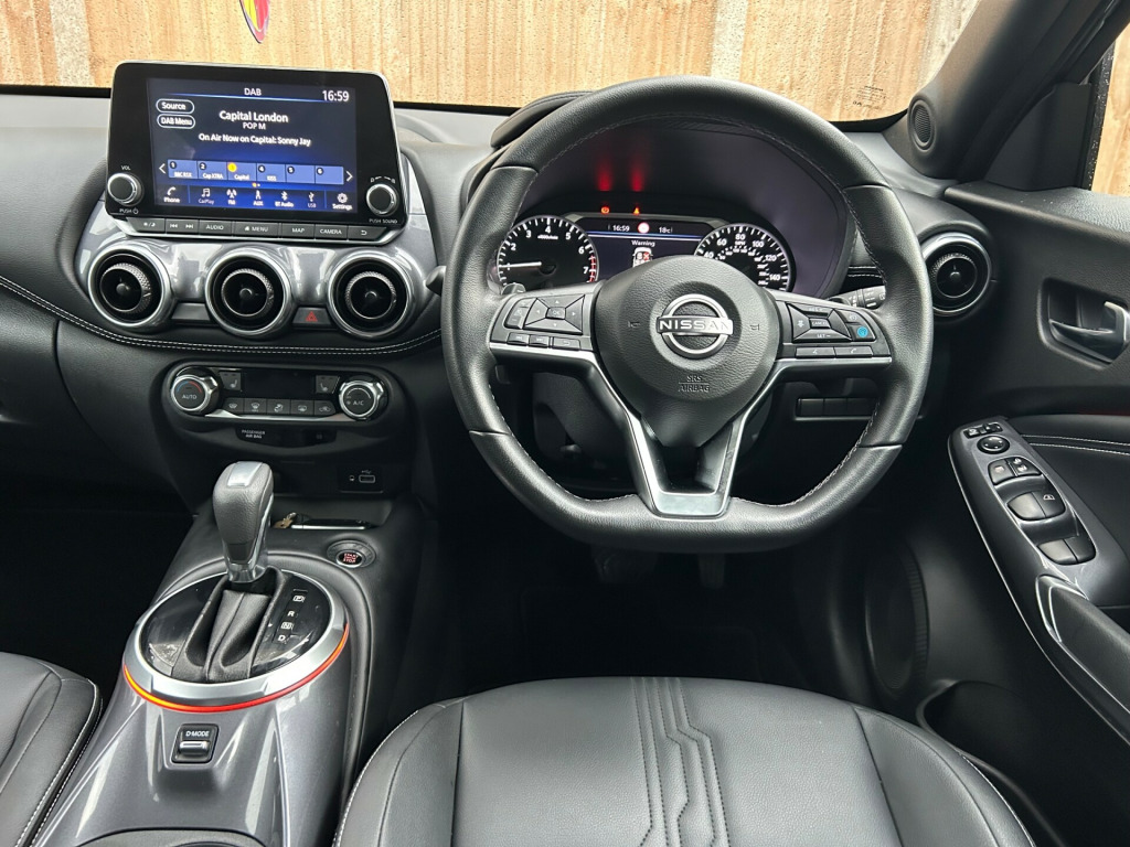 This 2022 Nissan Juke 1.0 DIG-T Tekna SUV with only 8000 miles on is a spacious and comfortable SUV that's perfect for long journeys and city driving. Its 1.0-liter petrol engine is not only powerful with 117 ps, but also ULEZ compliant, making it an eco-friendly choice. With 5 doors and 5 seats, there's plenty of room for the whole family or a group of friends. The body coloured handles and 19in alloy wheels give it a sleek and modern look, while the electric folding and heated door mirrors provide convenience and safety. Inside, the front and rear electric windows with one-touch driver window, and heated windscreen offer added comfort and ease of use. Whether you're cruising through the city or heading out on a road trip, the 2022 Nissan Juke is a reliable and stylish choice for any driver. in alloy wheels, body coloured handles, electric folding and heated door mirrors, front and rear electric windows with one touch driver window, heated windscreen, privacy glass, rear spoiler, tyre repair kit, 2 x cup holder on centre console, 3 adjustable rear head restraints, 60-40 split rear folding seats, auto dimming rear view mirror, automatic air conditioning, cabin light front and rear, card holder on drivers sun visor, chrome interior door handles, comfort pack, door ambient lighting, door and dashboard pvc embellisher, driver and passenger sun visor with illuminated vanity mirror, front armrest, front passenger one-touch electric window, front seat back pockets, front and rear door pockets with drinks bottle holders, front and rear heated seats, gear console ambient circle lighting, grab handles passenger and rear, grey synthetic leather knee pad, heat pack, height adjustable driver seat, leather gear knob, leather steering wheel, luggage board system, luggage space lighting, manually adjustable drivers seat - slide - recline and lifter, manually adjustable passenger seat - slide and recline, monoform sporty seats, multifunctional steering wheel, rain sensing wipers, rear hand grip with coat hanger, steering switch for ad1 or icc, steering wheel - paddle shift, telescopic steering wheel adjustment, three blink turn signal, welcome light and console tray ambient lighting, 7in full colour tft screen combimeter, 8in colour display with touch screen, android auto and apple carplay, bose personal sound stage controls, bluetooth - usb - aux - 12v socket, bose audio system with 8 speakers, connected services and wifi, dab radio with 4 speakers, emergency and breakdown call, nissan connect navi with tomtom traffic, rear console usb port, abs with ebd and brake assist, automatic hazard signal and emergency stop signal, driver-passenger-side and curtain airbags, esp - electronic stability programme, electric parking brake with auto hold function, front passenger isofix childseat anchorage point, front seat belt height adjustment, front and rear seatbelt reminder, hill start assist, isofix child seat anchoring points - rear x2, intelligent emergency braking with pedestrian and cyclist recognition, intelligent key with start push button, intelligent lane intervention and warning, propilot, rear cross traffic alert, vdc - vehicle dynamic control - traction control - active trace control - active ride control, around view monitor with moving object detection, blind spot warning and intervention, cruise control with speed limiter, drive modes - sport-normal-eco, intelligent driver alertness, outside temperature sensor, parking sensor - front, power assisted steering, rear parking camera, rear parking sensors, tpms - tyre pressure monitoring system, traffic sign recognition, voice recognition switch on steering wheel, headlights - follow me home function, headlights - high beam assist, led daytime running lights, led front fog lights, led headlights, led rear fog lights, led rear lights
