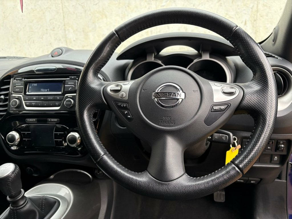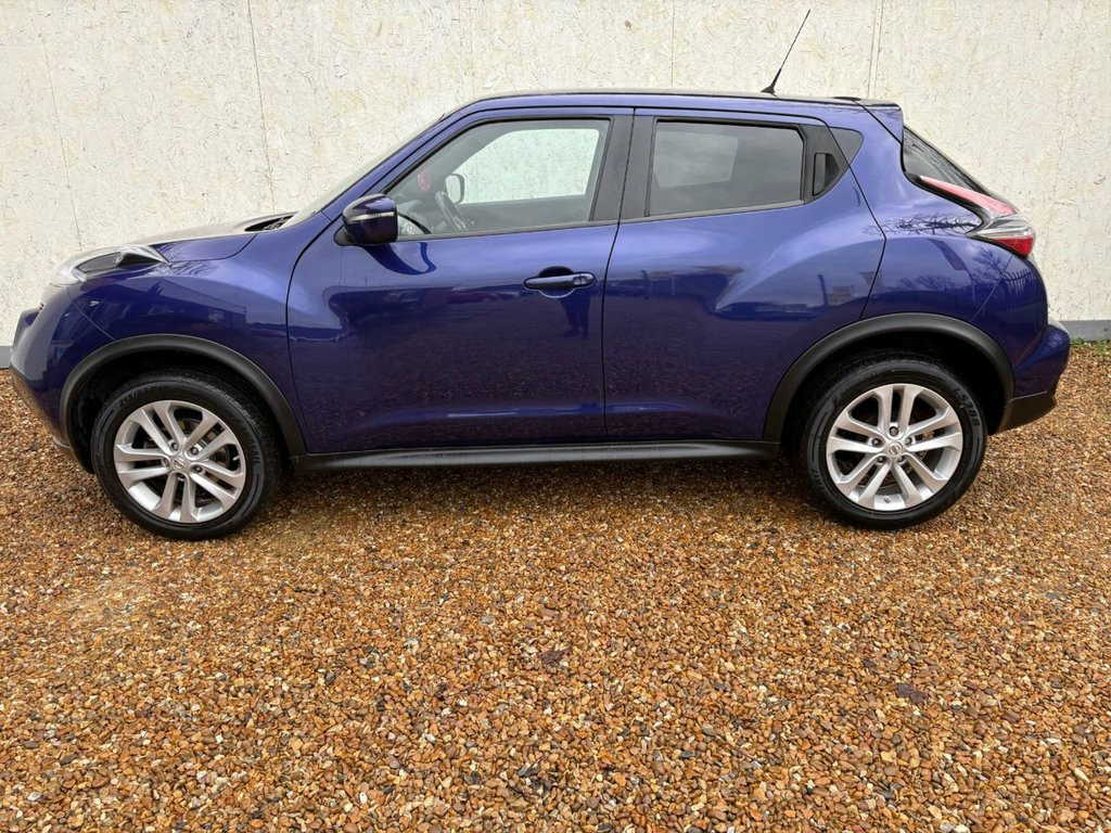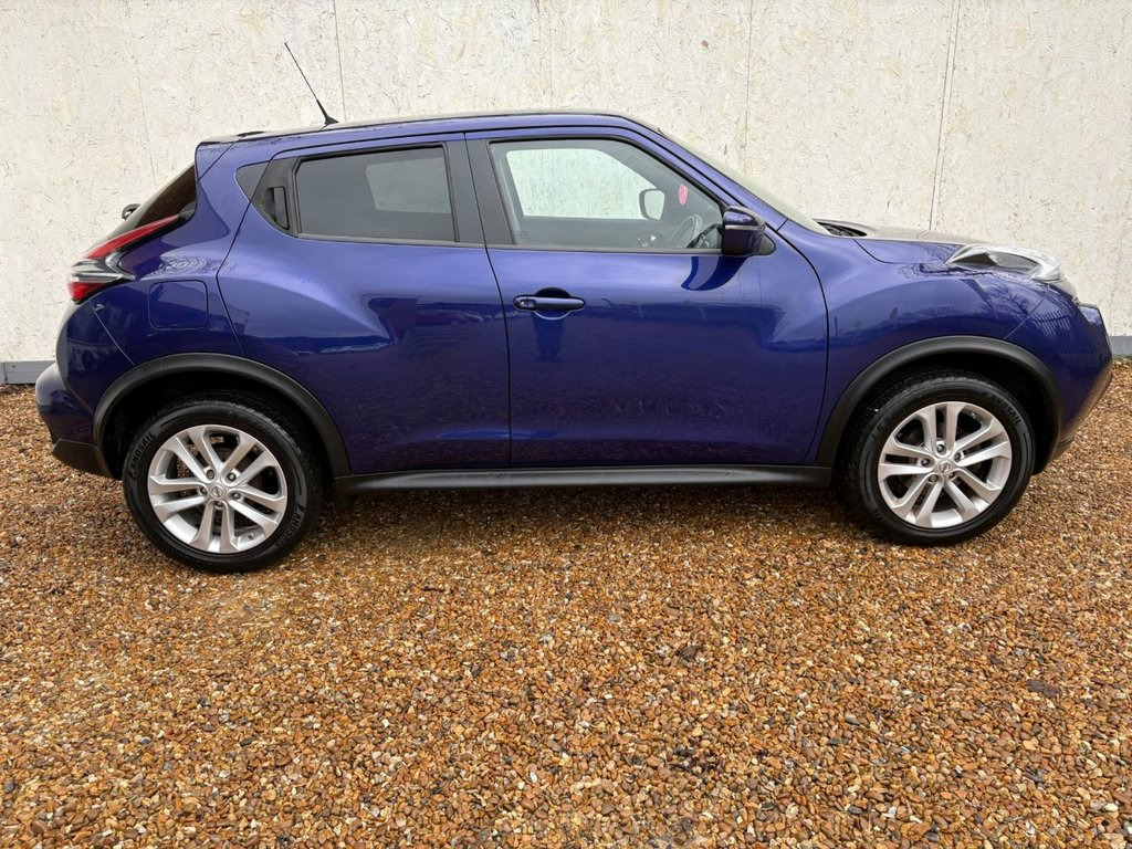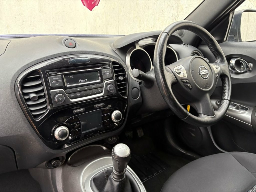 ONLY 2 OWNERS GREAT SERVICE HISTORY INCLUDING A NEW TIMING CHAIN REPLACEMENT. THIS WELL PRESENTED AND LOW MILEAGE NISSAN JUKE FINISHED IN BLUE METALLIC. COMES WITH 2 KEYS AND FEATURES INCLUDING CLIMATE CONTROL WITH AIR CONDITIONING, BLUETOOTH HANDS-FREE, RADIO/CD PLAYER WITH AUX AND USB POINT, MULTI FUNCTION LEATHER STEERING WHEEL, CRUISE CONTROL, ELECTRIC WINDOWS, ELECTRIC MIRRORS, AUTO START/STOP, 6 SPEED MANUAL GEARBOX, REMOTE CENTRAL LOCKING AND 17" ALLOY WHEELS. 12V Socket - Front, 17in Alloy Wheels - Sport, 2 Speed Wiper with Variable Intermittent, 3 Adjustable Rear Head Restraints, 60-40 Split Rear Folding Seats, AUX Socket for MP3 Player, Airbag - Driver, Airbag - Front Passenger, Airbags - Curtain, Airbags - Side, Automatic Climate Control with Pollen Fi, Body Coloured Handles, Body-Coloured Door Mirrors with LED Indi, Boot Capacity with Flexi-Floor Board, CD Radio with 4 Speakers, Chrome Interior Door Handles, Cruise Control with Speed Limiter, Drive Computer with Temperature Gauge, ESP ABS EBD and Brake Assist, Electric Adjustable Door Mirrors, Engine Immobiliser, Front Cupholders x2, Front Door Pockets with Drinks Bottle Ho, Front Fog Lights,