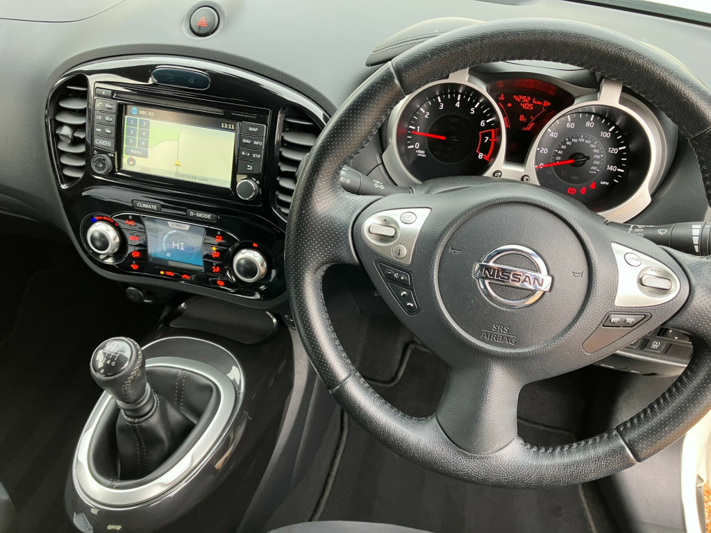 2015 '65' Nissan JUKE 1.2 N-ConnectaFinance available, please call for details.INTERIOR: Black cloth interior. Electric windows. Electric / power fold mirrors. Remote central locking, with Keyless entry & start. Power steering. Multiple air bags. Factory radio etc. Sat nav. Rear park camera. Cruise control. EXTERIOR: White paintwork, colour coded bumpers and mirrors. 17'' Nissan alloy wheels. Some marks consistent with age / value.MECHANICALS: 1197cc petrol engine. 6 speed manual gearbox. All running gear good, and the car drives superb. Recent engine service at 42k.PAPERWORK: HPI clear. Full logbook, just 1 previous owner. Current MOT expires November 30th 2026. Stamped service book, showing 4 records, most recently at 42k. All owners manuals in Nissan wallet.OVERALL: Lovely example throughout. Nice spec. Low mileage. Drives superb. Recent engine service, with a good service history. Long MOT., v socket - front, aux socket for mp3 player, dab and internet radio with 6 speakers, nissanconnect, telephone - bluetooth integration, usb port, 17in alloy wheels - sport, body coloured handles, body-coloured door mirrors with led indicators, electric folding and heated door mirrors, front and rear electric windows, puncture repair kit, rear privacy glass, 2 speed wiper with variable intermittent, 3 adjustable rear head restraints, 60-40 split rear folding seats, automatic climate control with pollen filter, black headliner, boot capacity with flexi-floor board, chrome interior door handles, front armrest, front cupholders x2, front door pockets with drinks bottle holders, front map reading lights, glovebox, height adjustable driver seat, leather steering wheel and gear knob, rear tonneau cover integrated into tailgate, steering wheel mounted audio controls, tilt adjustable steering wheel, airbag - driver, airbag - front passenger, airbags - curtain, airbags - side, esp abs ebd and brake assist, engine immobiliser, front seat belt height adjustment, front seat belts with load limiter and pretensioners, isofix child seat anchoring points, intelligent key with start push button, passenger airbag cut-off switch, rear door child locks, rear wiper with intermittent, traction control, automatic lights and wipers, front fog lights, led signature daytime running lights, colour reversing camera, cruise control with speed limiter, drive computer with temperature gauge, gear shift indicator, nissan dynamic control system, power assisted steering - speed sensitive, tpms - tyre pressure monitoring system