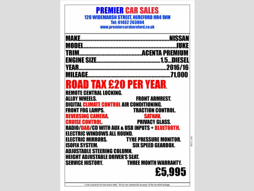 A great Nissan Juke with a nice specification and the added benefit of being only £20 per year for road tax. Remote Central Locking. Alloy Wheels. Privacy Glass. Electric Windows all round. Electric Mirrors. Traction Control. Tyre Pressure Monitor. Reversing Camera. ISOFIX System. Front Armrest. Six Speed Manual Transmission. Cruise Control with speed limiter option. Digital Climate Control Air Conditioning. Radio/DAB Radio/CD with AUX & USB Inputs + Bluetooth connection. SATNAV. Adjustable Steering Column. Front Fog Lamps. Height Adjustable Drivers Seat. We are at 120 Widemarsh Street, Hereford, HR4 9HN. Our website with full details is : www.premiercarshereford.co.uk, All of our vehicles are supplied with a three month warranty and long MOT. Card payments are welcomed and part exchanges are gladly considered. Low rate finance arranged, subject to status. Please call us on 01432263804 or 07831564655 for more information.