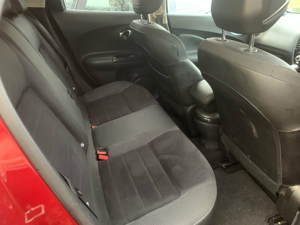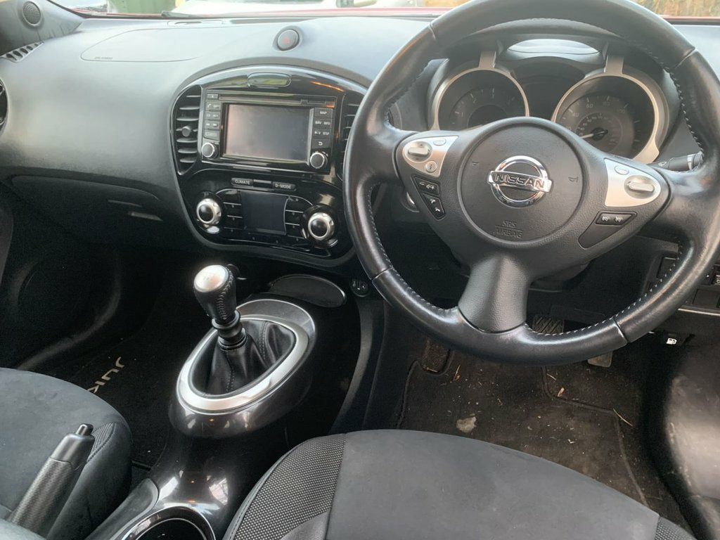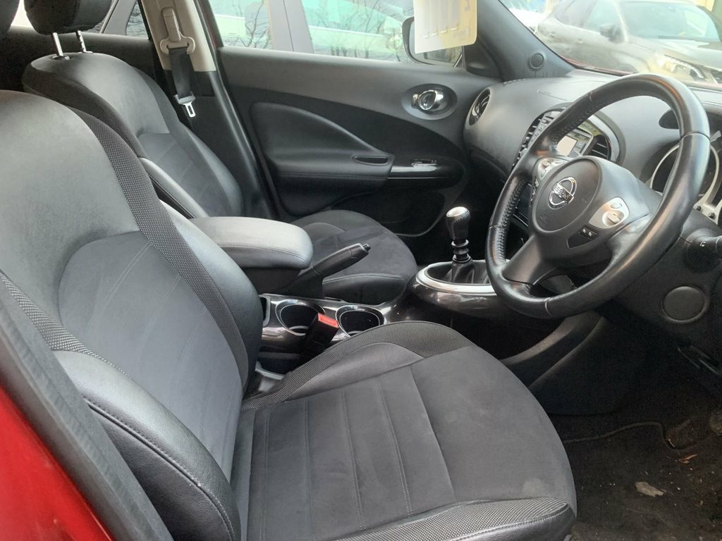 Nissan Juke DCI Bose Personal Edition in metallic red, has service history with 6 stamps in the book. Comes with sat navigation, 17" alloy wheels, air conditioning, electric windows in the front and rear, electric folding mirrors, push button start and keyless entry, rear parking sensors, reversing camera, half leather trim, auto lights and wipers, rear privacy glass, stop/start engine its a 6 speed, has bluetooth, touchscreen dab radio, aux port, usb, a multifunction steering wheel and 2 remote keys. THE CAR WILL HAVE A SERVICE AND 12 MONTHS MOT / PART EXCHANGE IS ALWAYS WELCOME / FREE 12 MONTH AA ROADSIDE RECOVERY INCLUDED / FINANCE IS AVAILABLE VIA OUR WEBSITE LINK / THE CAR HAS BEEN HPI AND MILEAGE CHECKED, ALL OK / WE ARE A FAMILY RUN BUSINESS AND HAVE BEEN TRADING FOR OVER 30 YEARS, WE OFFER DELIVERY IN MAINLAND UK (Please ask for details), WE ARE HERE TO HELP YOU! PLEASE CONTACT US WITH ANY QUESTIONS 12V Socket - Front, 16in Alloy Wheels - Aero Bi-Tone Black, 3 Adjustable Rear Head Restraints, 6 Airbags, 60-40 Split Rear Folding Seats, AM-FM-CD Audio System, Automatic Climate Control with Pollen Fi, Automatic Headlights - Dusk Sensor, AUX Socket for MP3 Player, Body Coloured Handles, BOSE Personal Sound System, Chrome Interior Door Handles, Colour Reversing Camera, Cruise Control with Speed Limiter, DAB Radio, Dark Chrome Grille, Door Mirrors with LED Indicators, Door-Boot Open Warning Light, Drive Computer with Temperature Gauge, Driver and Passenger Sun Visor with Vani, Electric Folding and Heated Door Mirrors, Electric Front Windows with Driver One-T, Engine Immobiliser, ESP ABS EBD a