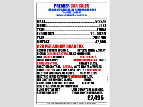 A nicely specified Juke that is definitely yellow! Great features with low mileage, a good service history and the added benefit of being only £20 per year to tax. Also ULEZ compliant. Remote Central Locking with two keys present. Keyless entry, exit and start. Alloy Wheels. 360° full colour camera system. Electric Windows all round. Electric Mirrors with powerfold facility. Privacy Glass. Stop/Start. Tyre Pressure Monitor. Traction Control System. Cruise Control with optional speed limiter. Full Leather Interior. LED Daytime Running Lamps. Heated Seats. ISOFIX System. Front Armrest. Adjustable Steering Column. Auto Lights. Auto Wipers. Front Fog Lamps. Digital Climate Control Air Conditioning. Six Speed Transmission. Radio/DAB Radio/CD/AUX & USB Inputs + Bluetooth Connection. SATNAV. Blind Spot Awareness. Lane Departure Warning. We are at 120 Widemarsh Street, Hereford, HR4 9HN. Our website with full details is : www.premiercarshereford.co.uk, All of our vehicles are supplied with a three month warranty and long MOT. Card payments are welcomed and part exchanges are gladly considered. Low rate finance arranged, subject to status. Please call us on 01432263804 or 07831564655 for more information.