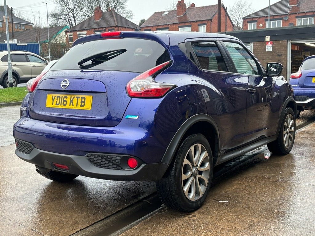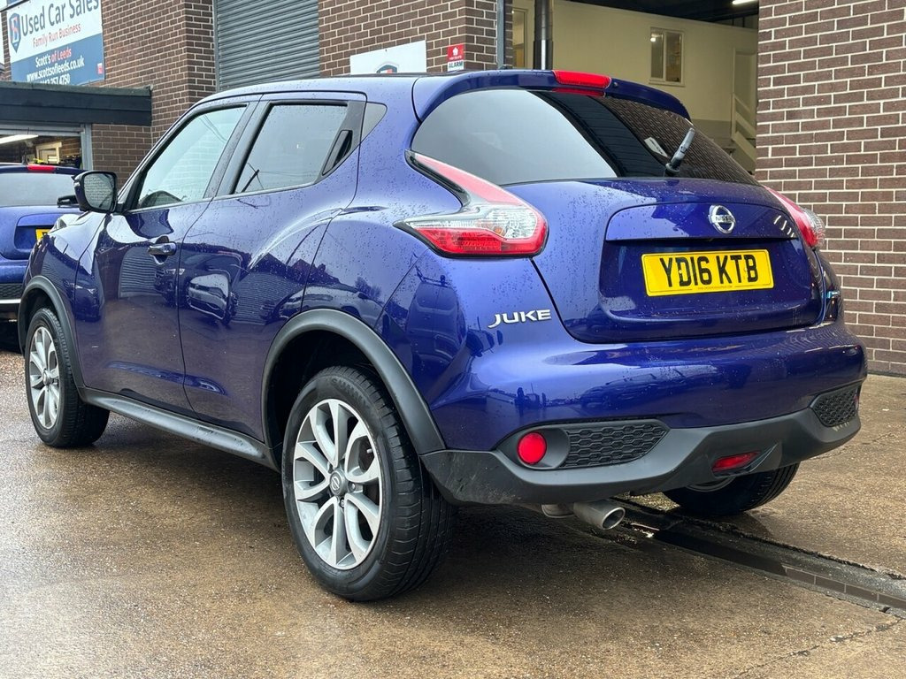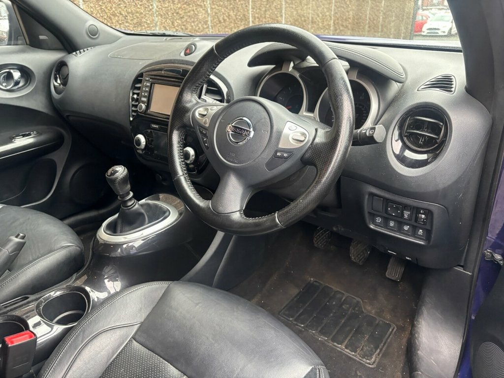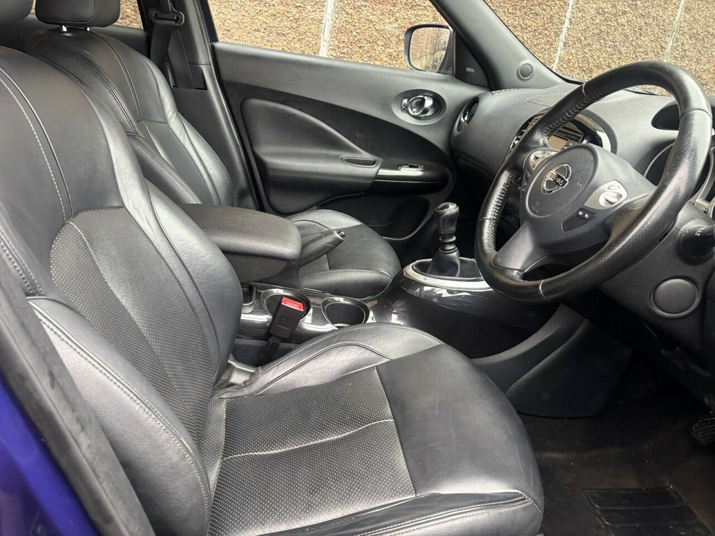 Scott's of Leeds used Car Sales are pleased to offer this NISSAN JUKE 1.5 dCi Tekna SUV 5 Door Diesel Manual in Blue. The car is in good condition throughout, in a lovely colour combination and a great specification including Satellite Navigation, Cruise control, Speed limiter, Bluetooth, DAB radio, CD player, reverse camera, Heated full leather seats, AUX and USB, privacy glass, automatic lights and wipers, alloy wheels, isofix, Keyless entry, Pushbutton start, and much much more. The car will be supplied with an up to date service record having just been serviced & new clutch and flywheel fitted in our Workshop, an MOT until February 2027 and 2 Keys ready to drive away. £20 Road Tax and great MPG. 3 MONTH NATIONWIDE WARRANTY provided with all vehicles. NATIONWIDE DELIVERY also available. A guaranteed 12 Months MOT can be added for an extra £100. DISCLAIMER: The above specification is true and correct. Any other specification listed elsewhere can sometimes be incorrect. Please check with Sales Executive to clarify this if needed prior to purchase. 12V Socket - Front, 17in Alloy Wheels - Urban, 2 Speed Wiper with Variable Intermittent, 3 Adjustable Rear Head Restraints, 60-40 Split Rear Folding Seats, AUX Socket for MP3 Player, Airbag - Driver, Airbag - Front Passenger, Airbags - Curtain, Airbags - Side, Armrest - Coloured Stitching to Matching, Automatic Climate Control with Pollen Fi, Automatic Lights and Wipers, Black Headliner, Body Coloured Handles, Body-Coloured Door Mirrors with LED Indi, Boot Capacity with Flexi-Floor Board, Chrome Interior Door Handles, Colour Reversing Camera, Cruise Control with Speed Limiter, DAB and Internet Radio with 6 Speakers, Drive Computer with Temperature Gauge, ESP ABS EBD and Brake Assist, Electri