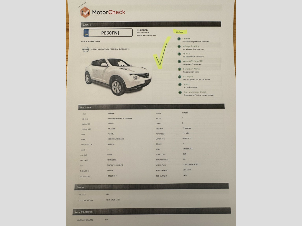 1 Lady Owner and the supplying Main Dealer, NISSAN JUKE 1.6 ACENTA PREMIUM Model, 10 Services and Just Serviced for you, 11 MONTHS MOT to 20th DECEMBER 2026 (No Advisories), , Excellent Condition Inside and Out, Lovely Clean Car, See The Video, Reversing Camera, SAT NAV, Bluetooth Handsfree, Cruise Control, Alloys, CD/Radio & AUX/USB Connection, Four Good Matching Bridgestone Tyres, Spare Key, Air Conditioning, High Spec Premium Model, , Part Exchange Welcome, 3 Months Nationwide Warranty at Advert Price, Full VOSA History Check, MotorCheck History Report, HPI Clear, Finance Arranged, , Power Steering, Remote Central Locking, with Spare Key, Multi Function Steering Wheel, AUX and USB, 12V Socket, Bluetooth Phone, Electric Windows x4, ISOFIX, , Plus a FREE Nationwide 3 MONTHS WARRANTY At Advert Price For Your Piece Of Mind Including AA Assistance, Extendable to 6 and 12 Months Warranties Available, PART EXCHANGE WELCOME, , All cars available to view in our indoor showroom, , SEE OUR GOOGLE REVIEWS and For More Cars Google Our Website Pennine Car Sales Pontefract, Open 7 Days, PLEASE CALL BEFORE TRAVELLING AS VIEWING BY APPOINTMENT, , Call ???? 07917 004363, More Cars at www.penninecarsales.co.uk