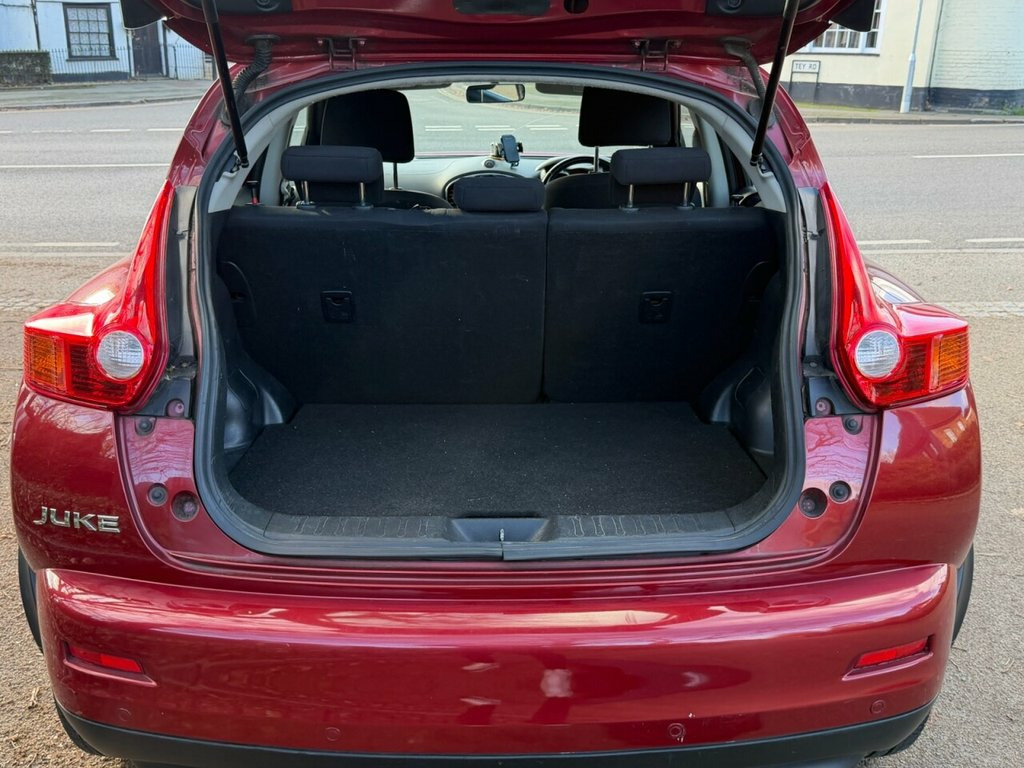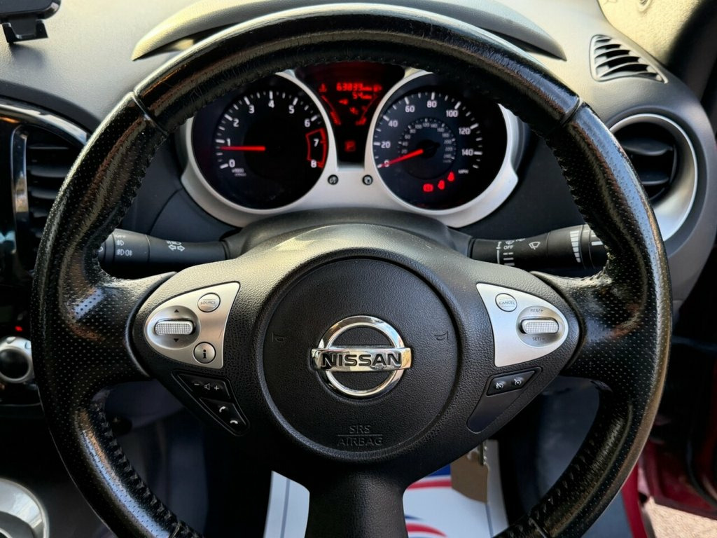 Here at Essex cars for less, we are pleased to offer this 2013 Nissan Juke 1.6 PETROL AUTO, finished in metallic red, and having covered just 63k miles from new! This ever popular car comes fully loaded with extras, including full electrics pack, air conditioning, climate control, multi function steering wheel, cruise control, Sat nav, reverse sensors and camera,alloy wheels ect. Comes with FSH, this car literally looks and drives like new thanks to the low mileage, and being the 1.6 petrol, gives nippy performance whilst still returning fantastic MPG. A great all round family car, offering great value!! Test drives and P/X welcome. all our vehicles come with minimum 6 Months MOT, fully valeted and with minimum 3 months warranty (subject to £99.00 administration fee). extended 6, 12, and 24 month warranties are available, please speak to one of our sales team for more information. Please note, every effort has been made to ensure the accuracy of the above information, but errors may occur. Please check with a salesperson. 12V Socket - Front, 17in Alloy Wheels - Sport, 3 Adjustable Rear Head Restraints, 60-40 Split Rear Folding Seats, ABS - Anti Lock Brakes, AUX-In Socket, Airbag - Driver, Airbag - Front Passenger, Airbags - Curtain, Airbags - Side, Bluetooth Telephone Integration, Body Coloured Door Mirrors, Body Coloured Handles, Brake Assist, Bumpers - Body Coloured, CD Radio with MP3 Playback, Chrome Exhaust Finisher, Chrome Interior Door Handles, Climate Control Air Conditioning, Cruise Control, Driver Seat Height Adjustment, EBD - Electronic Brakeforce Distribution, ESP - Electronic Stability Programme, Electric Door Mirrors, Electric Speed-Sensitive Power Steering, Engine Immobiliser, Front Cupholders x