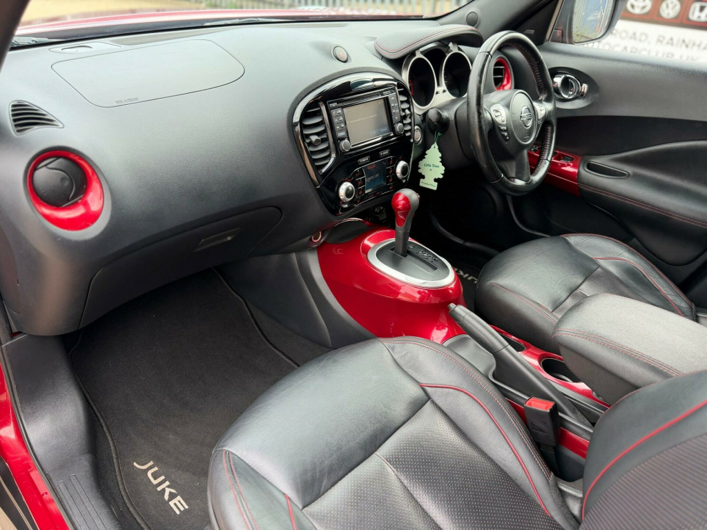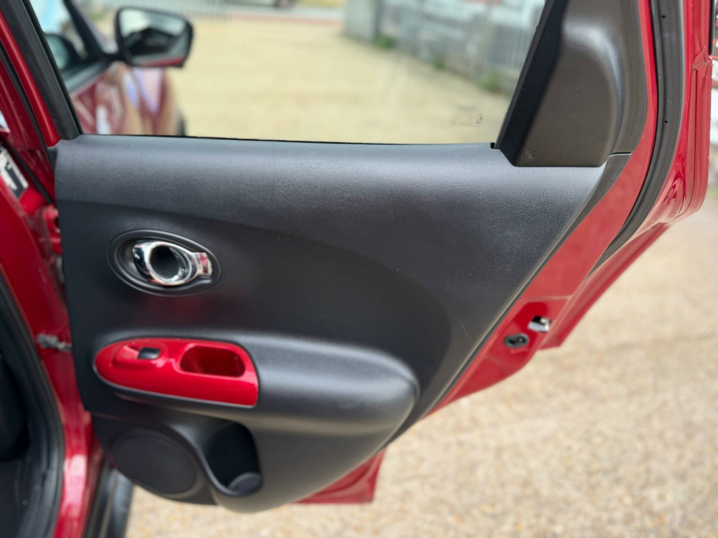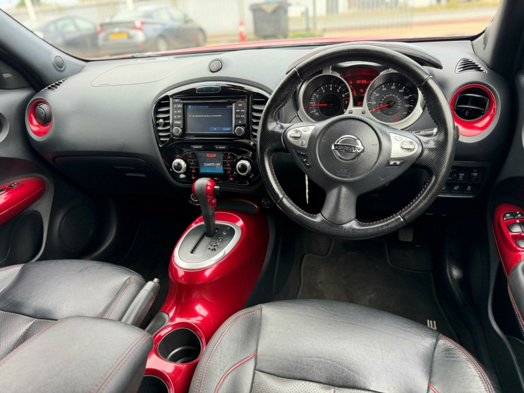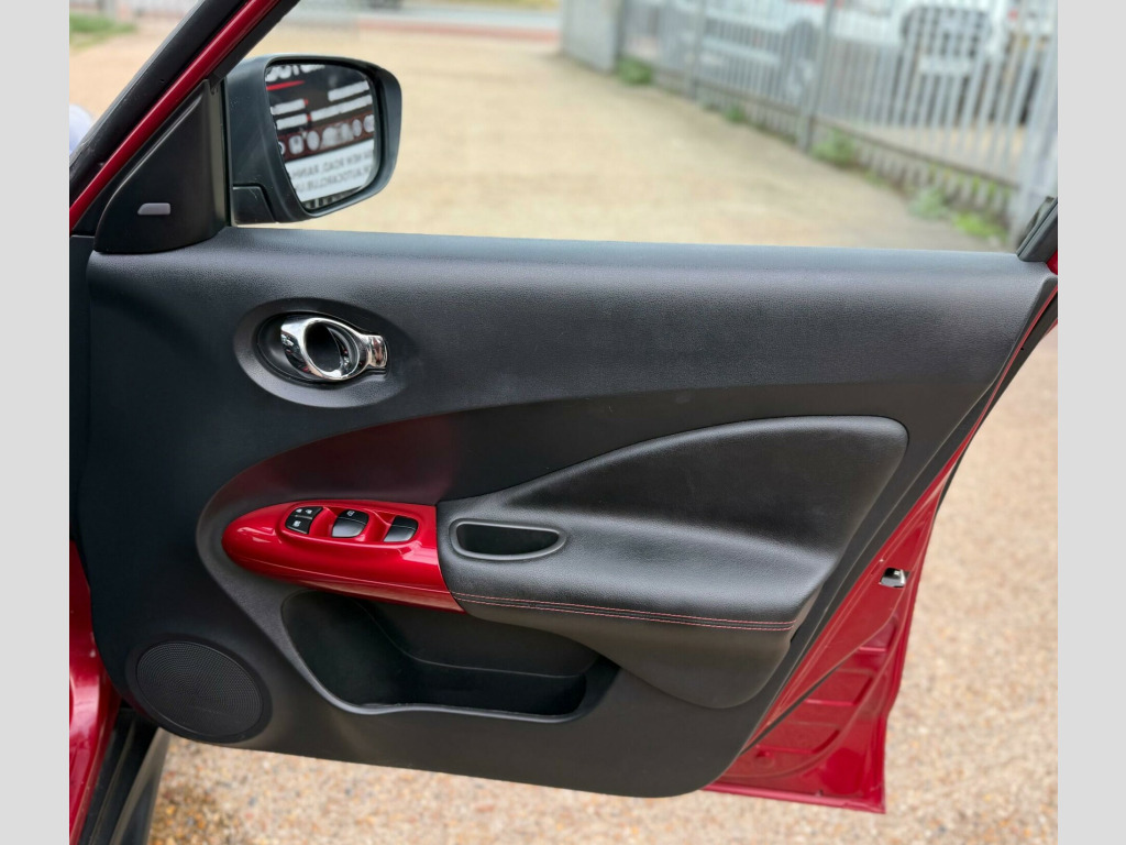 Discover this exceptional 2017 Nissan Juke Tekna, boasting an incredibly low mileage of just 30,000 miles, making it a standout choice for its age. This Euro 6 compliant 1.6 litre petrol model offers a compelling blend of style and practicality. Inside, you'll find premium black leather upholstery complemented by a striking red centre console, enhancing the cabin's modern feel. The Tekna trim also includes a Black Exterior Plus Pack for added visual appeal.This Juke Tekna is equipped with a comprehensive Safety Pack, featuring Blind Spot Assistance and a 360 degree camera for confident manoeuvring. Enjoy the comfort of heated front seats and the convenience of Bluetooth integration for seamless phone connectivity. The Intelligent Key with Start Push Button allows for keyless entry and ignition. With an impressive fuel economy of 47 mpg and a low insurance group, this Nissan Juke represents excellent value and efficiency compared to other vehicles in its class. v socket - front, 17in alloy wheels - urban, 2 speed wiper with variable intermittent, 3 adjustable rear head restraints, 60-40 split rear folding seats, aux socket for mp3 player, airbag - driver, airbag - front passenger, airbags - curtain, airbags - side, armrest - coloured stitching to matching centre console, automatic climate control with pollen filter, automatic lights and wipers, black headliner, body coloured handles, body-coloured door mirrors with led indicators, boot capacity with flexi-floor board, chrome interior door handles, colour reversing camera, cruise control with speed limiter, dab and internet radio with 6 speakers, drive computer with temperature gauge, esp abs ebd and brake assist, electric folding and heated door mirrors, engine immobiliser, front armrest, front cupholders x2, front door pockets with drinks bottle holders, front fog lights, front map reading lights, front seat belt height adjustment, front seat belts with load limiter and pretensioners, front and rear electric windows, gear shift indicator, glovebox, height adjustable driver seat, isofix child seat anchoring points, intelligent key with start push button, led signature daytime running lights, leather steering wheel and gear knob, nissan dynamic control system, nissanconnect, passenger airbag cut-off switch, power assisted steering - speed sensitive, puncture repair kit, rear door child locks, rear privacy glass, rear tonneau cover integrated into tailgate, rear wiper with intermittent, safety pack, seats - heated front, steering wheel mounted audio controls, tpms - tyre pressure monitoring system, telephone - bluetooth integration, tilt adjustable steering wheel, traction control, usb port, premium leather - black with red centre console and black exterior plus pack