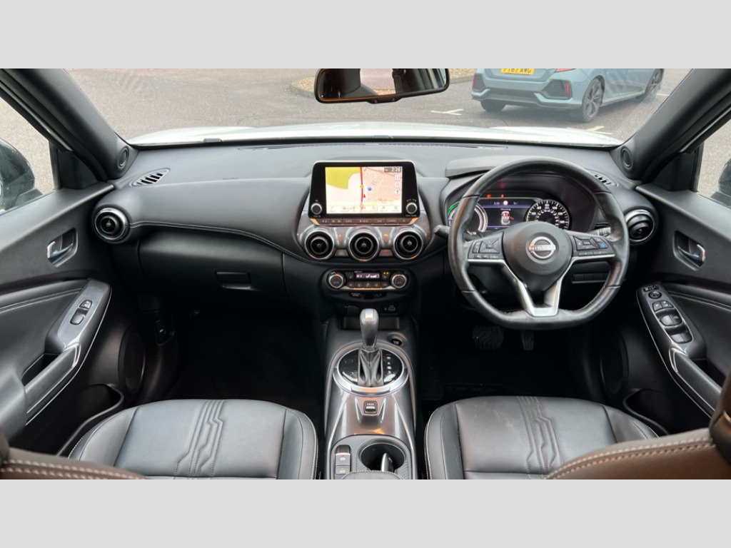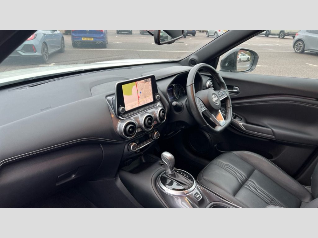Nissan Juke 1.6 Hybrid Tekna 5dr Auto 7" full colour TFT screen combimeter, Apple CarPlay and Google Android auto, Drive modes select (Eco, normal and sport), e-Pedal step, Emergency and breakdown call, EV mode selector, Front parking sensor, Intelligent lane intervention, Lane departure warning system, Nissan connect 8" touch screen entertainment system, Nissan connect nav with TomTom traffic, Nissan connect services and Wifi connection, Outside temperature sensor, Power Steering, Rear parking sensor, Traffic sign recognition, Trip computer, Voice recognition, Gasoline particulate filter, 10 Bose speakers 6 speakers and 2 headrest speakers for driver/passenger seats, Bluetooth system, USB, Aux-in and 12V socket, Bose personal sound stage control, DAB Digital radio, Rear console USB port, Auto dimming interior rear view mirror, Auto headlights, Automatic hazard signal with emergency stop signal, Body colour bumpers, Body colour door handles, Electrically adjustable door mirrors with integrated indicators, Follow me home headlights, Front and rear electric window with one touch driver window, Heated and auto folding door mirrors, High beam assist, LED 3rd brake light, LED daytime running lights, LED front fog lights, LED headlamps, LED rear fog lamp, LED rear lamps, Rain sensor windscreen wipers, Rear privacy glass, Rear side wing doors, Rear wiper, Roof spoiler, Shark fin roof antenna in Pearl Black, Thermaclear heated windscreen, Three blink turn signal, 3 height adjustable rear headrests, 3 seat bench in 2nd row, 60/40 split folding rear seat, Automatic climate control, Card holder on driver sunvisor, Door ambient lighting, Driver and passenger sliding and reclining seats, Driver seat back pocket, Driver side rear coat hanger, Driver/passenger sunvisors and vanity mirrors, Front and rear cabin lights, Front armrest, Front door pockets with bottle holders, Front head restraints, Front passenger isofix child seat anchorage point, Front/rear passenger grab handles, Gear console ambient circle lighting, Grey synthetic leather kneepad, Heated front seats, Height adjustable driver's seat, Height adjustable passenger seat, Internal chrome door handles, Leather gearshift knob, Leather steering wheel, Luggage board, Luggage space lighting, Monoform sporty seats, Multifunction steering wheel, Passenger seat back pocket, Rear door bottle holders, Single front passenger seat, Steering wheel mounted gearshift paddles, Synthetic leather upholstery, Telescopic steering wheel adjustment, Two cupholders in front centre console, Two rear isofix child seat anchorage points with top tether, Welcome light and console tray ambient lighting, ProPilot pack - Juke, ABS with EBD and brake assist, Active ride control, Active Trace Control, Driver and passenger airbags, Driver and passenger side airbags, Electric handbrake with auto hold function, Electronic Stability Programme (ESP), Front and rear curtain airbags, Height adjustable seatbelts, Hill start assist, Intelligent emergency braking with pedestrian and cyclist recognition, Rear door child safety locks, Seatbelt reminder for driver/front passenger and rear seats, Single tone horn, Three 3 point rear seatbelts, Traction control, Tyre pressure monitoring system, VDC Dynamic Vehicle Control, Ventilated rear brake discs, Alarm, Immobiliser, Intelligent key and start push button with walk away lock and approach unlock functions, Remote central locking