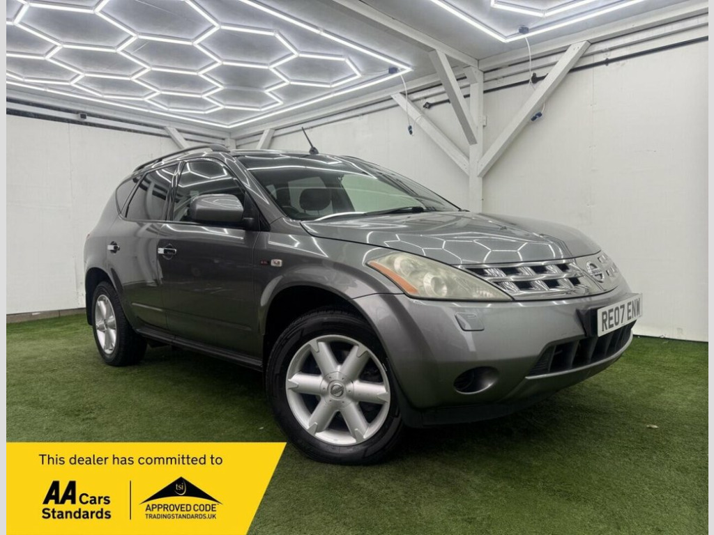 An excellent example of the refined and powerful Nissan Murano 3.5 V6 CVT, finished in an elegant grey exterior. This spacious SUV delivers smooth and responsive V6 petrol performance, paired with a seamless CVT automatic transmission for relaxed driving. With its comfortable ride, generous interior space, and distinctive styling, it?s ideal for families or drivers seeking a well-equipped, capable SUV with strong performance and everyday practicality. Key Features Include: Sunroof Reverse camera Cruise Control Navigation Bluetooth connectivity Air conditioning Alloy wheels Electric windows This vehicle comes with 5 doors, 5 seats, and has covered 69,266 miles. It was first registered in 2007, runs on Petrol, and features an Automatic gearbox. The car is HPI clear, ULEZ compliant, and comes with a valid MOT until November 2026. Service history included. Please Note: This vehicle is sold as seen on a trade sale basis and does not come with a warranty, making it suitable for trade buyers or customers seeking a budget-friendly deal. However, you can choose to purchase an extended warranty of up to 3 years through us, provided by our trusted premium warranty partner, for added peace of mind. What?s Included: 1 year of free AA breakdown cover Part exchange welcome Drive-away insurance, extended warranties, and servicing available at additional costs We also offer nationwide delivery at an additional cost?have the car delivered directly to your door, or visit our dealership