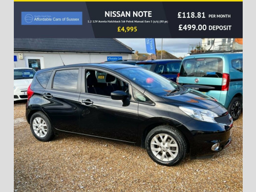 A great value Nissan Note Acenta finished in Pearl Black with alloy wheels. With a low insurance group, great fuel economy and only £20 a year tax band this is a cost effective car to own and comes well equipped with air conditioning, bluetooth connectivity, electric windows and mirrors and more. Top 5 Reasons to buy this car; 1; Good Service History 2; Bluetooth Connectivity 3; £20 Annual Road Tax 4; Free Warranty included with no admin or hidden fee's - Fully transparent sales process 5; Bought from a local trusted family Dealer with over 60+ years experience Pearl Black, 15in Alloy Wheels, 60-40 Split Rear Folding Seats, ABS - Anti Lock Brakes, Air Conditioning, Airbag - Driver, Airbag - Front Passenger, Airbags - Curtain, Airbags - Side, Alarm, Bluetooth Telephone Integration, Body Coloured Handles, Body Coloured Side Mouldings, Body Coloured Wing Mirrors with Integrat, Brake Assist, Bumpers - Body Coloured, CD Radio, Chrome Front Lip and Trunk Finisher Stri, Cruise Control with Speed Limiter, Daytime Running Lights, Driver Seat Height Adjustment, EBD - Electronic Brakeforce Distribution, ESP - Electronic Stability Programme, Eco Driving Mode, Eco Meter, First Aid Kit, Flexi-Board Boot Storage System, Front Cabin and Luggage Compartment Ligh, F