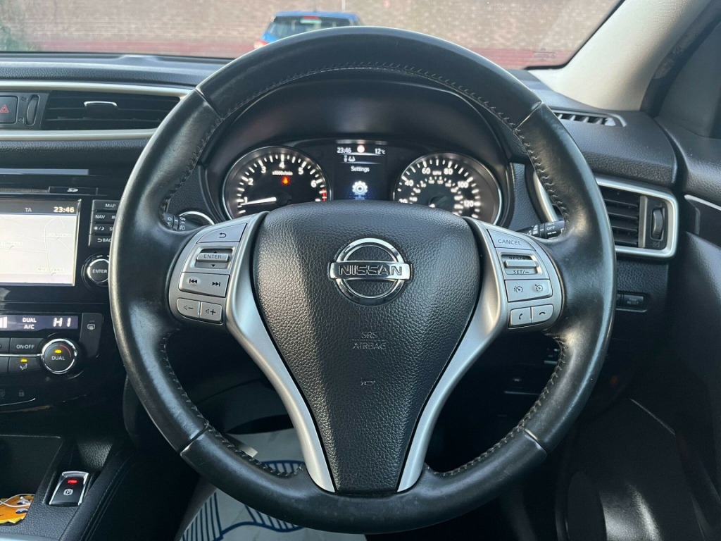 This 2015 Nissan Qashqai DIG-T n-tec is presented with a clear vehicle history check and will come with a full 12 months MOT for your peace of mind. This popular model features a 1.2 litre petrol engine and the n-tec trim level, offering a blend of style and practicality. Navigating tight spaces is made effortless thanks to the Around View Monitor, which provides a 360 degree bird's eye view of your surroundings, complemented by front and rear parking sensors and a rear parking camera. The convenience of Intelligent Key allows for keyless entry, while automatic headlights ensure you always have optimal visibility.This Nissan Qashqai DIG-T n-tec stands out with its impressive fuel economy, achieving up to 50 miles per gallon, and benefits from low CO2 emissions, making it an economical choice. Its low insurance group rating further enhances its appeal as a cost effective vehicle to own and run. These highlights demonstrate how this Qashqai offers a superior ownership experience compared to other vehicles in its class.. 18in Alloy Wheels - Diamond Cut, 6 Speakers, 60-40 Split Rear Folding Seats, ABS - Anti Lock Brakes, AUX-In Socket, Airbag - Driver, Airbag - Passenger, Airbags - Curtain, Airbags - Side, Alarm, Armrest - Rear, Around View Monitor - 360 Bird-View, Auto Dimming Rear View Mirror, Auto Rain Sensing Wipers, Black Honeycomb Front Grille, Body Coloured Handles, Brake Assist, Bumpers - Body Coloured, Chrome Glass Surround, Climate Control - Dual Zone, Cruise Control with Speed Limiter, DAB Radio, Door Mirrors - Body Coloured, Door Mirrors - Power Fold and Heated, Driver Seat Height Adjustment, EBD - Electronic Brakeforce Distribution, ESP - Electronic Stability Programme, Electric Speed-Sensitive Power Steering, Front Armrest, Front Collision Avoidance, Front Fog Lights, Front and Rear Electric Windows, Head Restraints - Active Front, Head Restraints - Rear, Headlights - Auto, Headlights - Auto High-Low Beam, Hill Start Assist, ISOFIX Childseat Anchorage Points - Middle Row Outer Seats, Immobiliser, Intelligent Key, Interior Ambient Lighting, LED Daytime Running Lights, Lane Departure Warning, Leather Gear Knob, Leather Steering Wheel, Luggage Board System, Lumbar Support, Parking Sensor - Front, Pollen Filter, Puncture Repair Kit, Push Start-Stop Button, Radio-CD, Rear Cupholder, Rear Door Child Locks, Rear Parking Sensor, Rear Privacy Glass, Satellite Navigation - Nissan Connect, Smart Vision Pack, Speed-Sensitive Autolock Function, Steering Wheel Mounted Audio Controls, TPMS - Tyre Pressure Monitoring System, Telephone - Bluetooth Integration, Tilt and Telescopic Adjustable Steering Wheel, Touch Screen 7in, Traction Control, Traffic Sign Recognition, Trip Computer, USB Port, e-PKB - Electric Parking Brake.