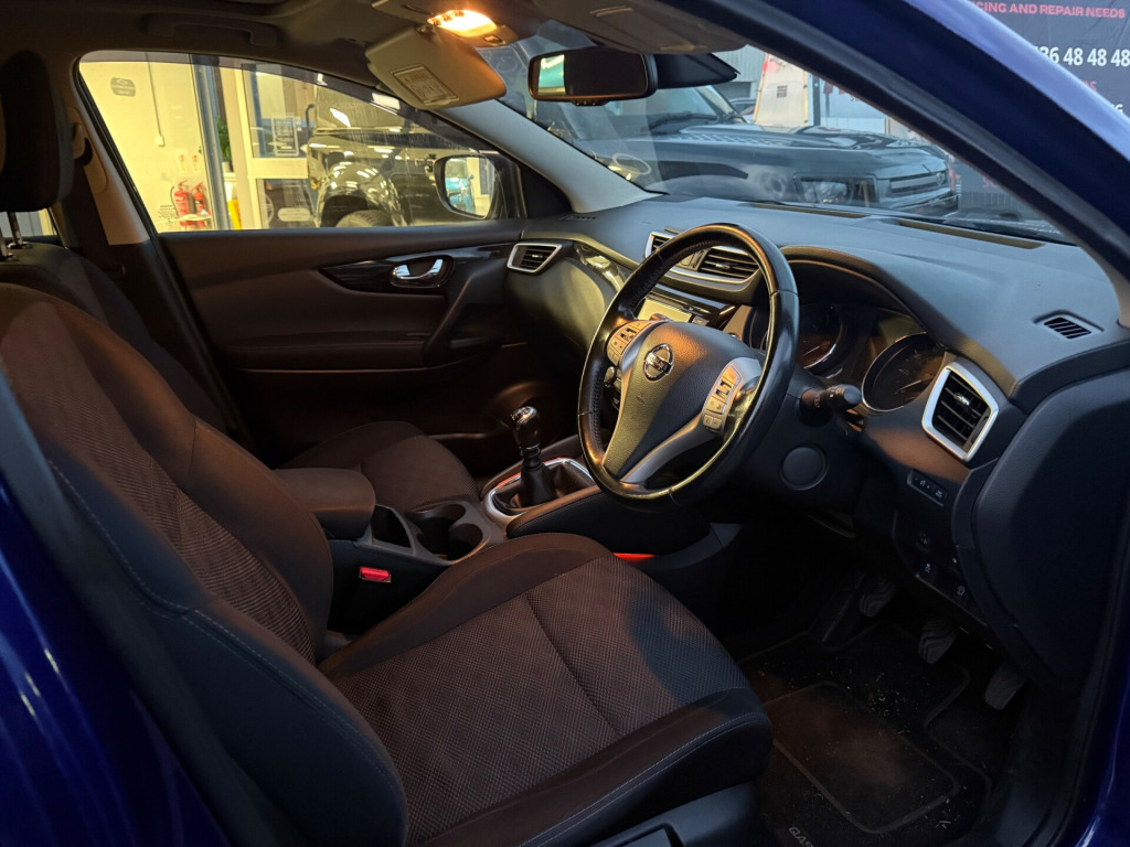 This 2015 Nissan Qashqai 1.2 DIG-T n-tec+ SUV with a manual transmission and 65070 miles on the clock is the perfect family car, with 5 seats and 5 doors. Running on petrol and Euro 6 compliant, it is ULEZ friendly. The sleek SUV boasts 18in Alloy Wheels, a Black Honeycomb Front Grille, Body Coloured Handles, Bumpers, and Chrome Glass Surround, making it a stylish and practical choice for any driver. Whether navigating city streets or country roads, this Qashqai offers a smooth and efficient ride, and with its spacious interior and modern features, it's the ideal vehicle for any adventure., in alloy wheels - diamond cut, black honeycomb front grille, body coloured handles, bumpers - body coloured, chrome glass surround, door mirrors - body coloured, door mirrors - power fold and heated, front and rear electric windows, panoramic glass roof, puncture repair kit, rear privacy glass, roof rails - satin, 6 speakers, aux-in socket, dab radio, radio-cd, satellite navigation - nissan connect, telephone - bluetooth integration, touch screen 7in, usb port, 60-40 split rear folding seats, armrest - rear, auto dimming rear view mirror, auto rain sensing wipers, climate control - dual zone, driver seat height adjustment, front armrest, head restraints - active front, head restraints - rear, interior ambient lighting, leather gear knob, leather steering wheel, luggage board system, lumbar support, pollen filter, push start-stop button, rear cupholder, seats - passengers height adjustment, steering wheel mounted audio controls, tilt and telescopic adjustable steering wheel, abs - anti lock brakes, airbag - driver, airbag - passenger, airbags - curtain, airbags - side, alarm, brake assist, ebd - electronic brakeforce distribution, esp - electronic stability programme, front collision avoidance, hill start assist, isofix childseat anchorage points - middle row outer seats, immobiliser, intelligent key, rear door child locks, smart vision pack, speed-sensitive autolock function, traction control, e-pkb - electric parking brake, around view monitor - 360 bird-view, colour side camera, cruise control with speed limiter, electric speed-sensitive power steering, lane departure warning, parking sensor - front, rear parking sensor, tpms - tyre pressure monitoring system, traffic sign recognition, trip computer, front fog lights, headlights - auto, headlights - auto high-low beam, led daytime running lights